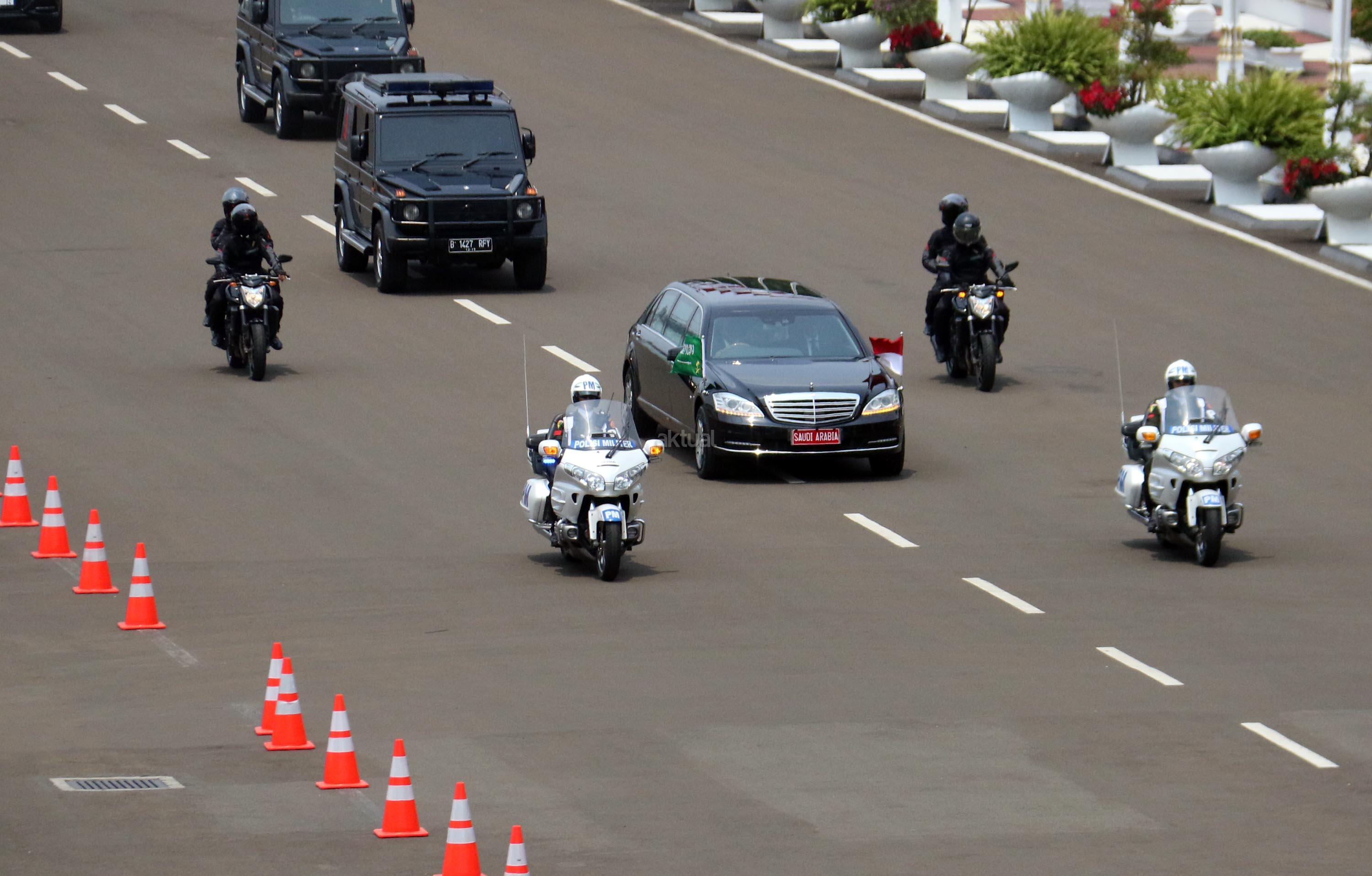 Iring-iringan kendaraan Raja Arab Saudi Salman bin Abdulaziz al-Saud di Kompleks Parlemen, Senayan, Kamis (2/3). Raja Arab Saudi, Salman Bin Abdulaziz al Saud menyampaikan pidato sekitar 10 menit di depan para wakil rakyat dan sejumlah tokoh dan undangan yang hadir. AKTUAL/Tino Oktaviano