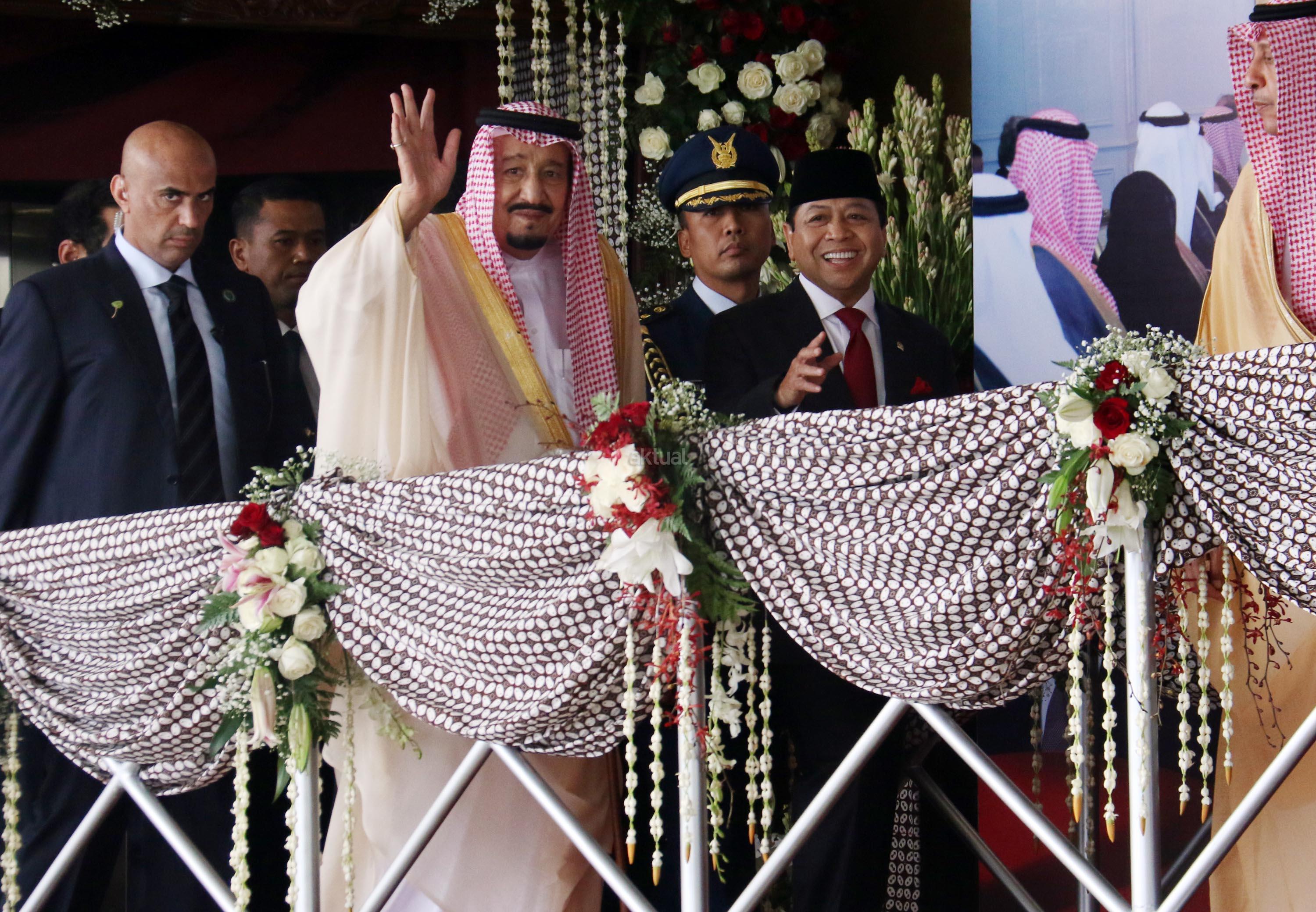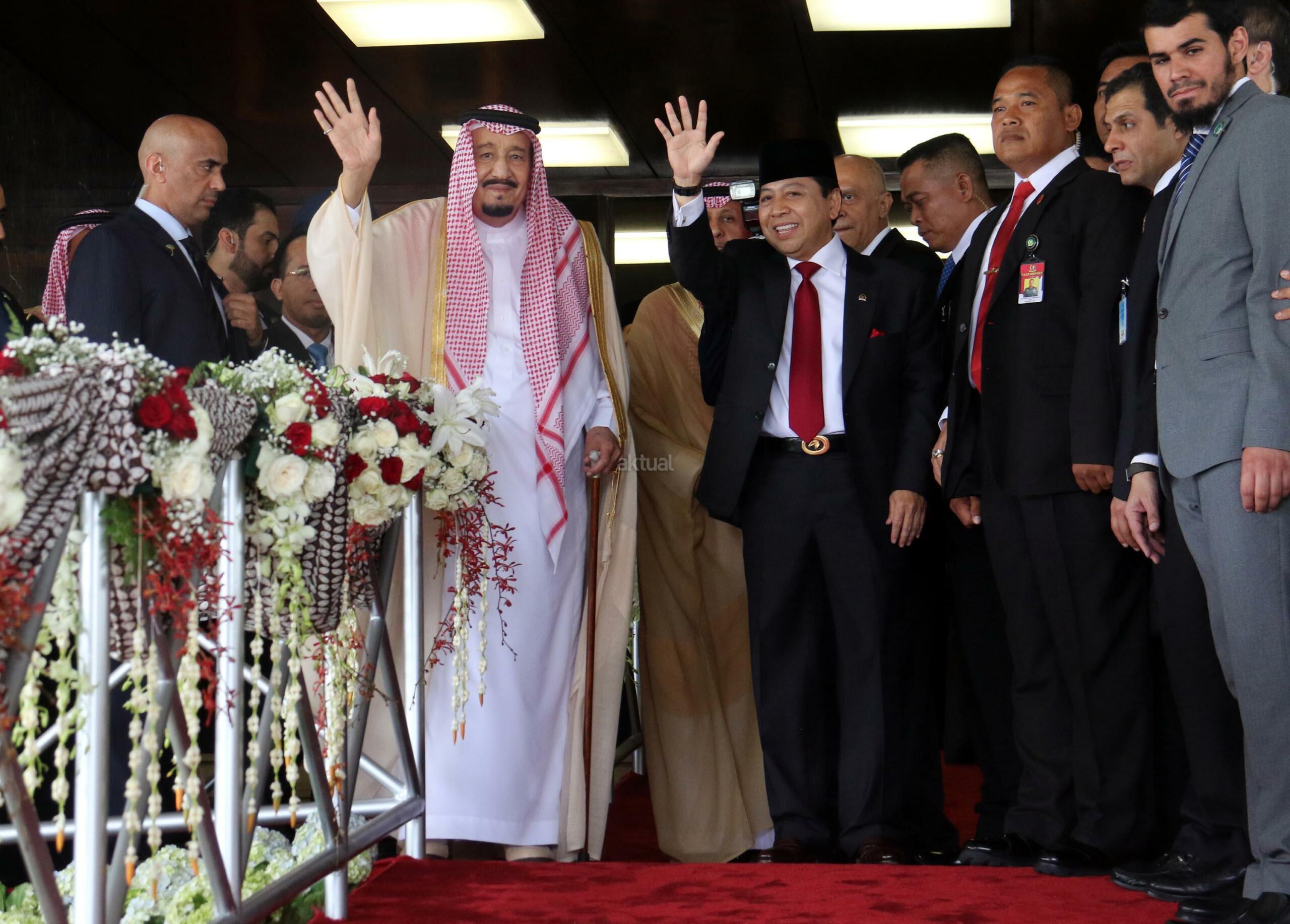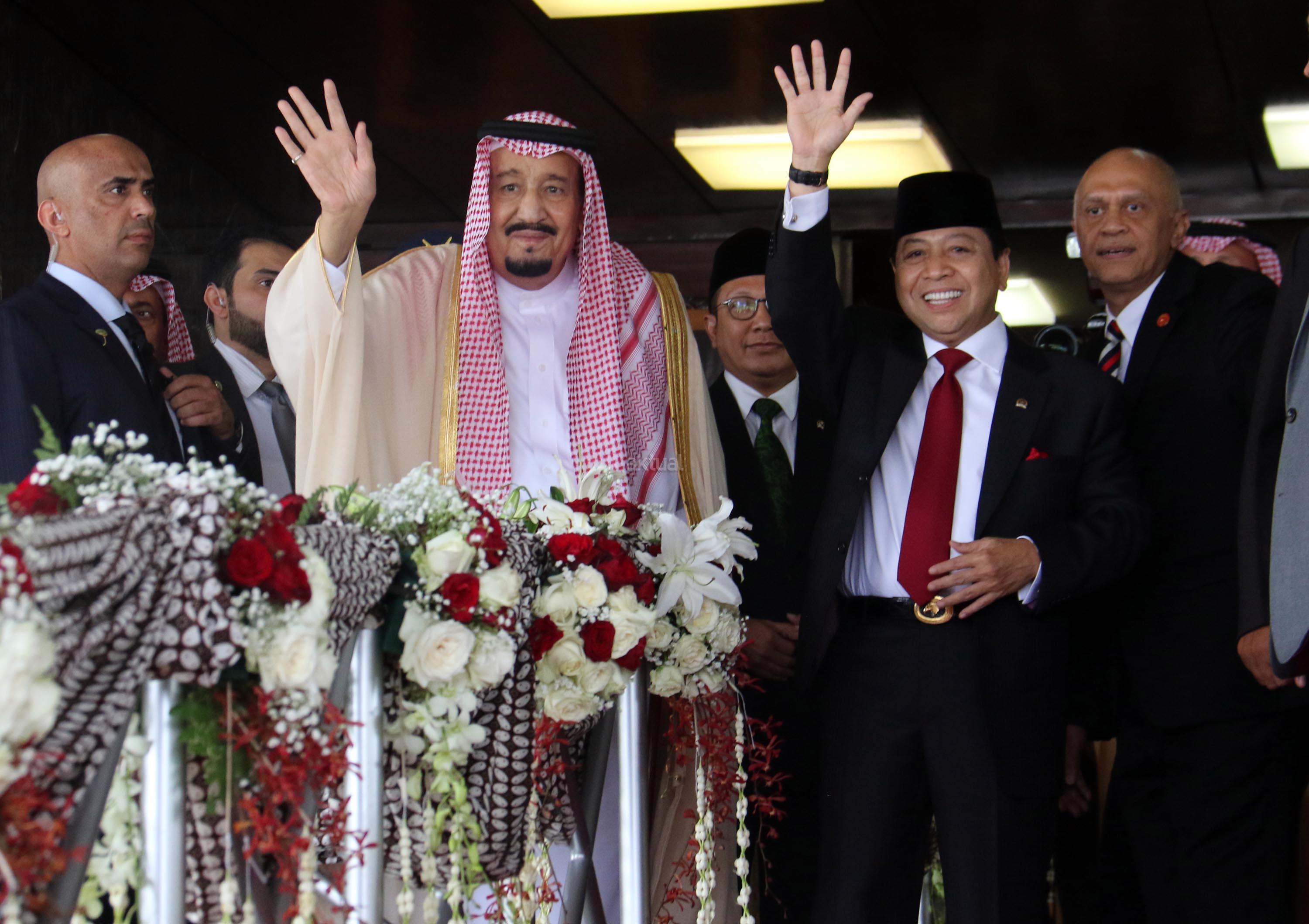 Raja Arab Saudi Salman bin Abdulaziz al-Saud didampingi Ketua DPR Setya Novanto melambaikan tangan saat berkunjung di Kompleks Parlemen, Senayan, Kamis (2/3). Raja Arab Saudi, Salman Bin Abdulaziz al Saud menyampaikan pidato sekitar 10 menit di depan para wakil rakyat dan sejumlah tokoh dan undangan yang hadir. AKTUAL/Tino Oktaviano