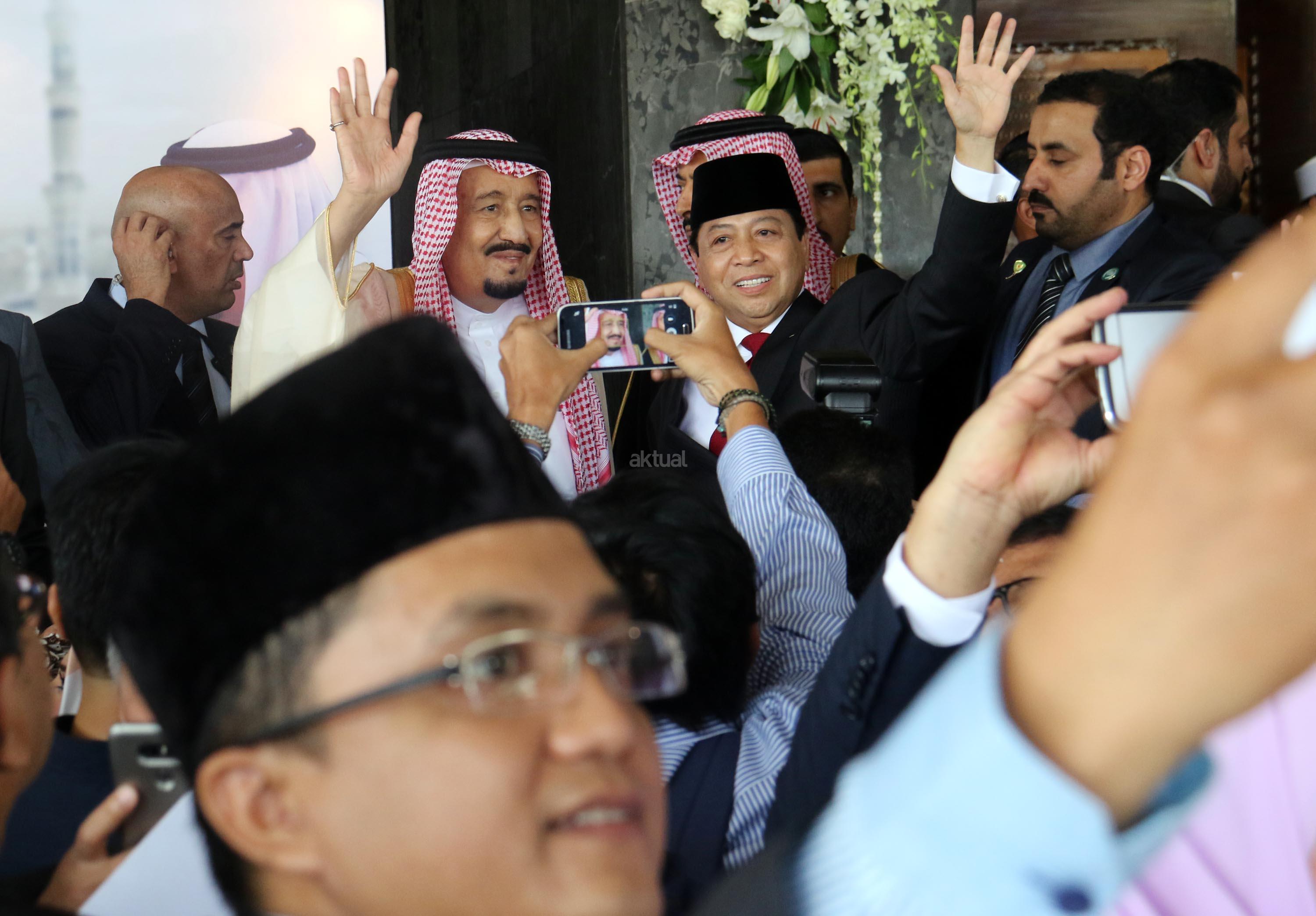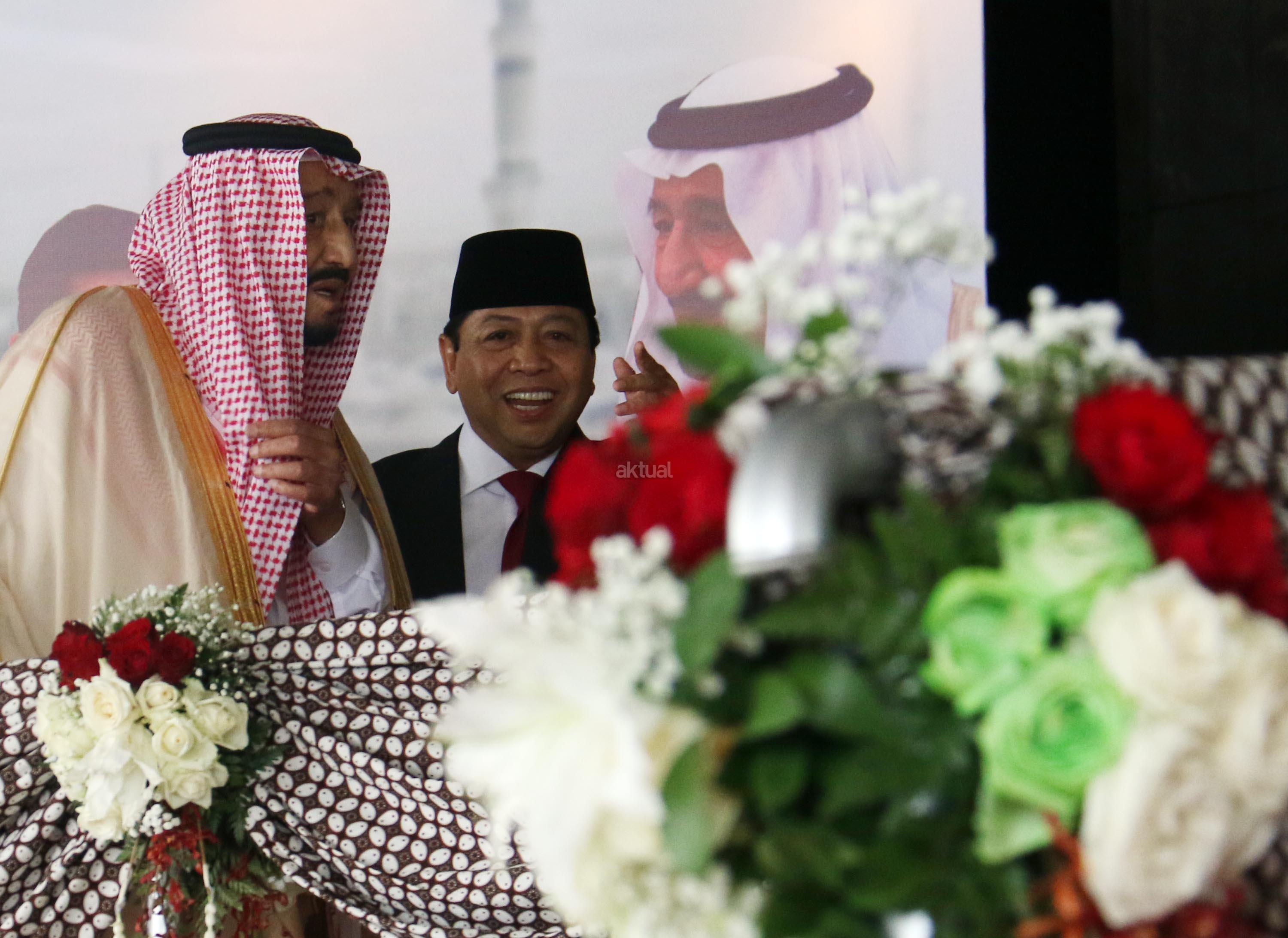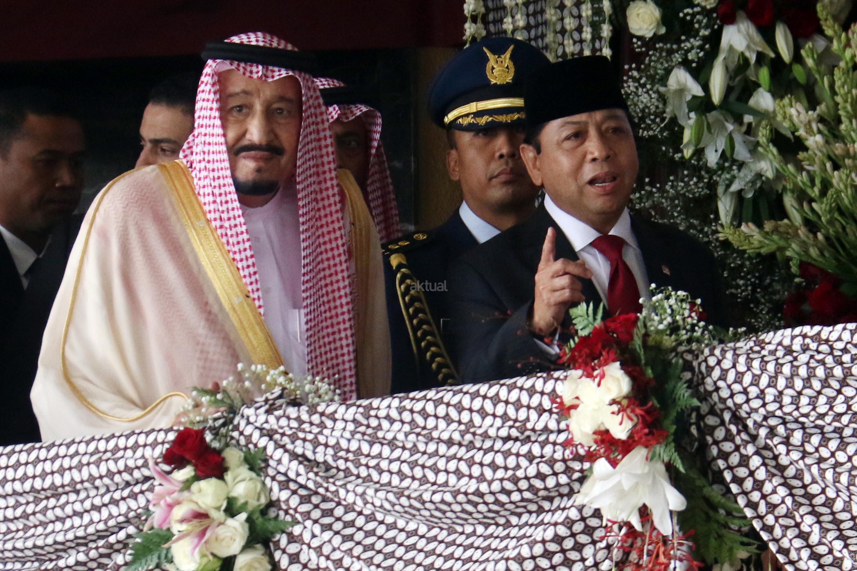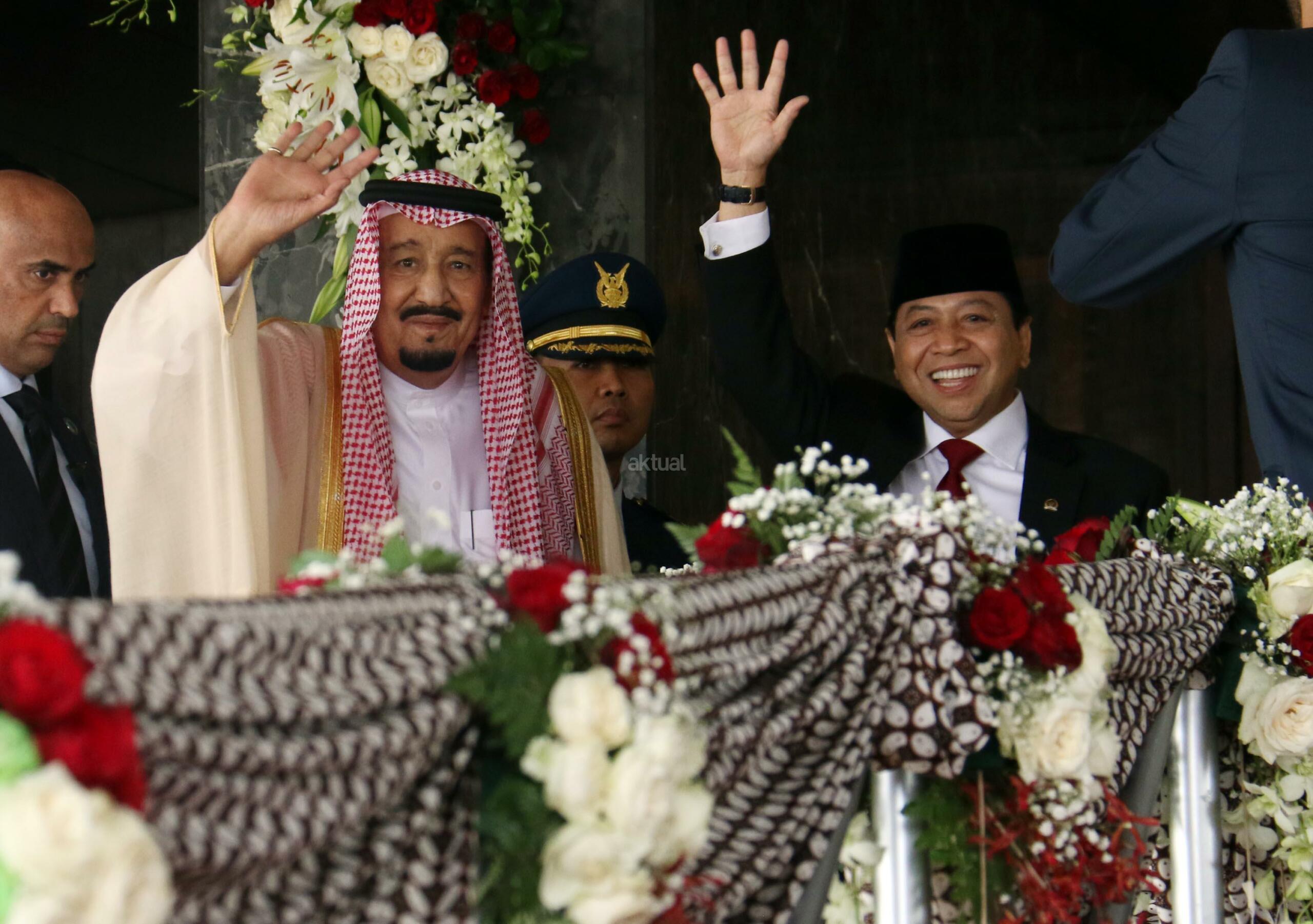 Raja Arab Saudi Salman bin Abdulaziz al-Saud didampingi Ketua DPR Setya Novanto melambaikan tangan saat berkunjung di Kompleks Parlemen, Senayan, Kamis (2/3). Raja Arab Saudi, Salman Bin Abdulaziz al Saud menyampaikan pidato sekitar 10 menit di depan para wakil rakyat dan sejumlah tokoh dan undangan yang hadir. AKTUAL/Tino Oktaviano