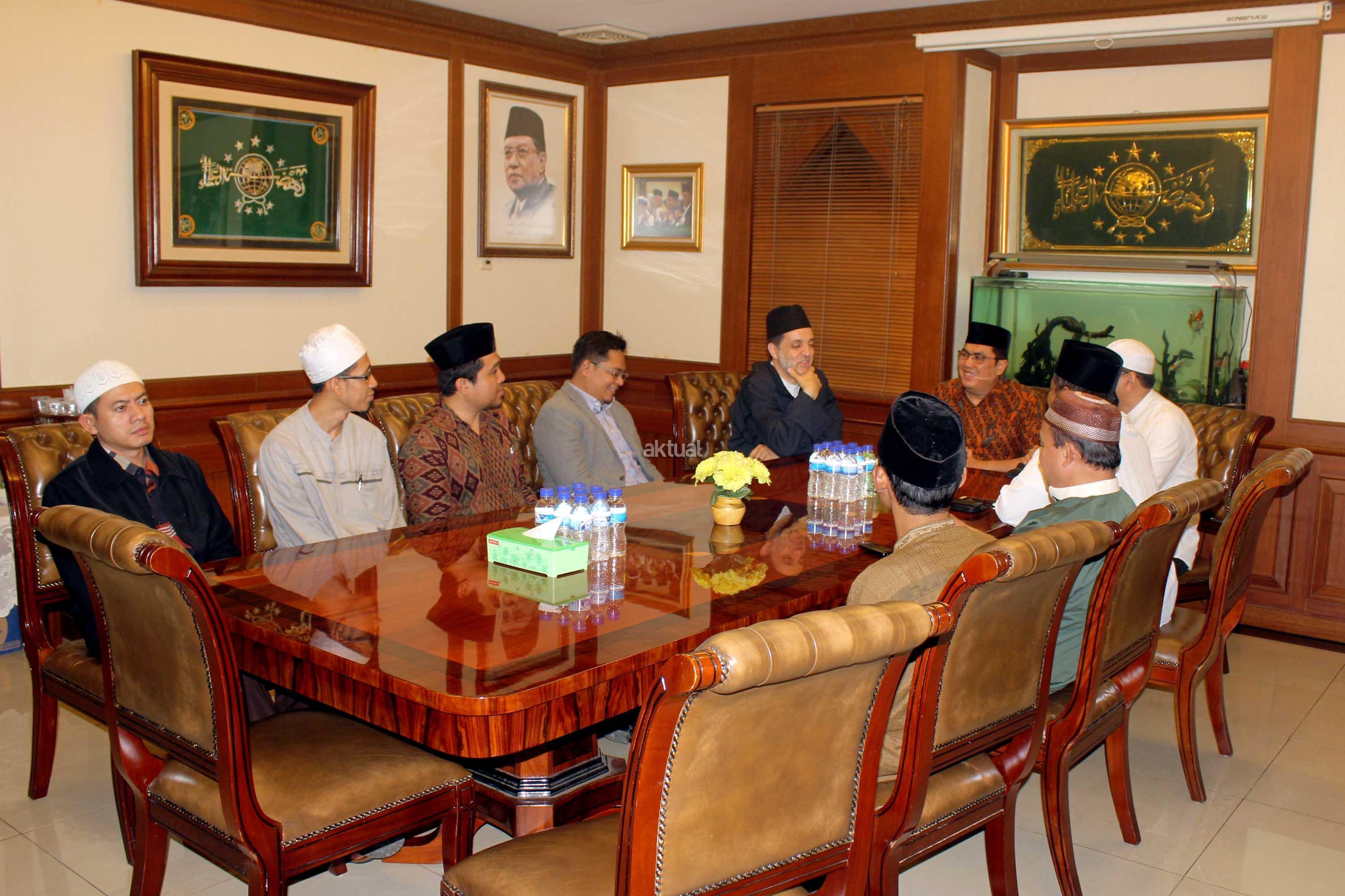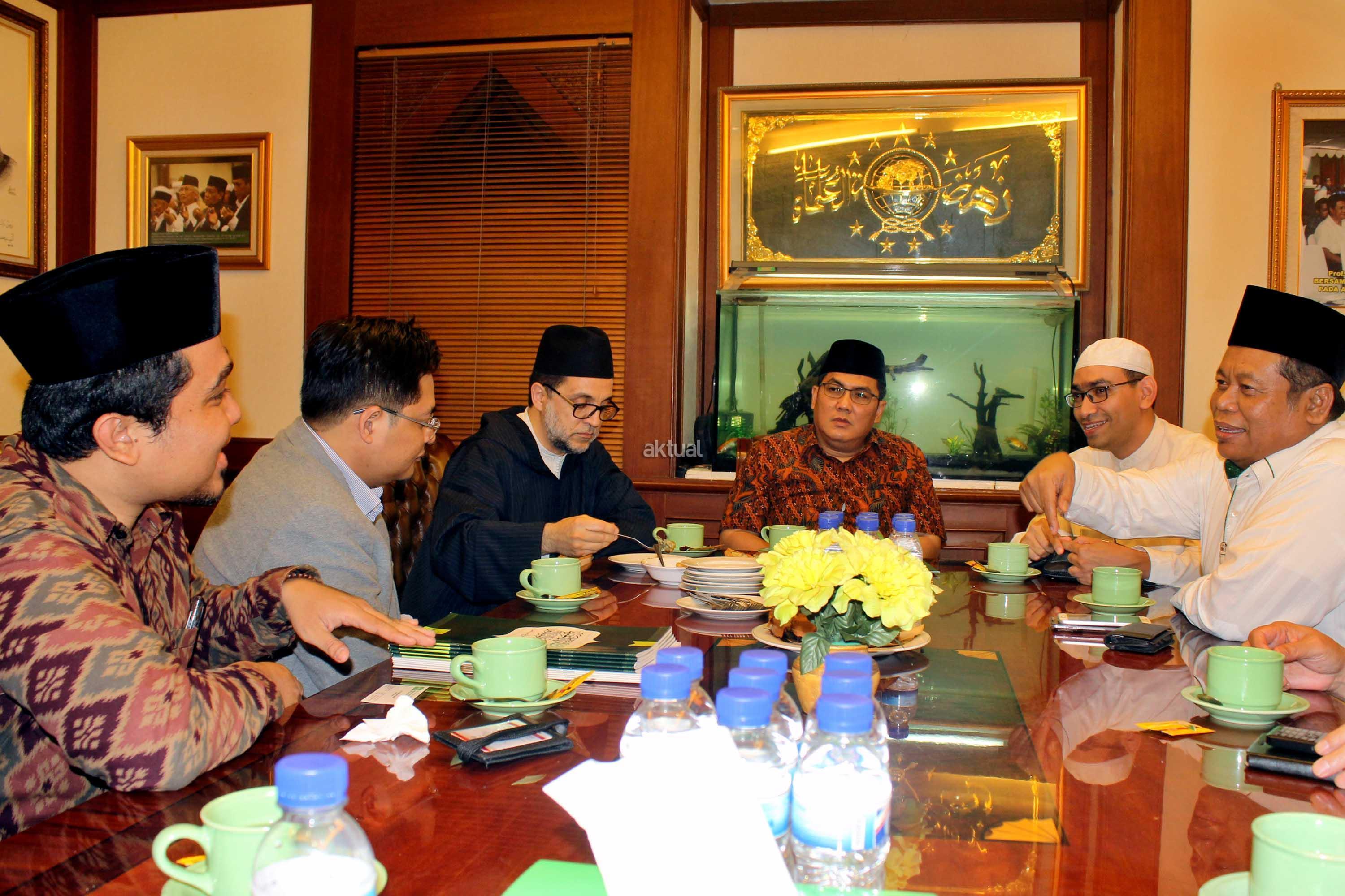 Syekh Abdul Mun,iem bin Abdul Azis bin Muhammad Shidiq Al Ghumary Al Hasani didampingi Khodim Zawiyah Arraudhah Al Akh Muhammad Danial Nafis bertemu Sekjen PBNU Helmi faizal Zaeni di Kantor PBNU, Jalan Kramat Raya, Jakarta, Selasa (2/5). Sebelum berkunjung ke PBNU, Syekh Abdul Mu’iem mengisi Seminar Nasional bertajuk “Peran Keluarga Ghumari dalam membentengi Sunnah Nabawiyah” di Aula Prof. Dr. Partosentono, Fakultas Ushuluddin Universitas Islam Negeri Syarif Hidayatullah, Ciputat, Banten. AKTUAL/Warnoto