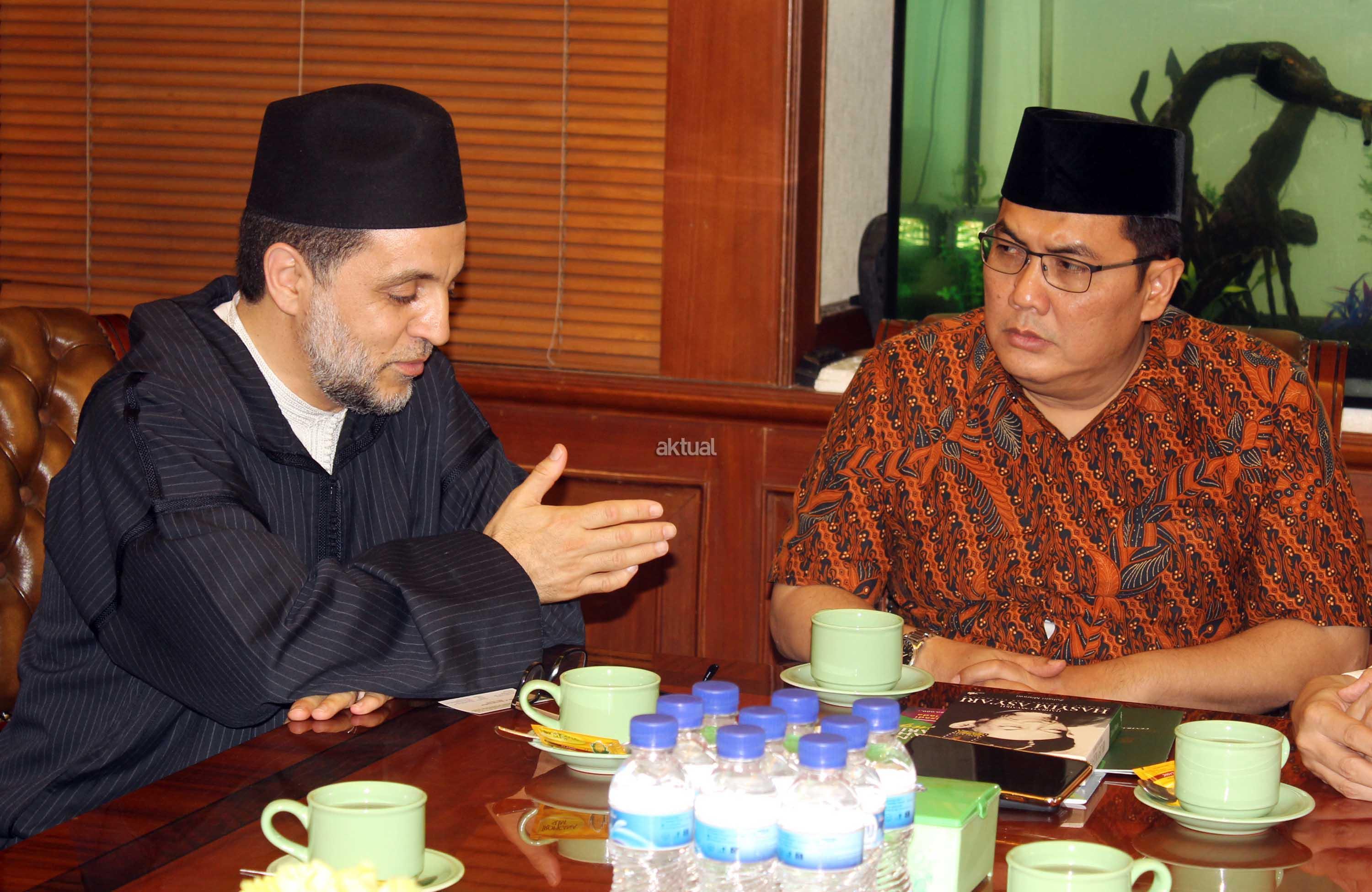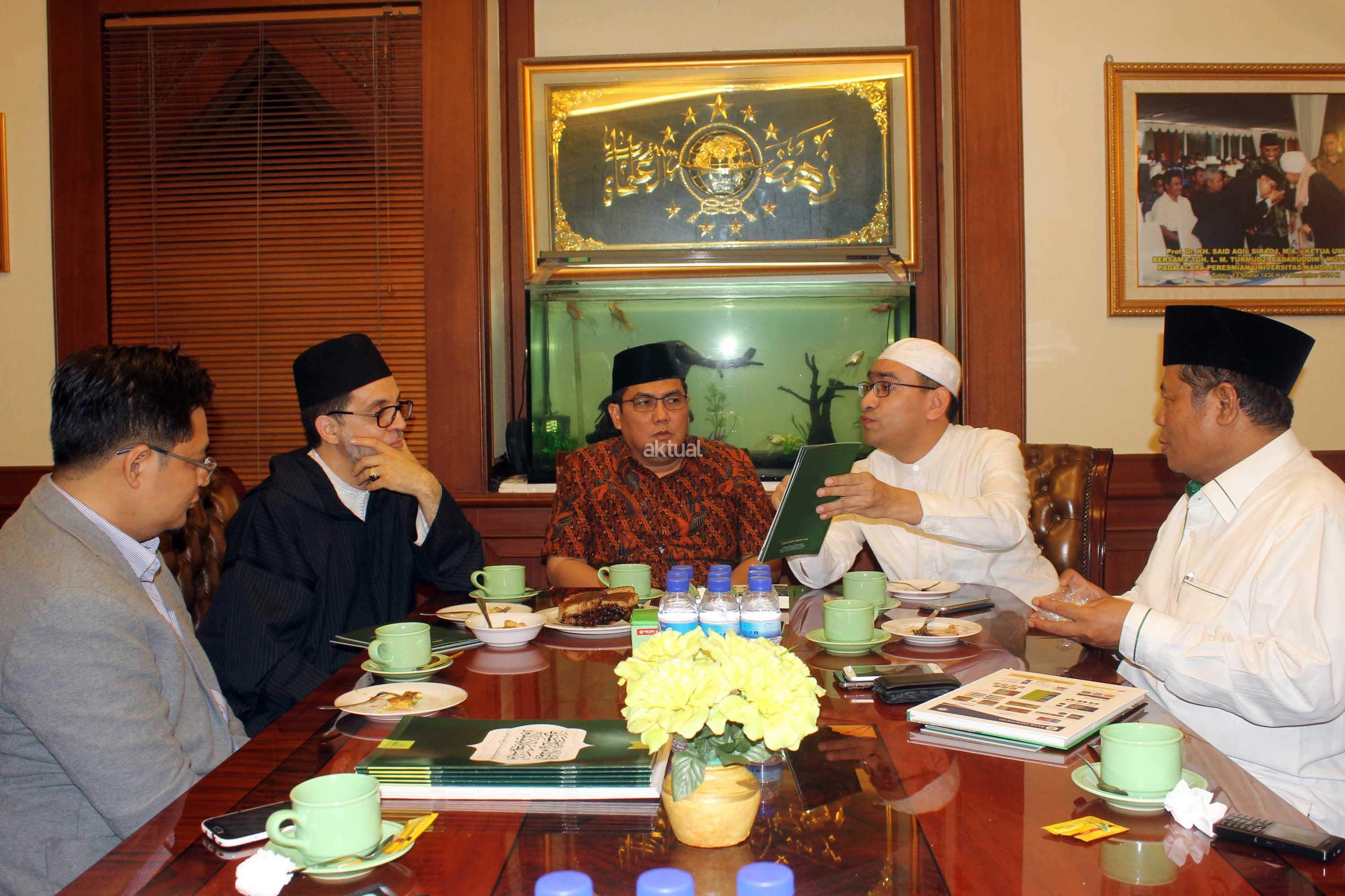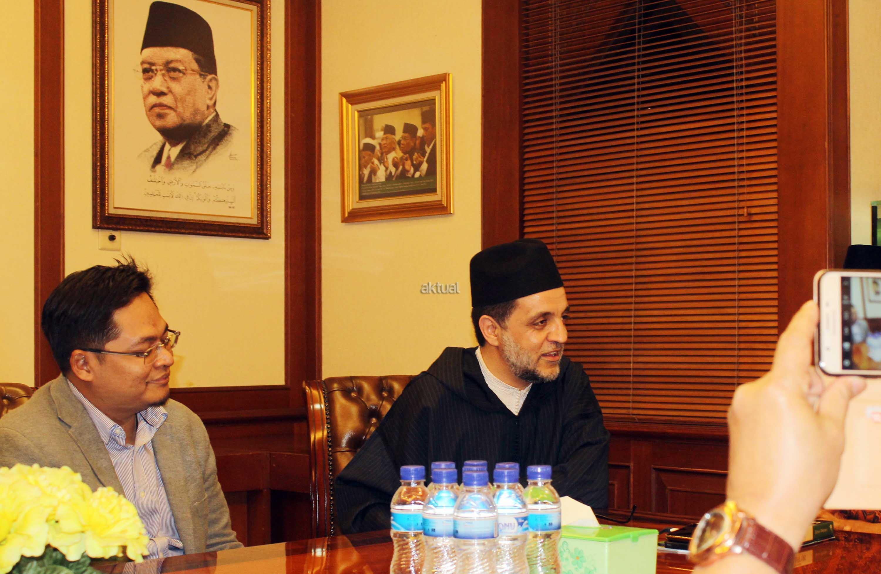 Syekh Abdul Mun,iem bin Abdul Azis bin Muhammad Shidiq Al Ghumary Al Hasani didampingi Khodim Zawiyah Arraudhah Al Akh Muhammad Danial Nafis saat bertemu Sekjen PBNU Helmi faizal Zaeni di Kantor PBNU, Jalan Kramat Raya, Jakarta, Selasa (2/5). Sebelum berkunjung ke PBNU, Syekh Abdul Mu’iem mengisi Seminar Nasional bertajuk “Peran Keluarga Ghumari dalam membentengi Sunnah Nabawiyah” di Aula Prof. Dr. Partosentono, Fakultas Ushuluddin Universitas Islam Negeri Syarif Hidayatullah, Ciputat, Banten. AKTUAL/Warnoto