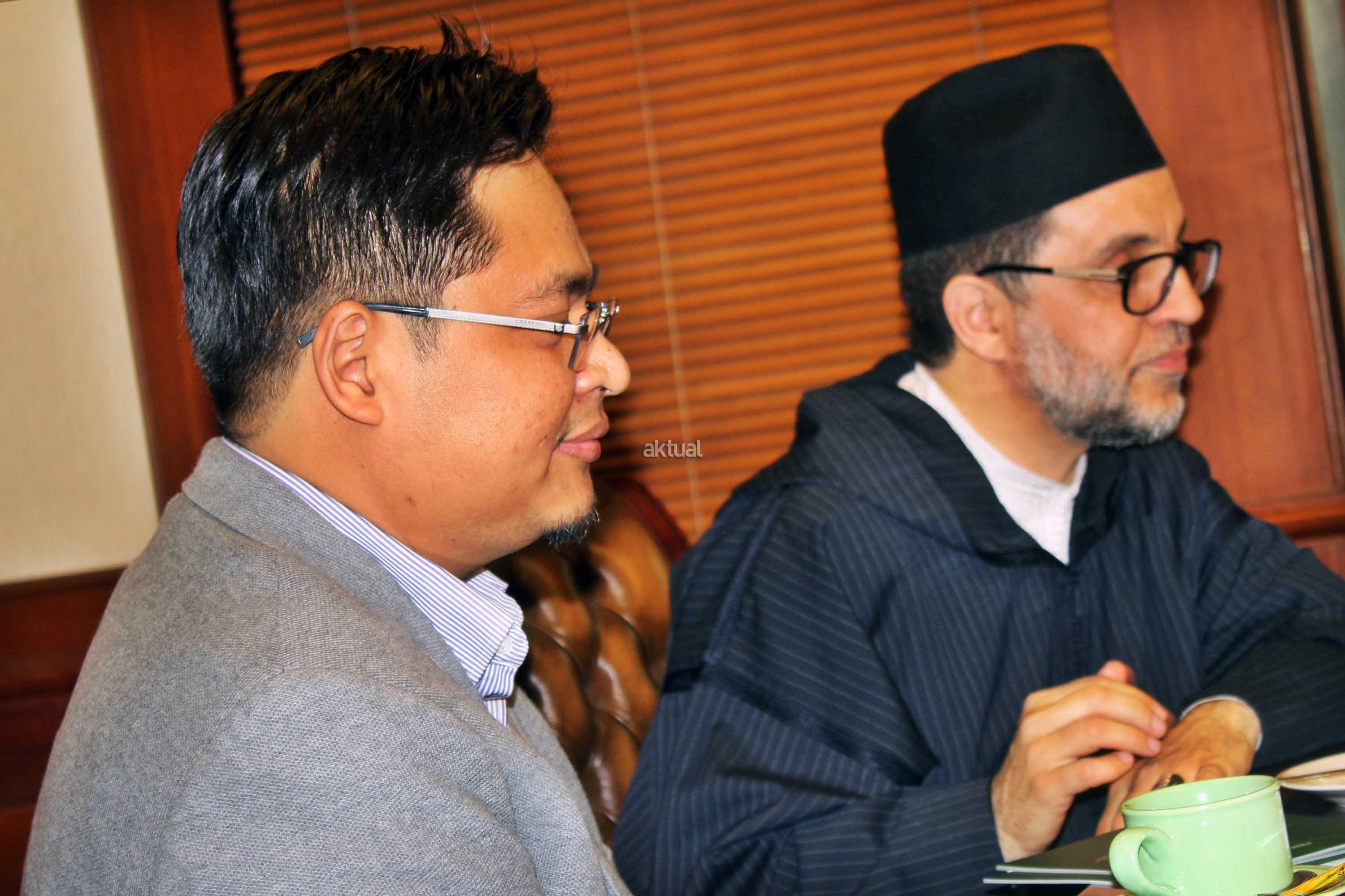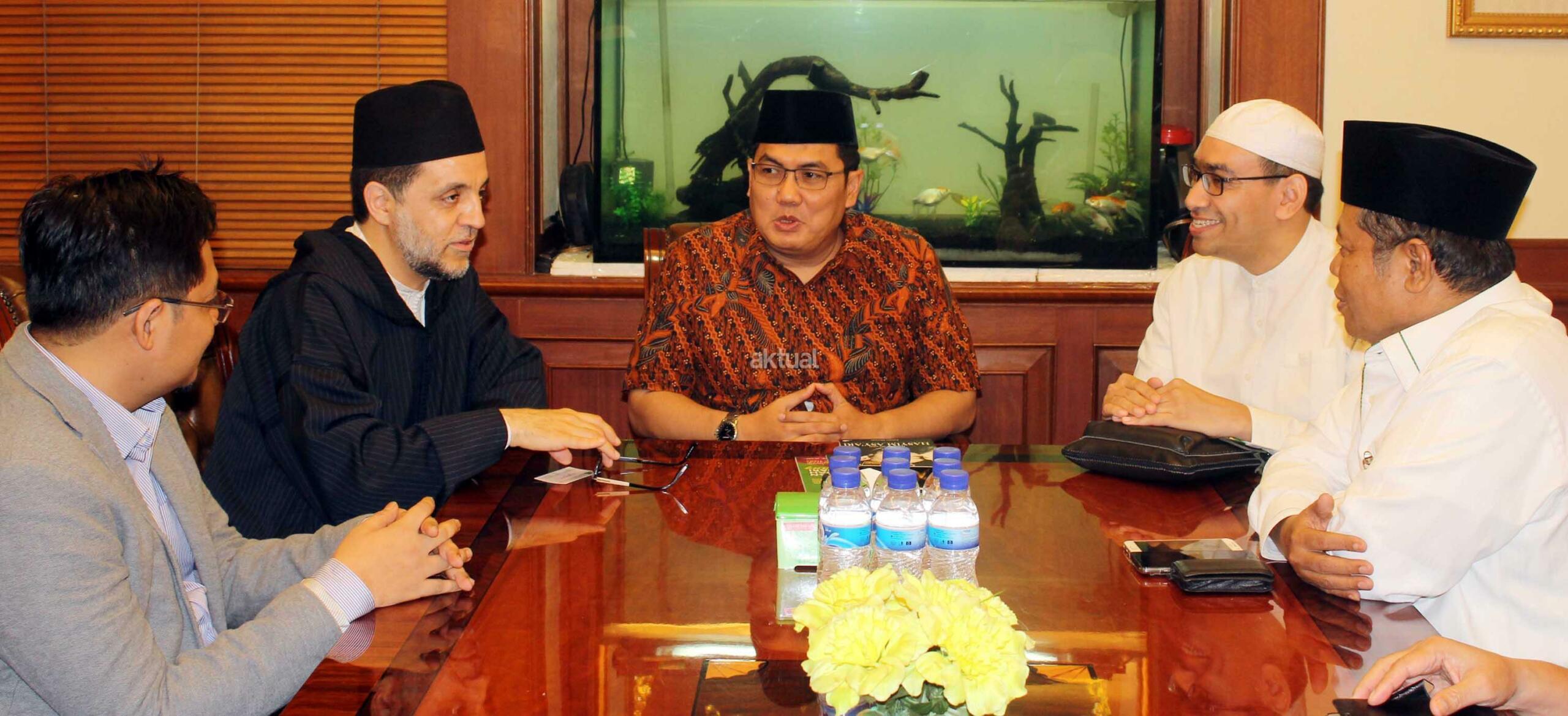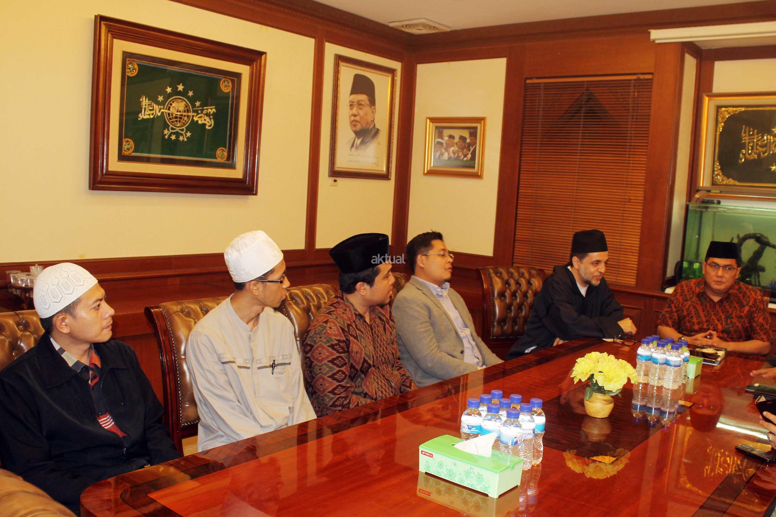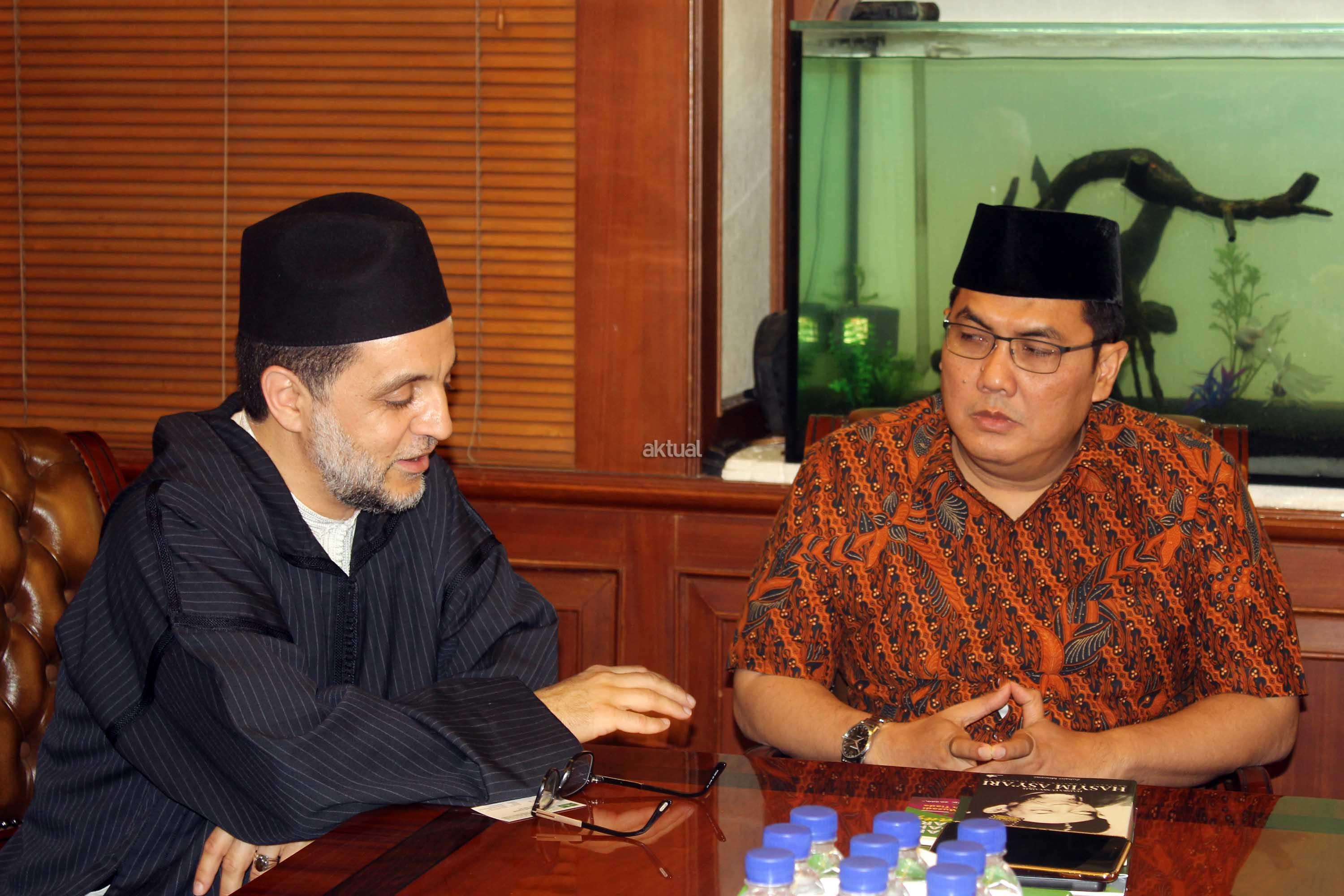 Syekh Abdul Mun,iem bin Abdul Azis bin Muhammad Shidiq Al Ghumary Al Hasani didampingi Khodim Zawiyah Arraudhah Al Akh Muhammad Danial Nafis saat bertemu Sekjen PBNU Helmi faizal Zaeni di Kantor PBNU, Jalan Kramat Raya, Jakarta, Selasa (2/5). Sebelum berkunjung ke PBNU, Syekh Abdul Mu’iem mengisi Seminar Nasional bertajuk “Peran Keluarga Ghumari dalam membentengi Sunnah Nabawiyah” di Aula Prof. Dr. Partosentono, Fakultas Ushuluddin Universitas Islam Negeri Syarif Hidayatullah, Ciputat, Banten. AKTUAL/Warnoto