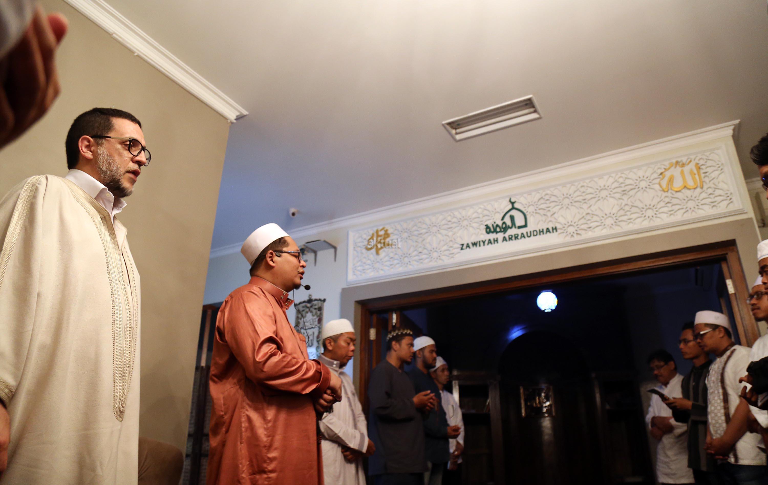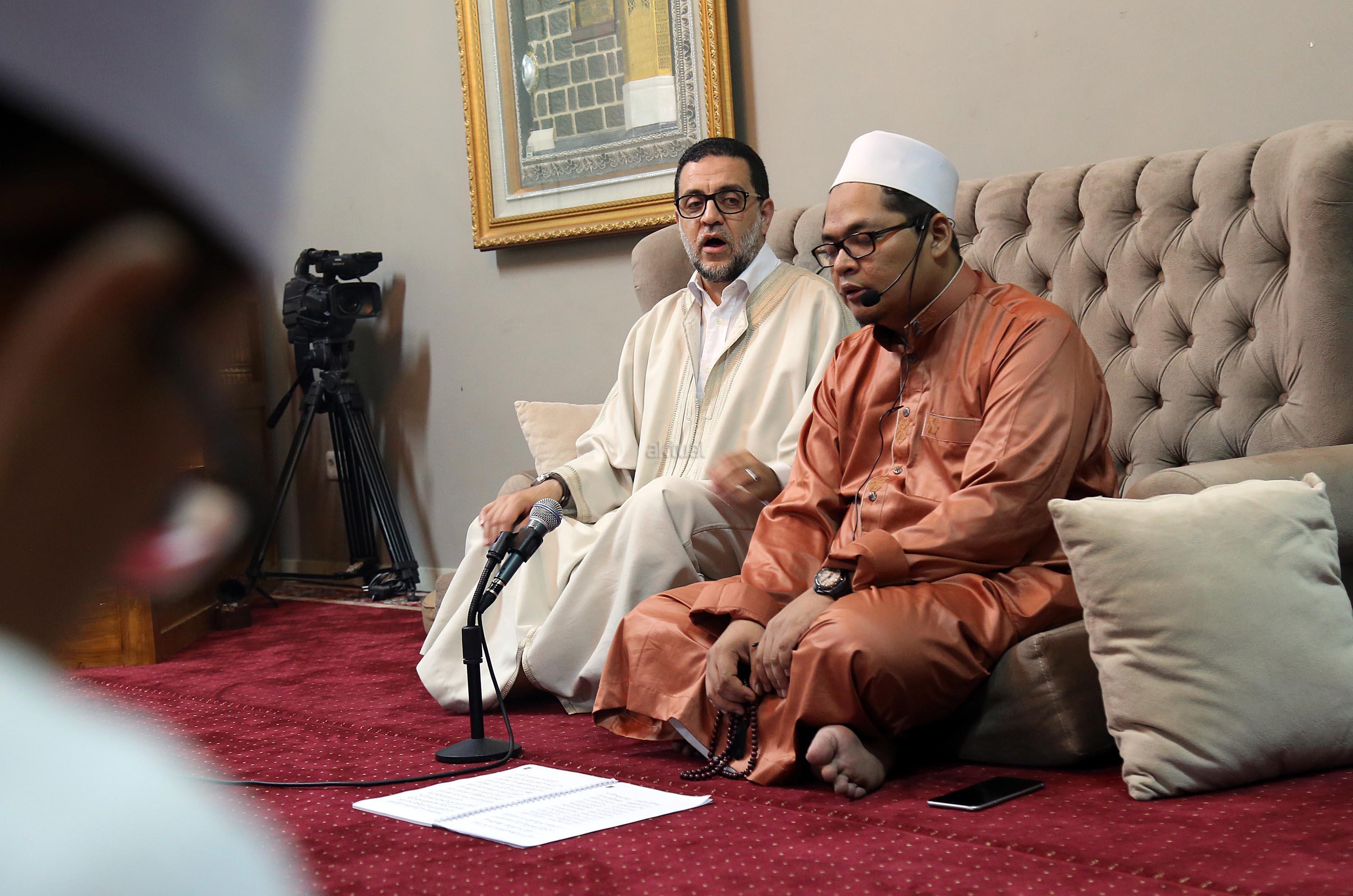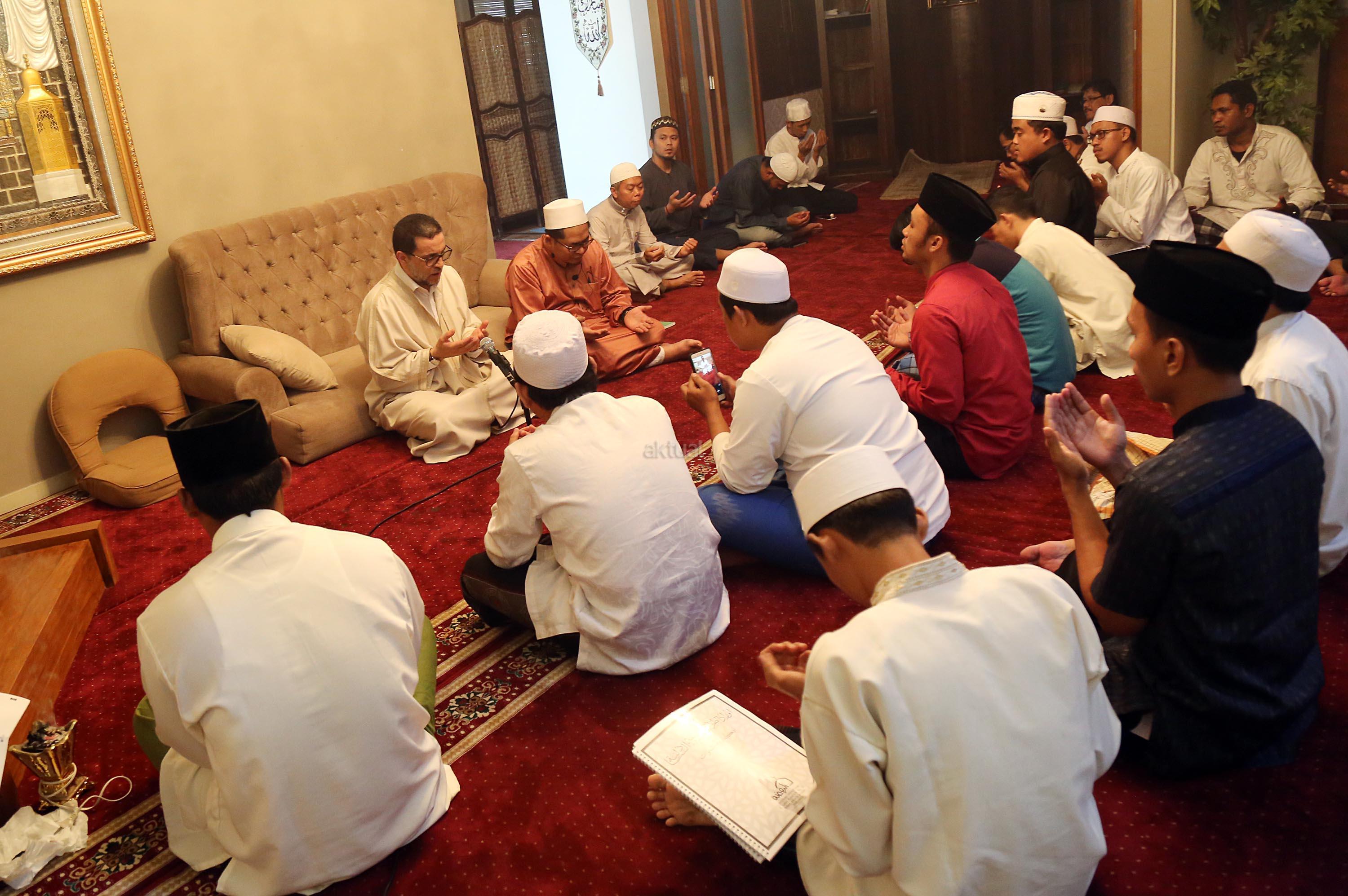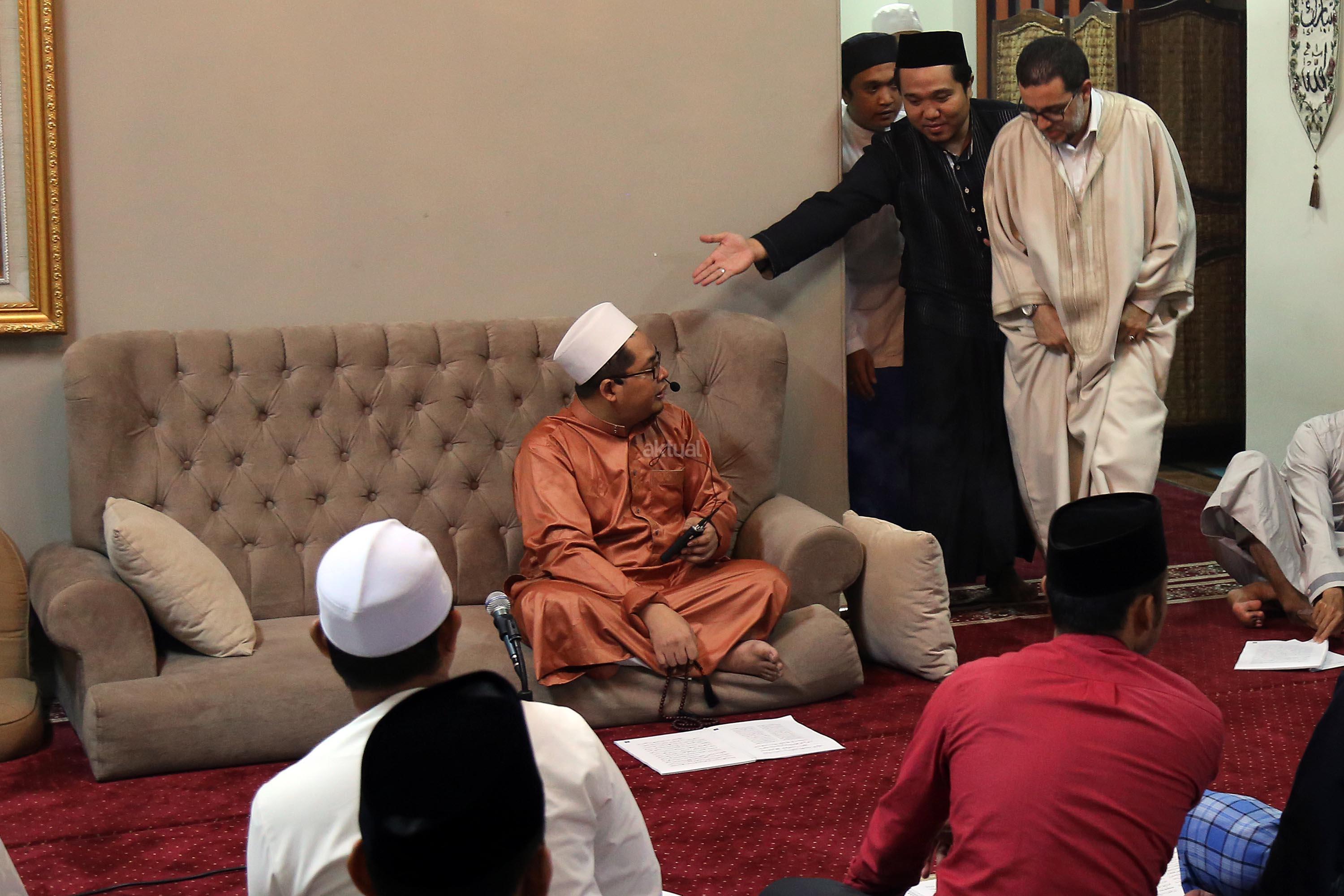 Pemegang Estafet Kepemimpinan Zawiyah Thariqah Shiddiqiyyah Syadziliyah Tangier Maroko, Dr. Abdul Mun'im bin Abdul Aziz bin Shiddiq al-Ghumari didampingi Khodim Zawiyah Arraudhah Al Akh Muhammad Danial Nafis saat mengunjungi Zawiyah Arraudhah Jalan Tebet Barat VIII, No 50, Jakarta Selatan, Senin (1/5). Syekh Mun'im bertemu dengan para Ahbab dan ikut serta dalam zikir berjamaah. Dalam Safari dakwah di Indonesia ini, beliau diagendakan akan berkunjung dan bersilaturahmi ke beberapa lembaga dan pesantren serta bertemu dengan tokoh-tokoh Islam di Indonesia. AKTUAL/Tino Oktaviano