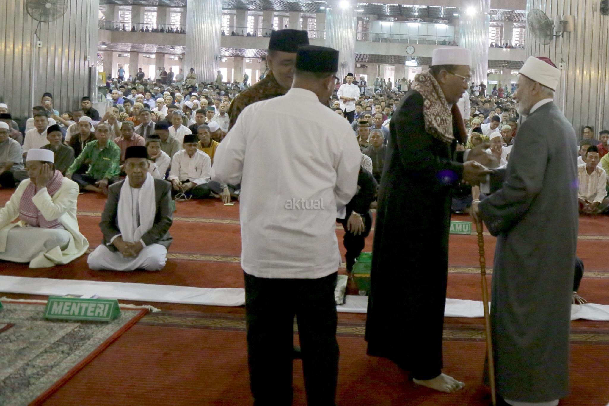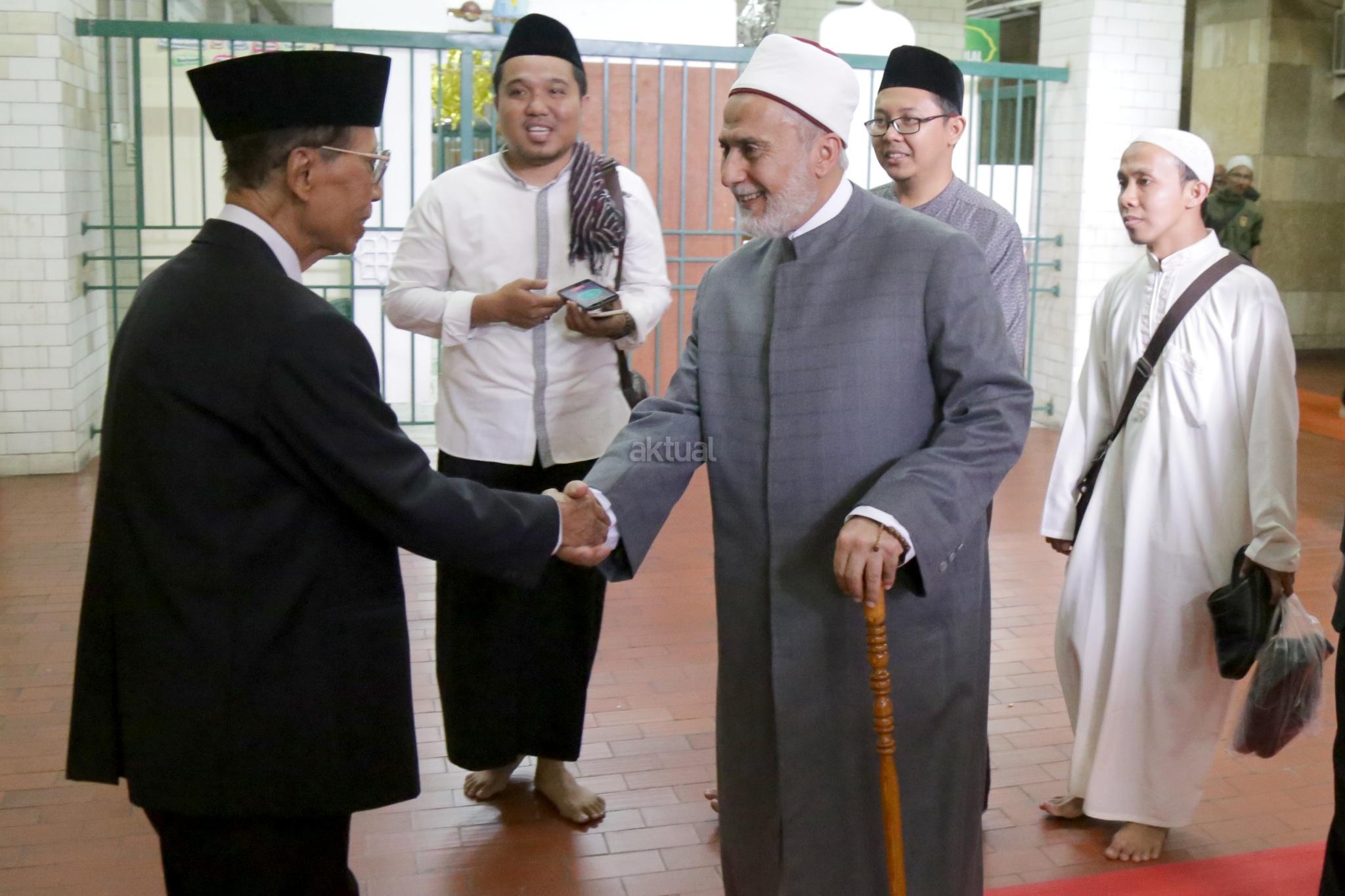 Maulana Syekh Dr. Yusri Rusydi Sayyid Jabr al-Hasani disambut Khotib Jumat KH Hamdan Rasyid di Masjid Istiqlal, Jakarta Pusat, Jumat (12/1/2018). Dalam kunjungannya, Syekh Yusri memberikan tauiyah usai Salat Jumat bersama di Masjid Istiqlal. AKTUAL/Tino Oktaviano