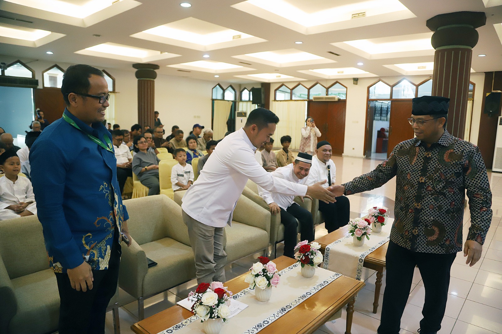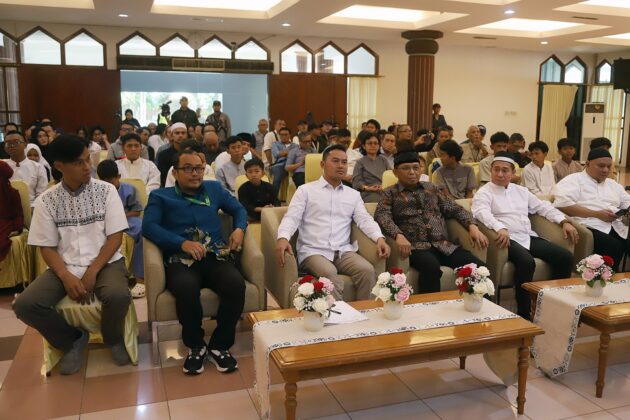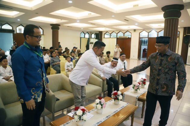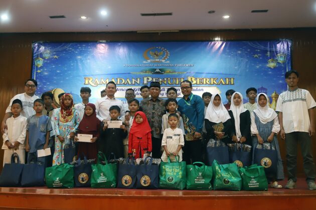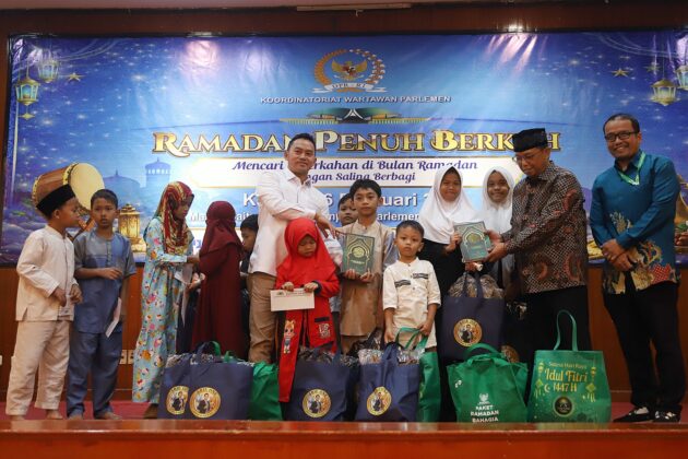 Anggota Komisi VI Fraksi Demokrat DPR RI, Herman Khaeron didampingi Ketua Koordinatoriat Wartawan Parlemen (KWP), Ariawan foto bersama usai menyerahkan santunan dan buka puasa bersama anak yatim piatu di Aula Masjid Baiturahman, Kompleks Parlemen, Jakarta, Kamis, (26/2/2026). Santunan dan buka bersama ini merupakan agenda rutin yang digelar KWP setiap tahun. Kegiatan ini bahkan menjadi jembatan bagi KWP untuk melakukan aksi sosial nyata terhadap sesama, khususnya anak yatim piatu. Kegiatan ini dapat membawa dampak yang positif bagi masyarakat luas. Aktual/TINO OKTAVIANO