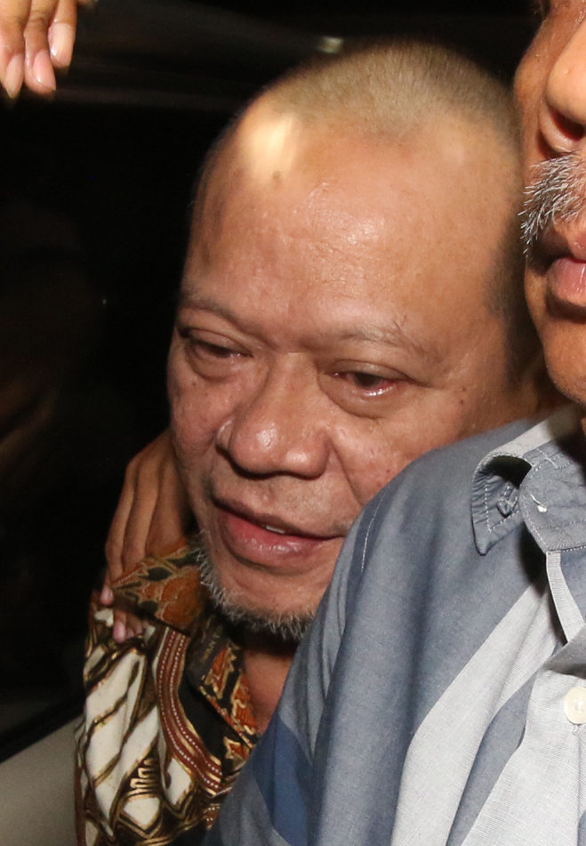Tersangka kasus dugaan korupsi penyalahgunaan dana hibah di Kamar Dagang dan Industri Indonesia (Kadin) Jawa Timur La Nyalla Mattalitti dikawal petugas saat tiba di Gedung Bundar Kejaksaan Agung, Jakarta, Selasa (31/5). La Nyalla yang merupakan tersangka dana hibah Kadin Jawa Timur dipulangkan setelah dokumen keimigrasiannya dicabut dan berstatus sebagai penduduk 'Over Stay' di Singapura dan kini menjalani pemeriksaan di Kejaksaan Agung. ANTARA FOTO/Rivan Awal Lingga/pd/16