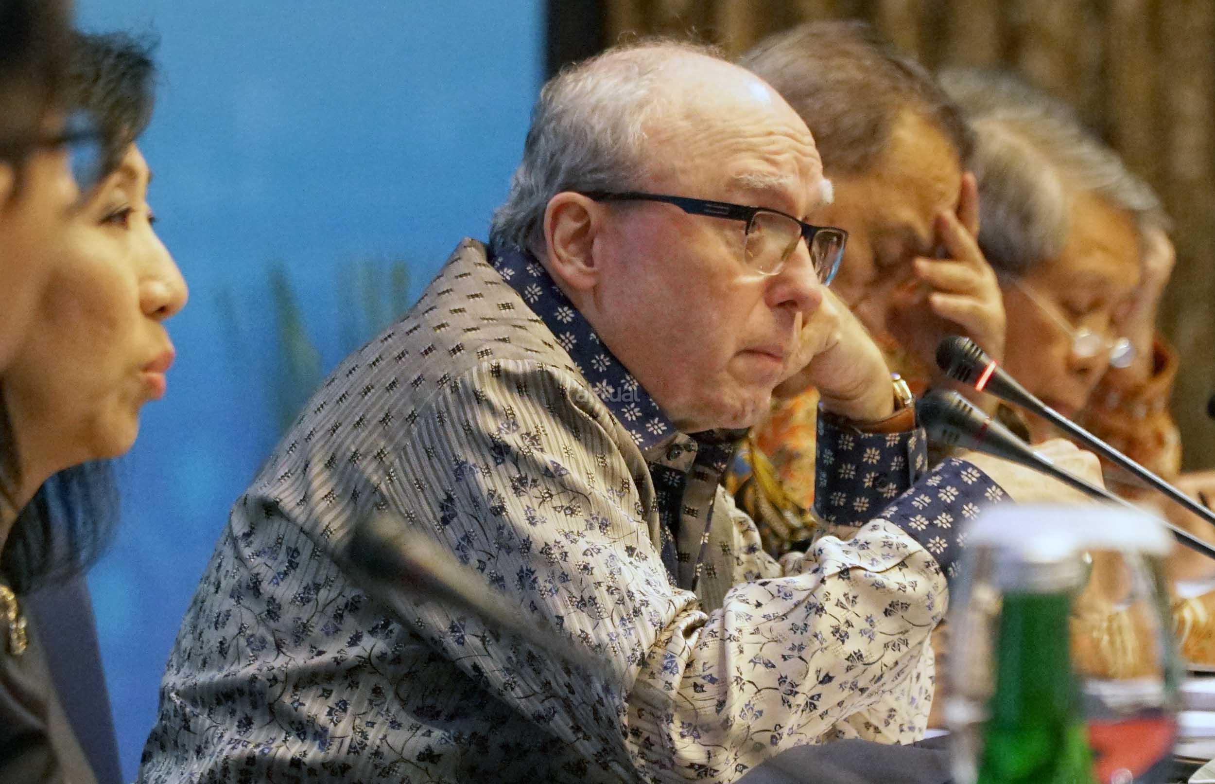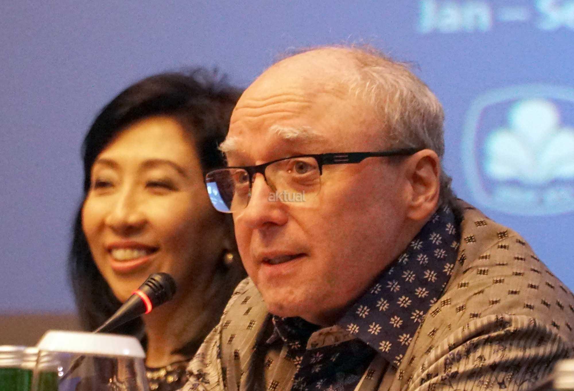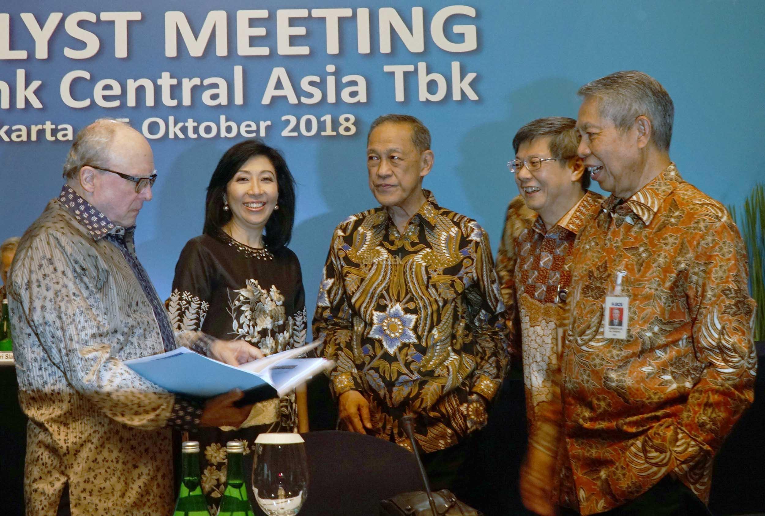 Presiden Komisaris BCA DE Setijoso (tengah), Wakil Presiden Direktur BCA Eugene K. Galbraith (kiri) berbincang di sela pemaparan kinerja keuangan BCA Kuartal III 2018 bersama Direktur BCA Suwignyo Budiman (kanan), Direktur BCA Henry Koenaifi (kedua kanan) dan Direktur BCA Vera Eve Lim (kedua kiri) di Jakarta, Kamis (25/10). BCA menutup periode sembilan bulan pertama 2018 dengan pertumbuhan laba bersih 9,9% YoY menjadi Rp 18,5 triliun dari Rp 16,8 triliun pada periode yang sama tahun sebelumnya. BCA terus memperkuat bisnis inti dalam perbankan transaksi untuk mendukung pertumbuhan CASA yang solid. CASA meningkat 11,4% YoY menjadi Rp 476,8 triliun dan tetap merupakan porsi utama dari dana pihak ketiga yaitu sebesar 77,7% pada akhir September 2018. AKTUAL/Eko S Hilman