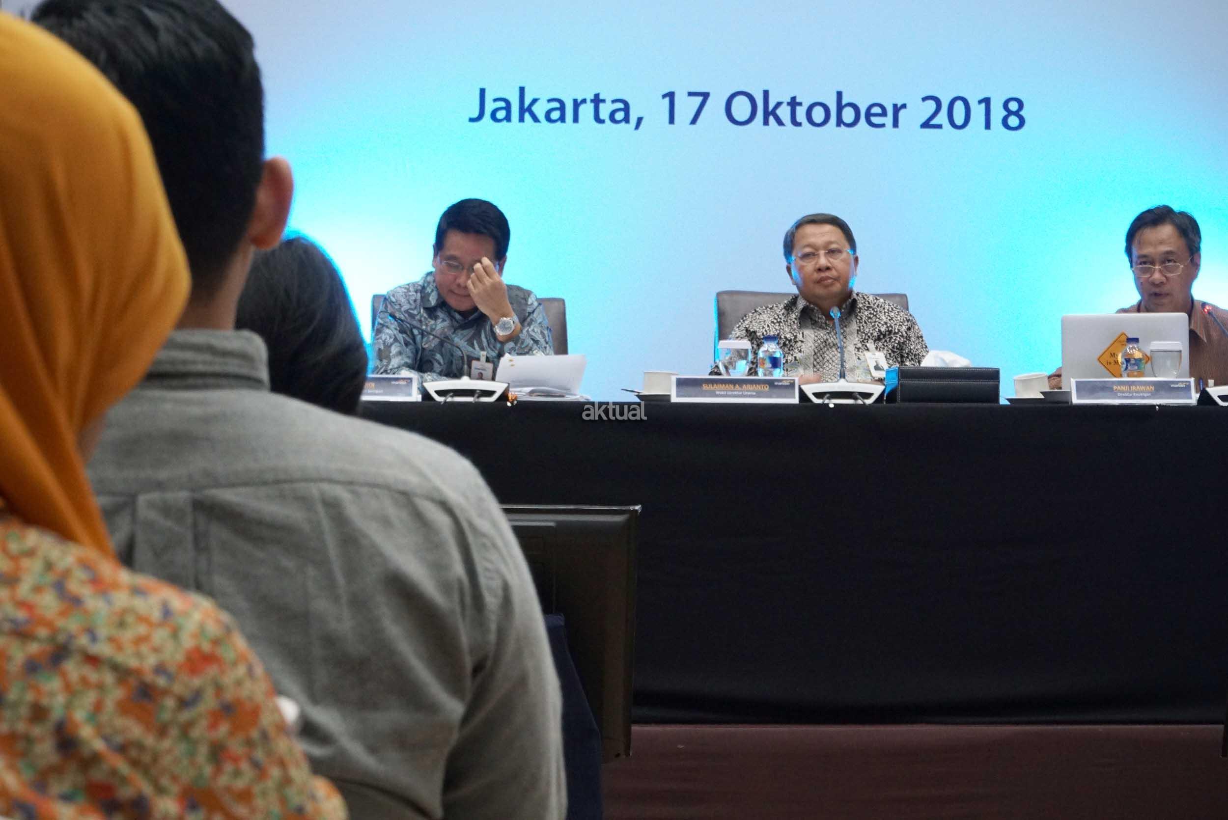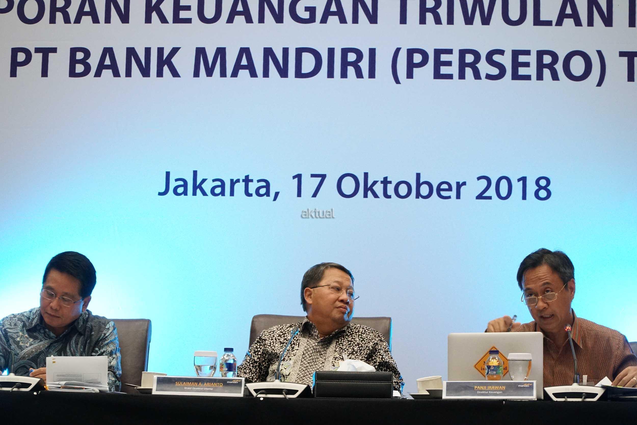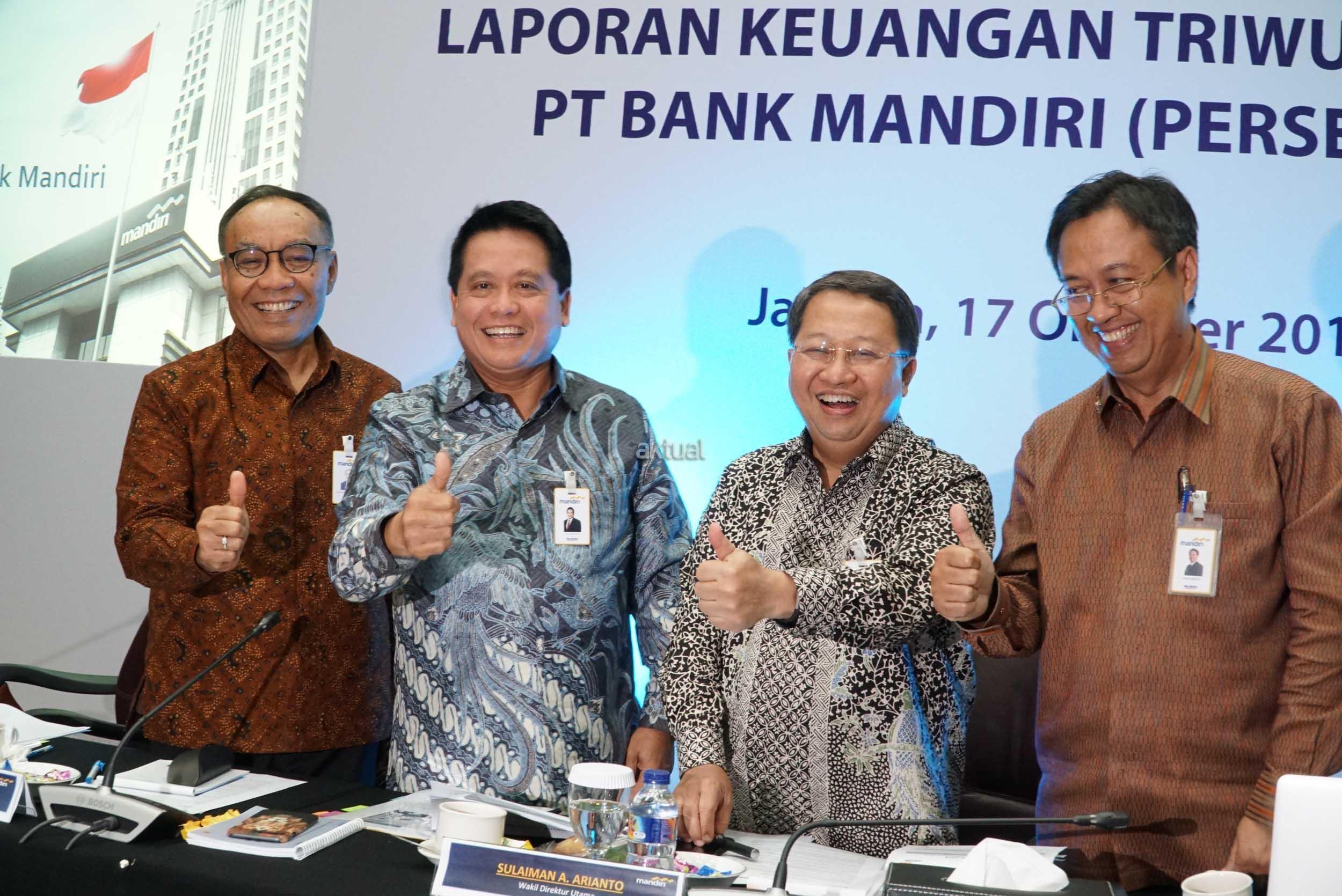 Direktur Retail Banking Bank Mandiri Donsuwan Simatupang, Direktur Bisnis Kecil dan Jaringan Hery Gunardi, Wadirut Sulaiman Arif Arianto Dan Direktur Keuangan Panji Irawan saat menyampaikan paparan kinerja triwulan III-2018 kepada media di Jakarta, Rabu (17/10). Mencetak pertumbuhan kredit 13,8% menjadi Rp781,1 triliun, Bank Mandiri berhasil mendorong laba bersih naik 20% menjadi Rp18,1 triliun pada sembilan bulan pertama tahun ini. Ekspansi tersebut juga meningkatkan aset Bank Mandiri Group menjadi Rp1.173,6 triliun pada akhir September 2018. AKTUAL/Eko S Hilman