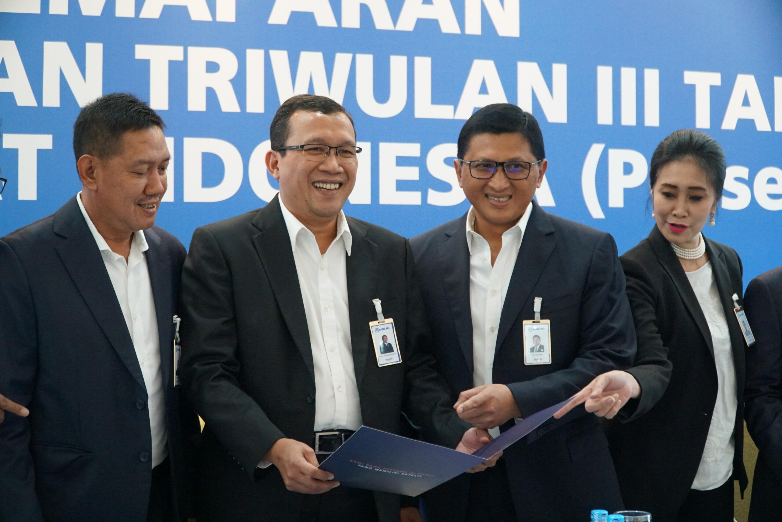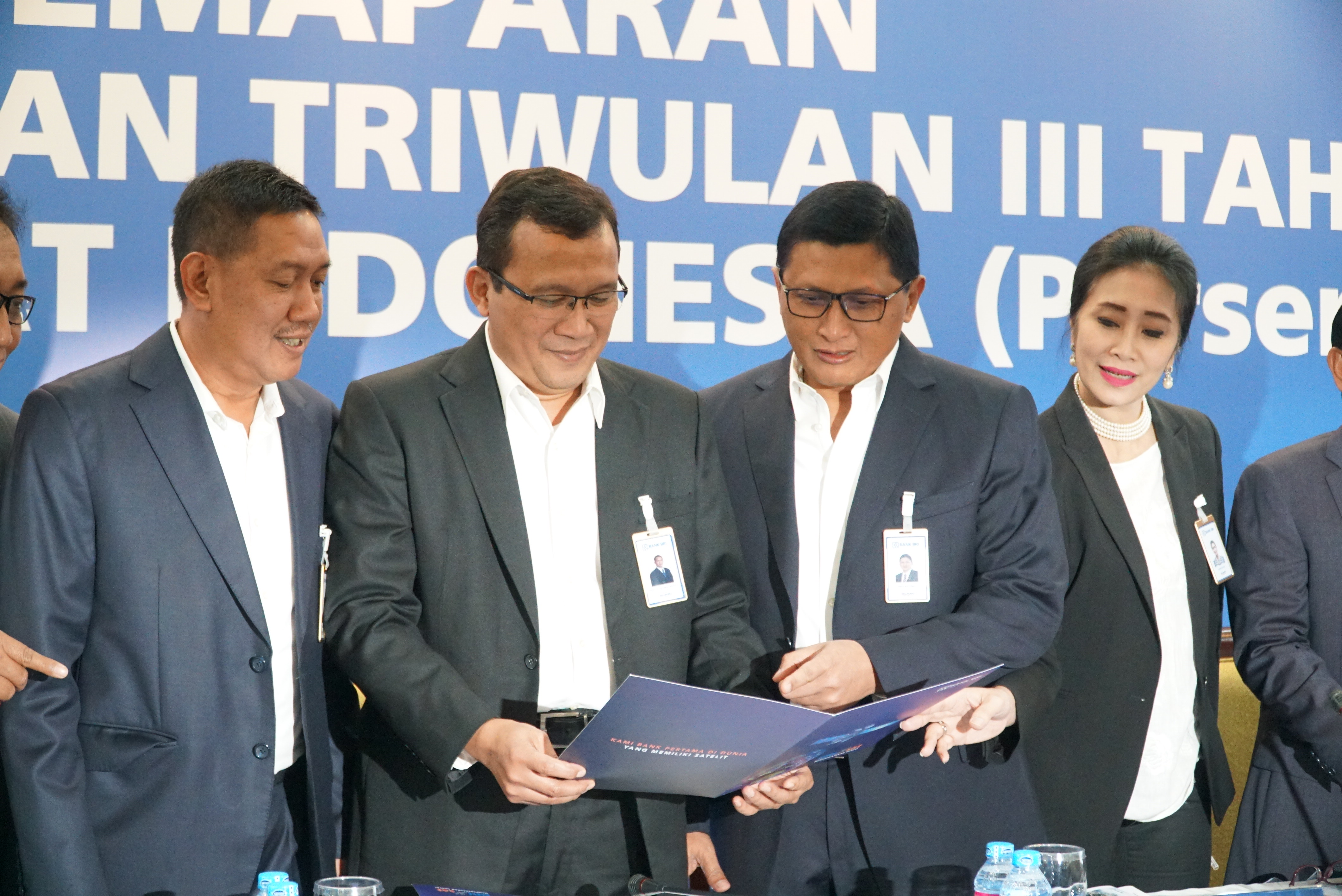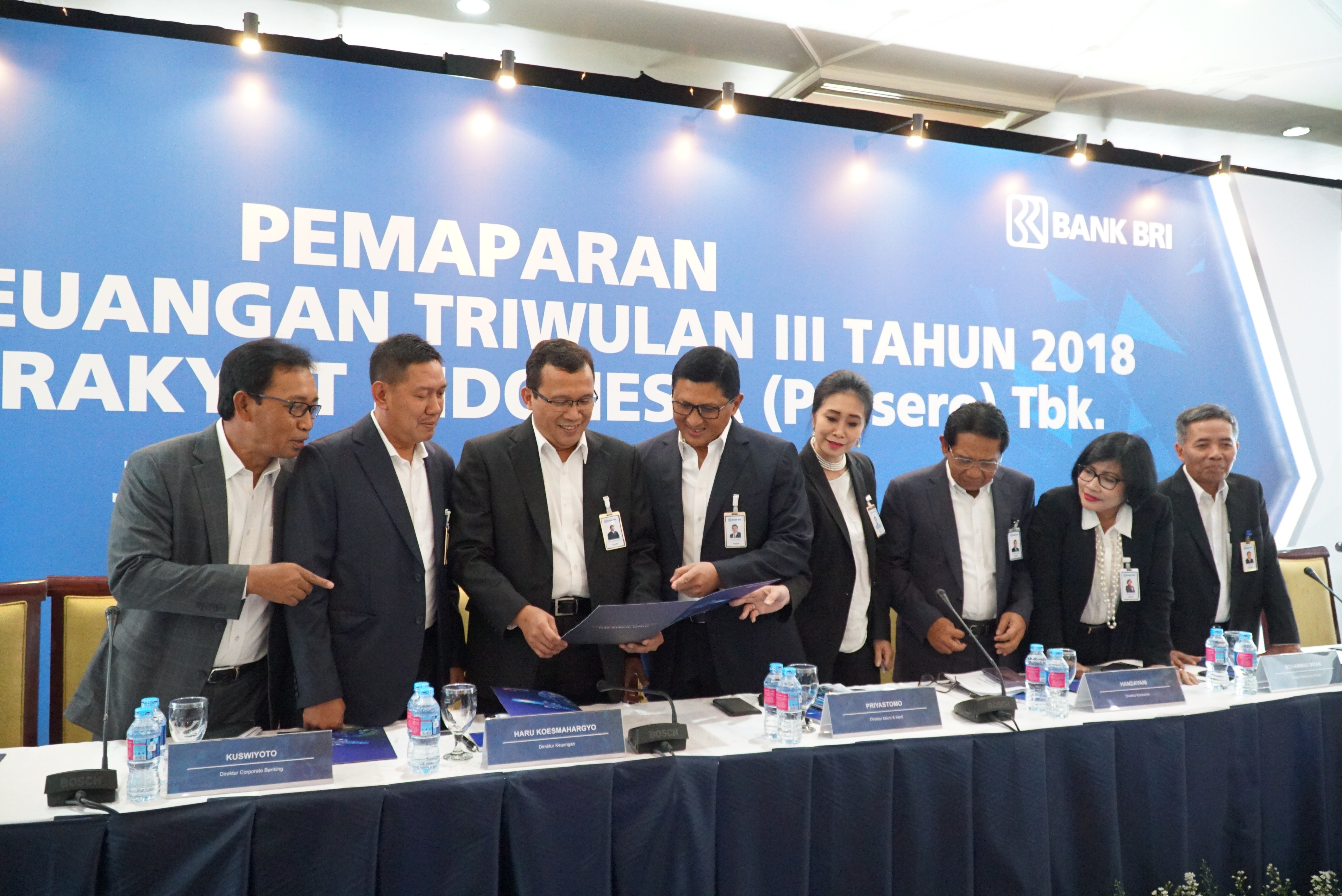 Jajaran Direksi Bank BRI (ki-ka): Osbal Saragi Rumahorbo, Ahmad Solichin Lutfiyanto, Sis Apik Wijayanto, Kuswiyoto, Haru Koesmahargyo, Priyastomo, Handayani, Mohammad Irfan, R Sophia Alizsa dan Supari, saat paparan Kinerja Keuangan Triwulan III 2018, Jakarta, Rabu (24/10). PT Bank Rakyat Indonesia (Persero) Tbk atau BRI mencatatkan kinerja cemerlang pada triwulan III 2018. Perseroan meraup laba bersih sebesar Rp 23,5 triliun atau tumbuh 14,6 persen year on year dibandingkan periode yang sama tahun lalu sebesar Rp 20,5 triliun. AKTUAL/Eko S Hilman