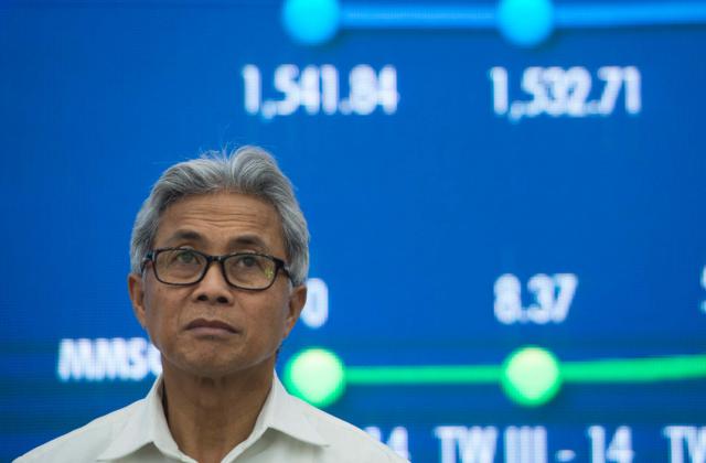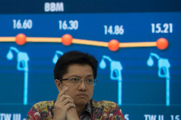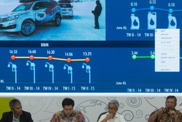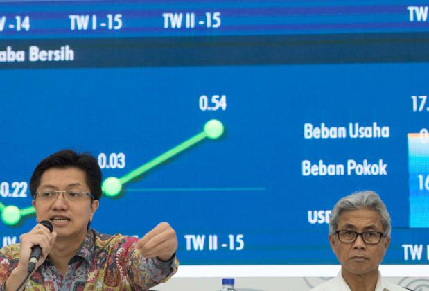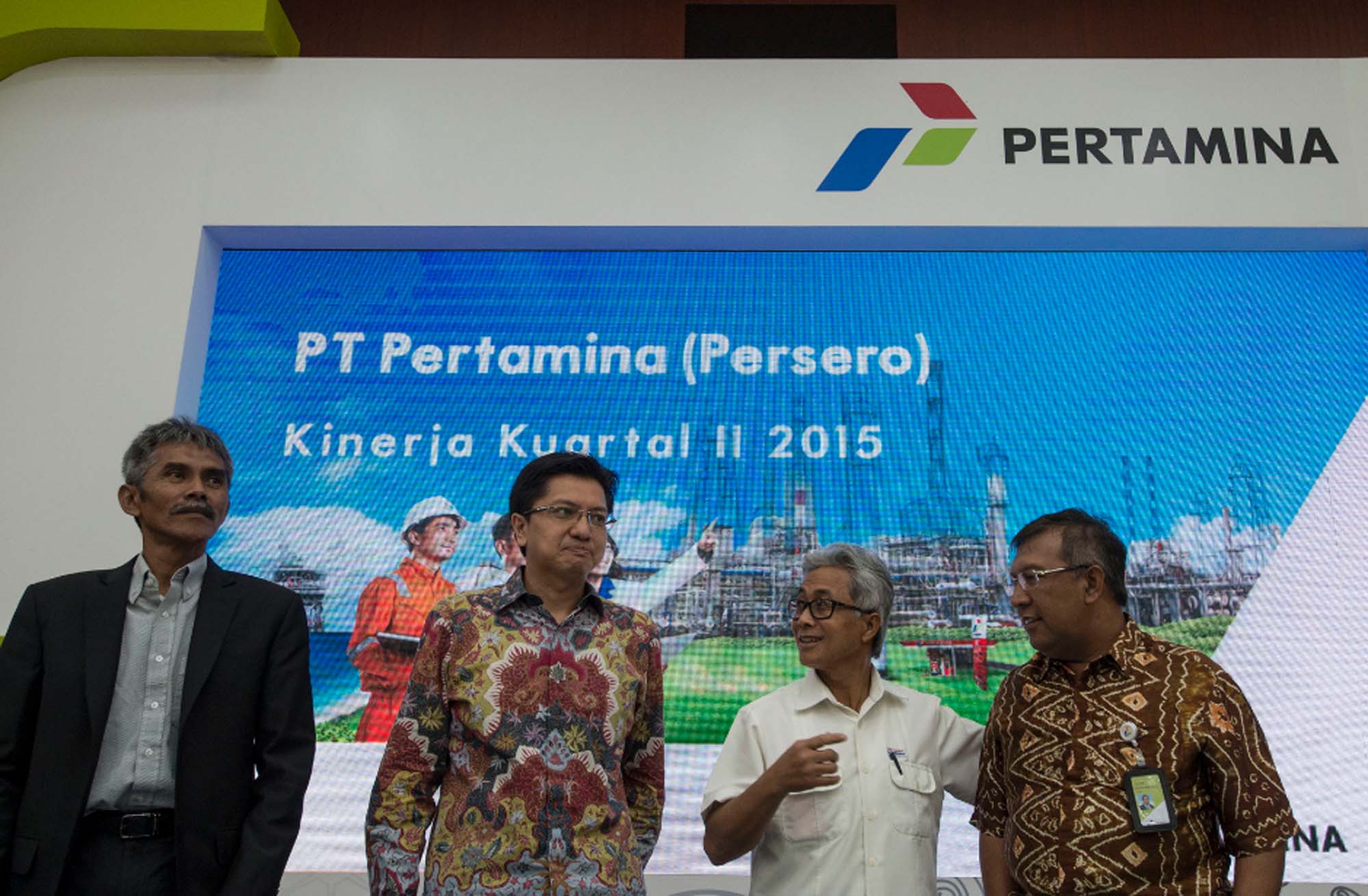 Dirut Pertamina Dwi Soetjipto (kedua kanan) berbincang dengan Direktur Keuangan Pertamina Arif Budiman (kedua kiri), Direktur Pemasaran Pertamina Ahmad Bambang (kanan), dan Direktur Hulu Pertamina Syamsu Alam (kiri) memberi keterangan dalam konferensi pers tentang kinerja Pertamina kuartal II di Kantor Pertamina, Jakarta, Selasa (5/8). PT. Pertamina Persero mencatatkan laba bersih sebesar 570 juta dolar AS per semester I 2015 atau mengalami penurunan dari periode yang sama pada tahun lalu. ANTARA FOTO/Rosa Panggabean/foc/15.
