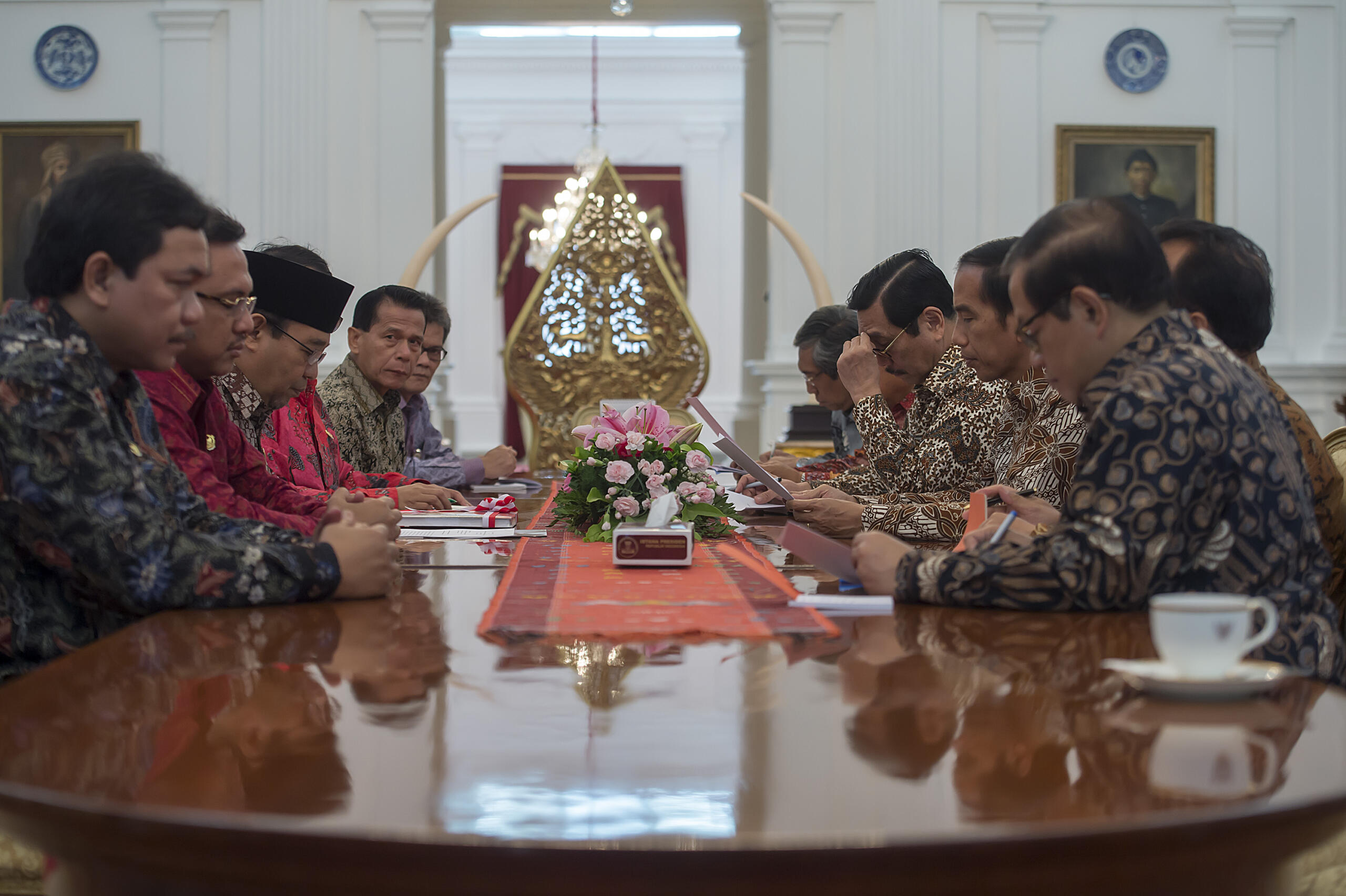 Presiden Joko Widodo (kedua kanan) didampingi sejumlah menteri Kabinet Kerja menerima Ketua BPK Harry Azhar Azis (ketiga kiri) beserta sejumlah Anggota BPK di Istana Merdeka, Jakarta, Senin (12/10). BPK menyampaikan Ikhtisar Hasil Pemeriksaan Semester I (IHPS) tahun 2015 kepada Presiden Joko Widodo yang berisi laporan diantaranya 10.154 temuan dan pemberian opini Wajar Dengan Pengecualian (WDP) terhadap Laporan Keuangan Pemerintah Pusat (LKPP) Tahun 2014. ANTARA FOTO/Widodo S. Jusuf/aww/15.