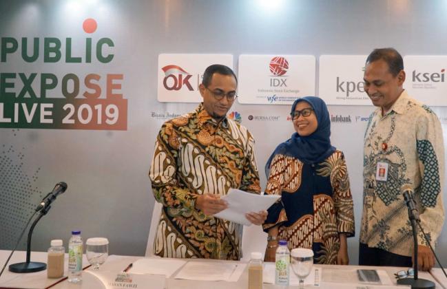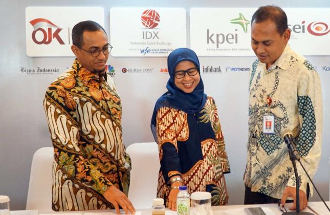 Kepala Departemen Pengawasan Pasar Modal 1A OJK Luthfy Zain Fuady bersama Ketua Panitia HUT ke-42 Pasar Modal Indonesia Umi Kulsum dan Direktur BEI Hasan Fawzi berbincang usai memberikan keterangan kepada wartawan saat Konferensi Pers Laporan Pelaksanaan Public Expose Live 2019 di Bursa Efek Indonesia, Rabu (28/8/2019). AKTUAL/STR-Eko S Hilman