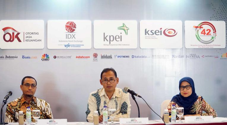 Kepala Departemen Pengawasan Pasar Modal 1A OJK Luthfy Zain Fuady bersama Ketua Panitia HUT ke-42 Pasar Modal Indonesia Umi Kulsum dan Direktur BEI Hasan Fawzi memberikan keterangan kepada wartawan saat Konferensi Pers Laporan Pelaksanaan Public Expose Live 2019 di Bursa Efek Indonesia, Rabu (28/8/2019). AKTUAL/STR-Eko S Hilman