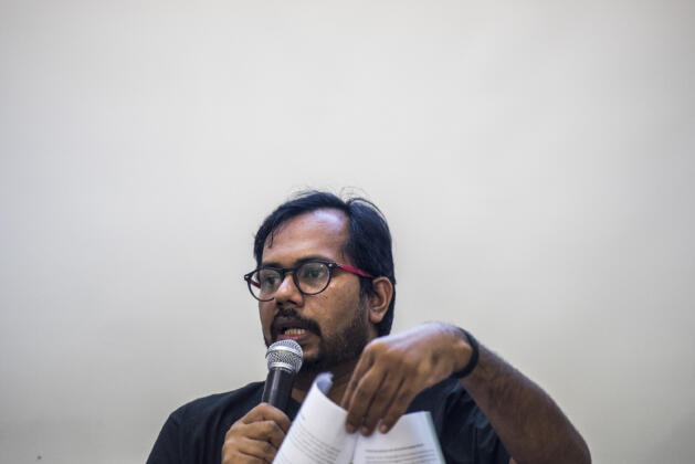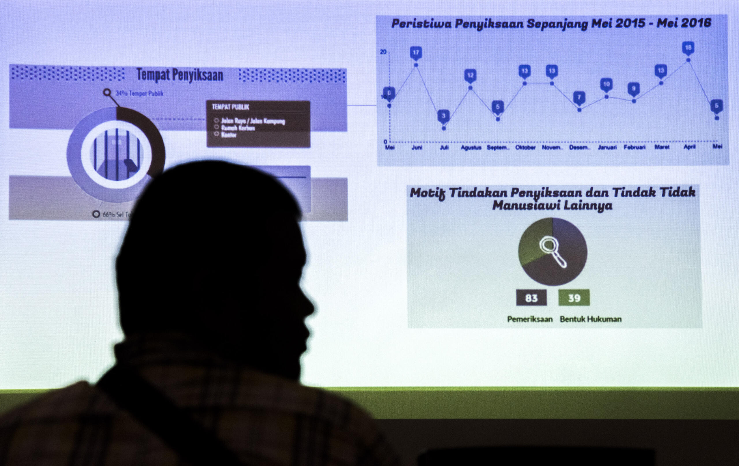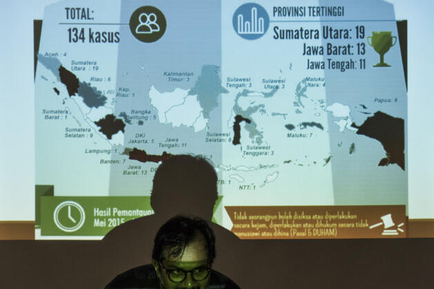 Siluet aktivis Komisi untuk Orang Hilang dan Korban Tindak Kekerasan (Kontras) berlatar belakang laporan situasi penyiksaan di Indonesia 2015-2016 di Jakarta, Sabtu (25/6). Dalam laporannya Kontras mencatat selama setahun terdapat 134 peristiwa penyiksaan serta tindakan tidak manusiawi diantaranya paling banyak terjadi di Sumatera Utara sebanyak 19 peristiwa, Jawa Barat 13 peristiwa, Jawa Tengah 11 peristiwa, Sulsel dan Papua masing-masing 8 peristiwa sedangkan pelaku penyiksaan didominasi oleh Kepolisian sebanyak 91 tindakan disusul TNI 24 kasus dan petugas lapas 19 kasus. ANTARA FOTO/M Agung Rajasa/ama/16