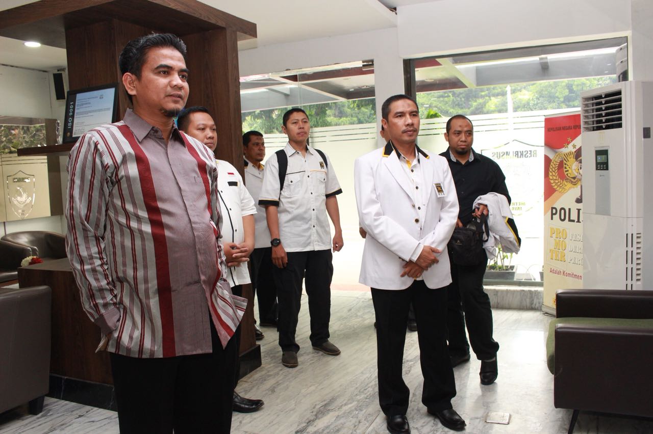 Ketua Umum DPW PKS DKI Jakarta Sakhir Purnomo (kedua kanan) hadir ke kantor Reskrimsus Polda Metro Jaya, Senayan, Jakarta, Jumat (4/5/18). Bersama penasehat hukum dan pengurus DPW PKS DKI Jakarta lainnya, dalam penyampaian bukti dan keterangan perihal laporan DPW PKS DKI Jakarta atas dugaan fitnah dan/atau pencemaran nama baik PKS dengan terlapor Fahri Hamzah. AKTUAL/HO