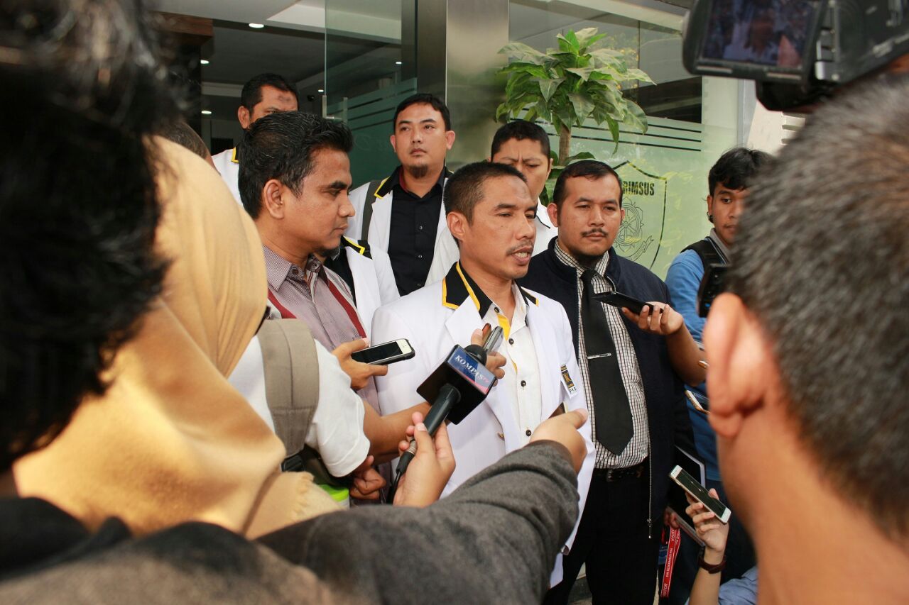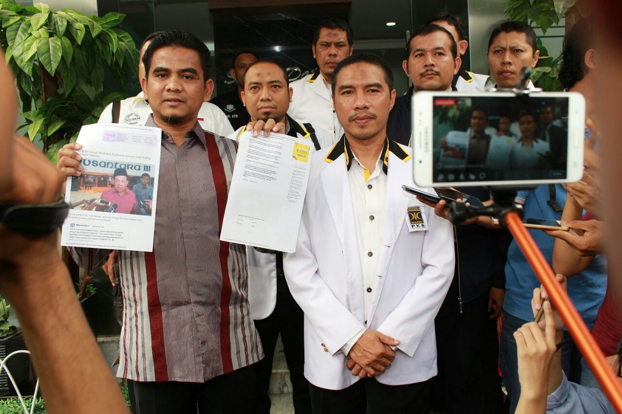 Penasehat Hukum PKS, Indra SH (kiri) menyampaikan alat bukti dan keterangan perihal laporan DPW PKS DKI Jakarta atas dugaan fitnah dan/atau pencemaran nama baik PKS dengan terlapor Fahri Hamzah, didampingi oleh Ketua Umum DPW PKS DKI Jakarta Sakhir Purnomo (kanan) beserta pengurus lainnya, di kantor Reskrimsus Polda Metro Jaya, Senayan, Jakarta, Jumat (4/5/18). AKTUAL/HO