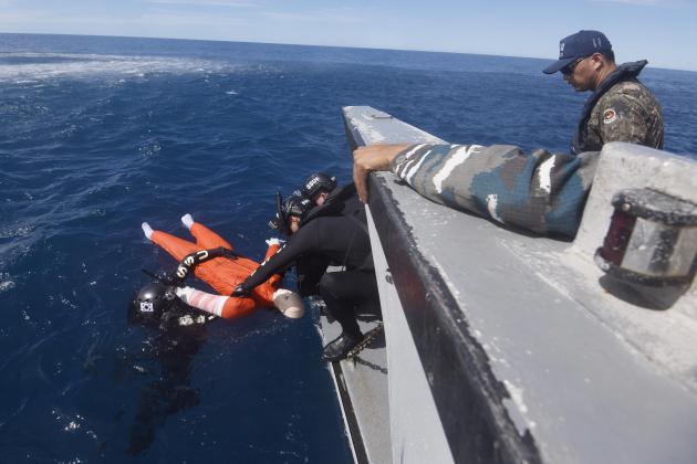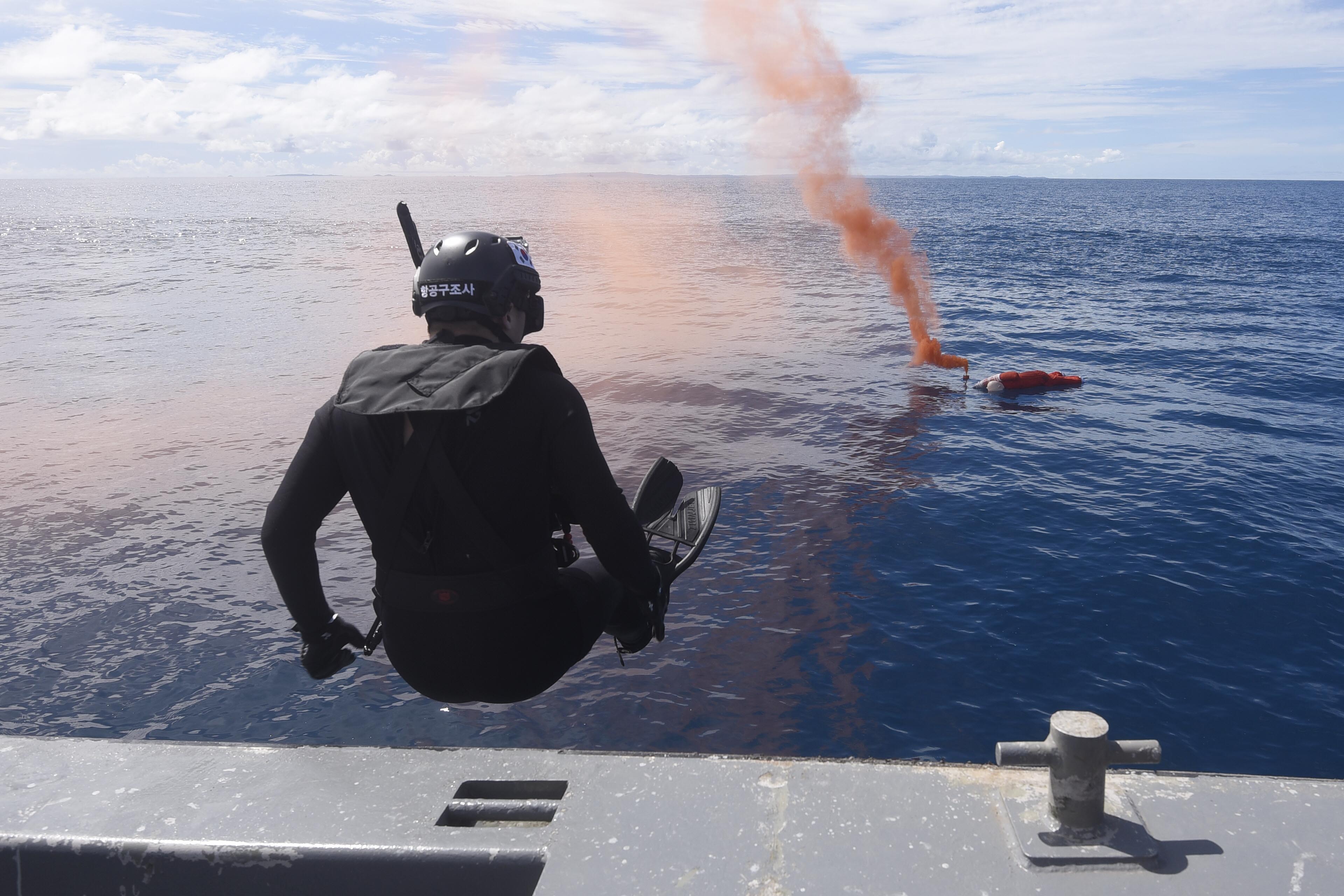 Anggota Angkatan Laut Korea Selatan bersiap mengevakuasi korban dari laut ke sekoci penyelamat dalam latihan gabungan Indonesia-Korea Selatan dengan misi penyelamatan di tengah laut di Perairan Kepulauan Mentawai, Sumatera Barat, Jumat (15/4). Latihan gabungan yang merupakan bagian dari latihan laut Multilateral Naval Exercise Komodo (MNEK) 2016 itu bertujuan meningkatkan kemampuan prajurit dalam menangani korban di tengah laut. ANTARA FOTO/Akbar Nugroho Gumay/pd/16