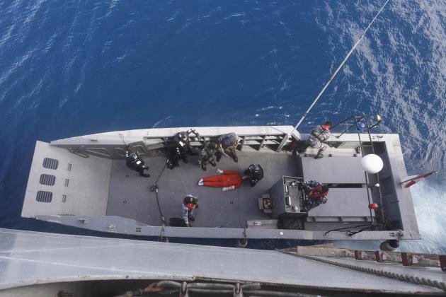 Anggota TNI Angkatan Laut RI bersama Korea Selatan bersiap mengevakuasi korban dari sekoci penyelamat keatas KRI Makassar dalam latihan gabungan Indonesia-Korea Selatan dengan misi penyelamatan di tengah laut di Perairan Kepulauan Mentawai, Sumatera Barat, Jumat (15/4). Latihan gabungan yang merupakan bagian dari latihan laut Multilateral Naval Exercise Komodo (MNEK) 2016 itu bertujuan meningkatkan kemampuan prajurit dalam menangani korban di tengah laut. ANTARA FOTO/Akbar Nugroho Gumay/foc/16.