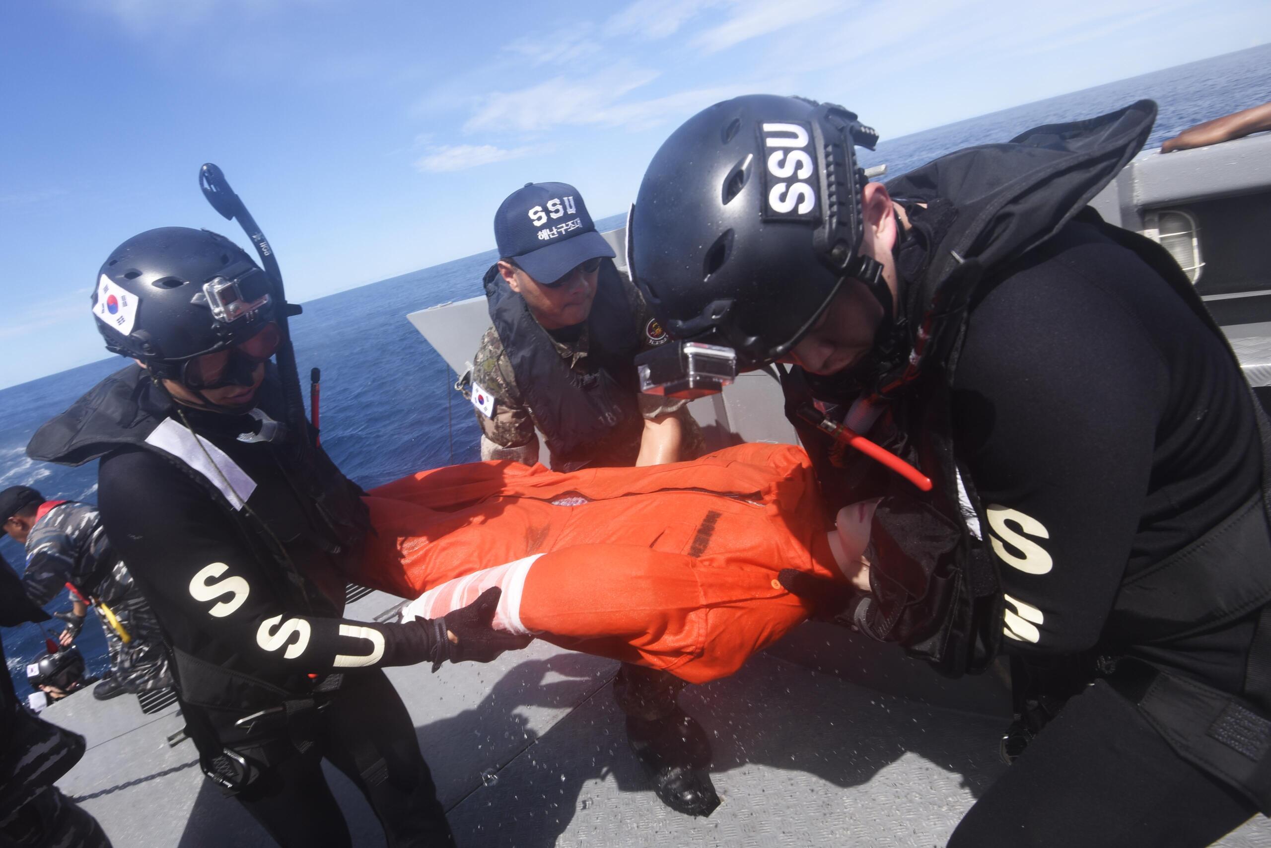 Anggota Angkatan Laut Korea Selatan mengevakuasi korban dari laut ke sekoci penyelamat dalam latihan gabungan Indonesia-Korea Selatan dengan misi penyelamatan di tengah laut di Perairan Kepulauan Mentawai, Sumatera Barat, Jumat (15/4). Latihan gabungan yang merupakan bagian dari latihan laut Multilateral Naval Exercise Komodo (MNEK) 2016 itu bertujuan meningkatkan kemampuan prajurit dalam menangani korban di tengah laut. ANTARA FOTO/Akbar Nugroho Gumay/pd/16
