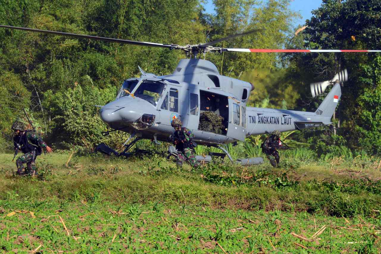 Sejumlah prajurit Korps Marinir TNI AL turun dari Heli Bell 412EP milik Skuadron Udara 400 Wing Udara 1 Puspenerbal di Pusat Latihan Tempur Korps Marinir Baluran, Situbondo Jawa Timur, Jumat (29/7). Kegiatan tersebut merupakan bagian dari Latihan Marinir Terpadu (Latmardu) 2016 yang melibatkan ratusan prajurit dan beberapa material tempur untuk meningkatkan kesiapan satuan Korps Marinir TNI AL sebagai Pasukan Pendarat (Pasrat) dalam operasi amfibi. ANTARA FOTO/Serka Mar Kuwadi/Spt/16