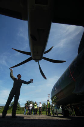 Teknisi mengecek kondisi baling-baling pesawat udara CN-295 usai mengikuti latihan bersama kesiapsiagaan bencana di Lanud Tabing, Padang, Sumatera Barat, Kamis (14/7). Latihan Kesiapsiagaan Komando Utama Operasi (Kotamaops) l TNI AU itu digelar bersama BPBD dan instansi terkait untuk mendukung kesiapsiagaan operasi bantuan kemanusiaan penanggulangan bencana alam gempa bumi dan tsunami di wilayah Indonesia Bagian Barat. ANTARA FOTO/Iggoy el Fitra/Spt/16