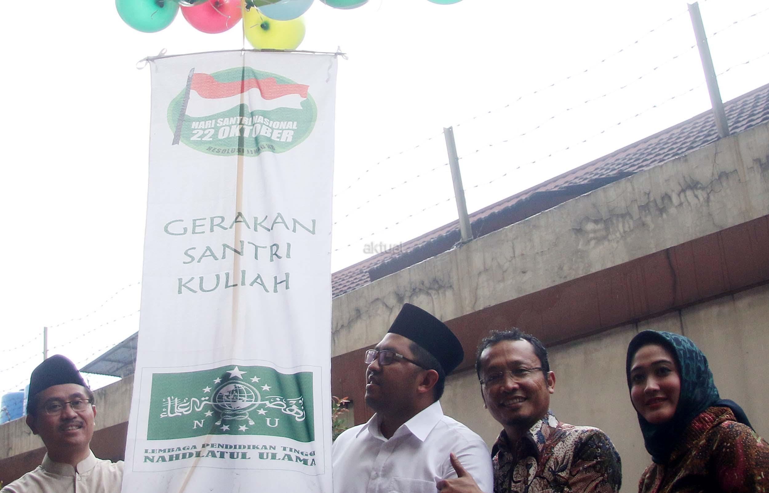 Kiri-kanan; Ketua Panitia Launching Gerakan Santri Kuliah Ahmad Nurul Huda, Bendahara LPTNU Mastuki HS, Sekjen LPTNU Lukmanul Khakim, Wakil Ketua LPTNU Ir. Agus Jui Purmawan, Wakil Sekretaris LPTNU Rina Saadah saat melepas balon dan sekaligus Launching Gerakan Santri Kuliah di Universitas NU, Jakarta, Jumat (21/10/2016). Launching Gerakan Santri Kuliah dan bedah buku “Kebangkitan Santri Cendekia” , dalam Gerakan Santri Kuliah diharapkan tidak boleh ada lagi santri yang tidak melanjutkan kuliah karena tidak mempunyai biaya.