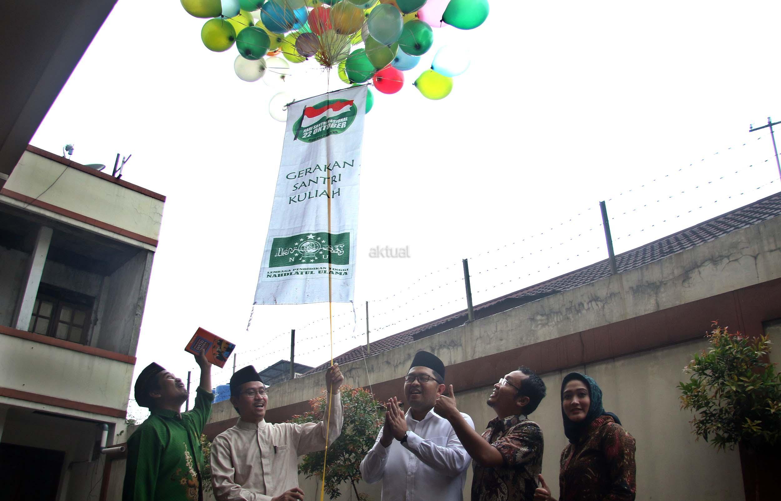 Kiri-kanan; Ketua Panitia Launching Gerakan Santri Kuliah Ahmad Nurul Huda, Bendahara LPTNU Mastuki HS, Sekjen LPTNU Lukmanul Khakim, Wakil Ketua LPTNU Ir. Agus Jui Purmawan, Wakil Sekretaris LPTNU Rina Saadah saat melepas balon dan sekaligus Launching Gerakan Santri Kuliah di Universitas NU, Jakarta, Jumat (21/10/2016). Launching Gerakan Santri Kuliah dan bedah buku "Kebangkitan Santri Cendekia" dalam Gerakan Santri Kuliah diharapkan tidak boleh ada lagi santri yang tidak melanjutkan kuliah karena tidak mempunyai biaya. AKTUAL/Munzir