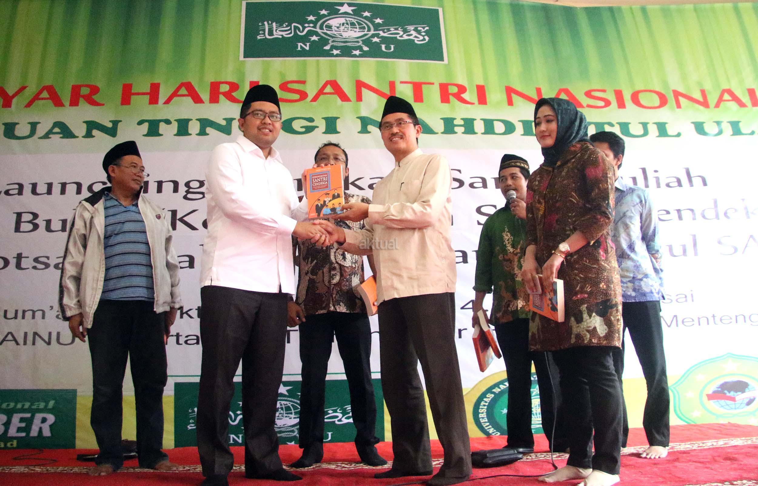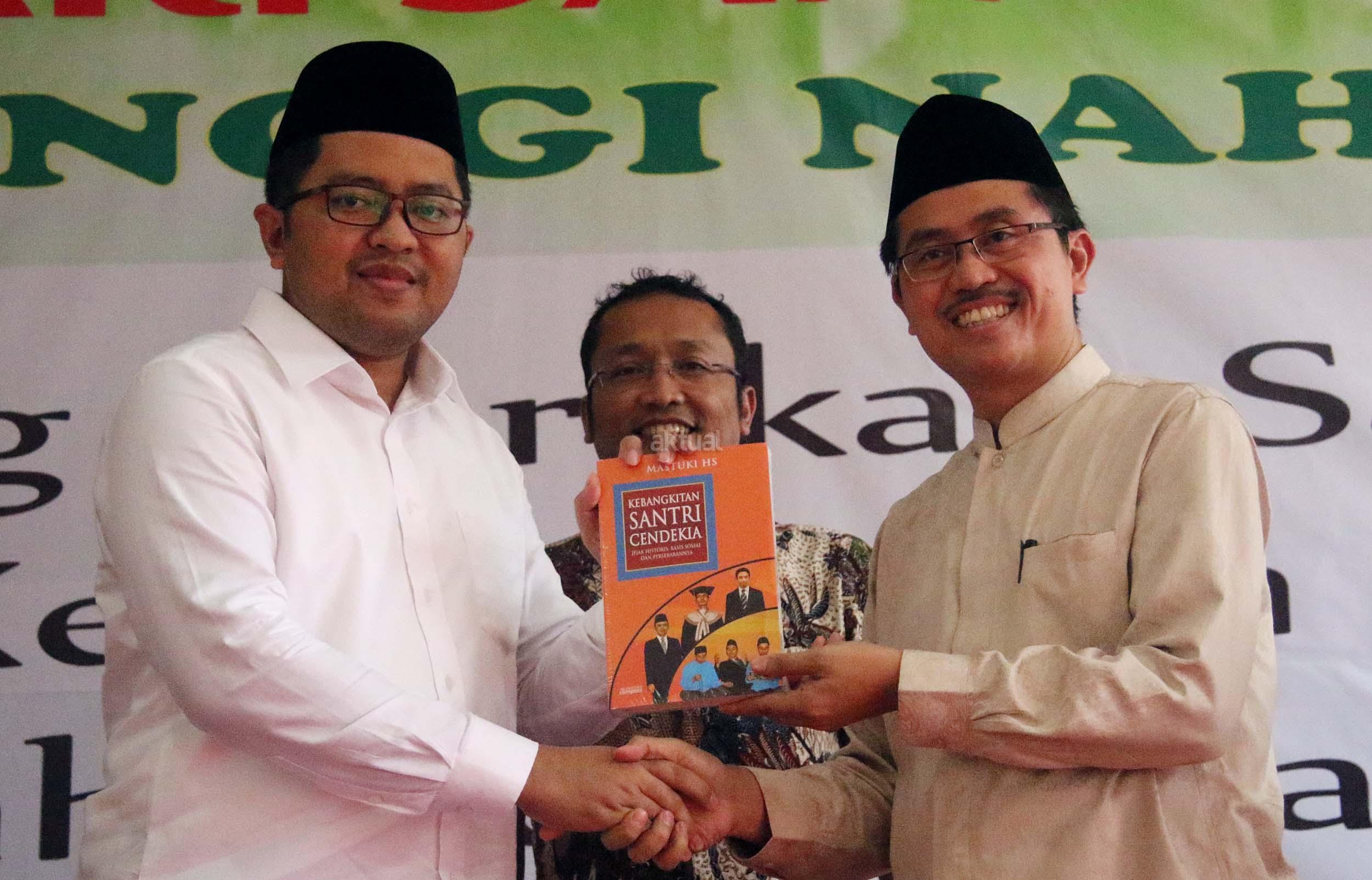 Bendahara Lembaga Perguruan Tinggi Nahdlatul Ulama (LPTNU) Mastuki HS (kanan) memberikan buku kepada Sekjen Lembaga Perguruan Tinggi Nahdlatul Ulama (LPTNU) Lukmanul Khakim (kiri) dalam acara Launching Gerakan Santri Kuliah dan bedah buku “Kebangkitan Santri Cendekia” di Universitas NU, Jakarta, Jumat (21/10/2016). Launching Gerakan Santri Kuliah dan bedah buku “Kebangkitan Santri Cendekia” , dalam Gerakan Santri Kuliah diharapkan tidak boleh ada lagi santri yang tidak melanjutkan kuliah karena tidak mempunyai biaya.