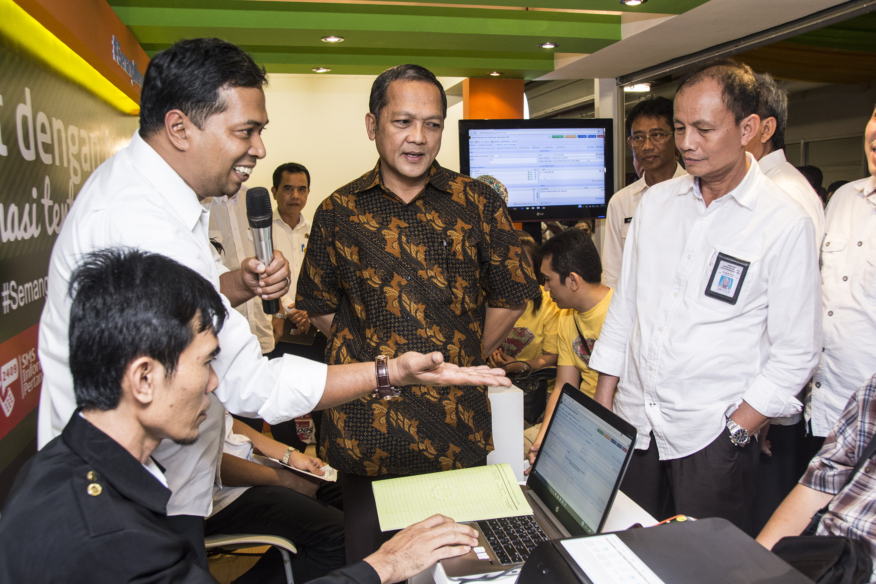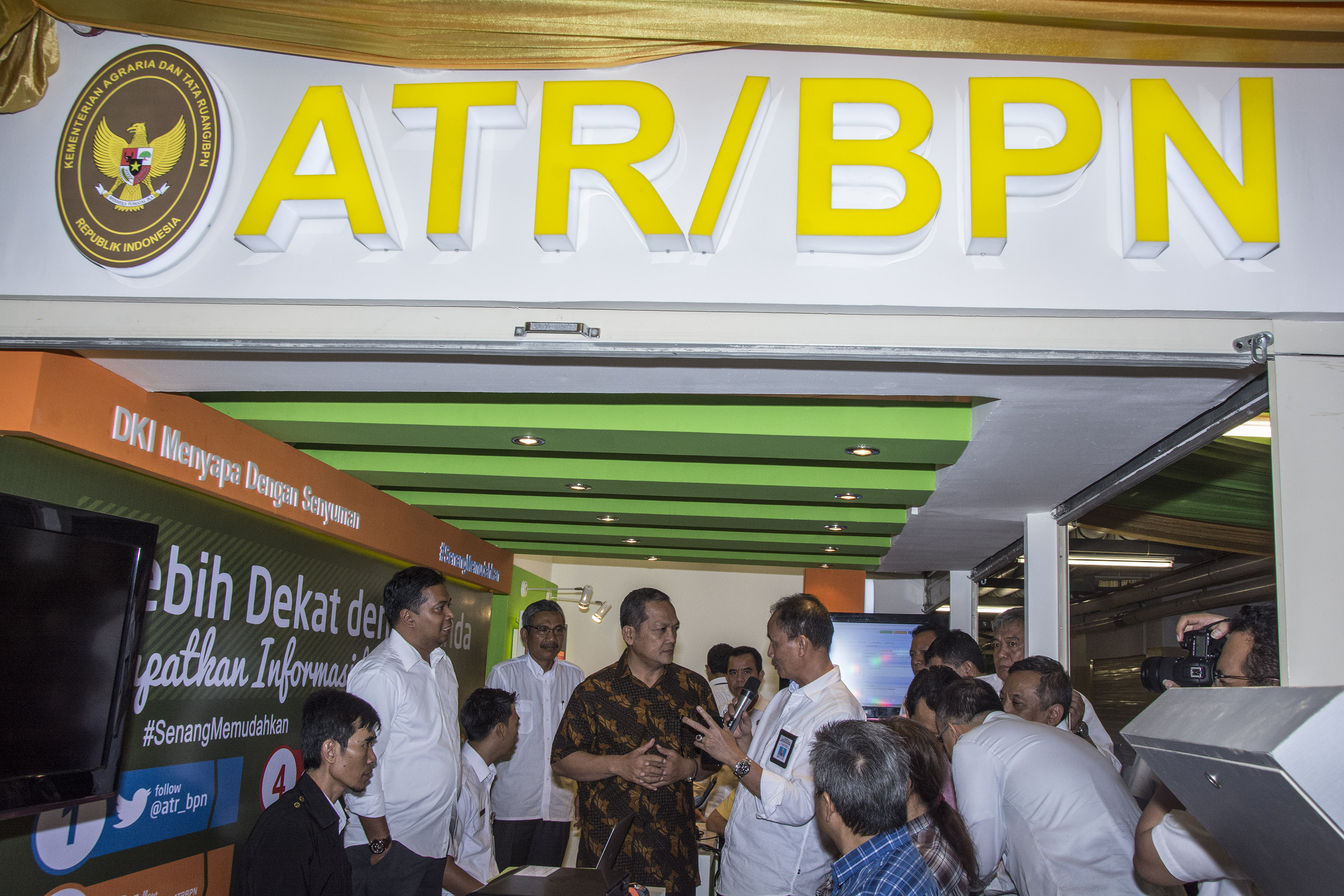 Dirjen Infrastruktur Keagrarian Raden Muhammad Adi Darmawan (tengah) mendengarkan penjelasan mengenai sistem Layanan Pertanahan Terintegrasi se-DKI Jakarta di Jakarta, Kamis (30/6). Layanan tersebut untuk mendekatkan diri dan memudahkan masyarakat dalam mengurus dokumen pertanahan. ANTARA FOTO/Aprillio Akbar/aww/16.