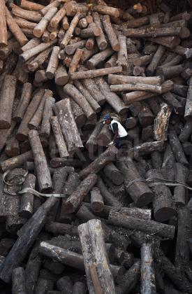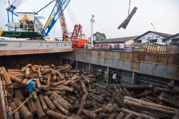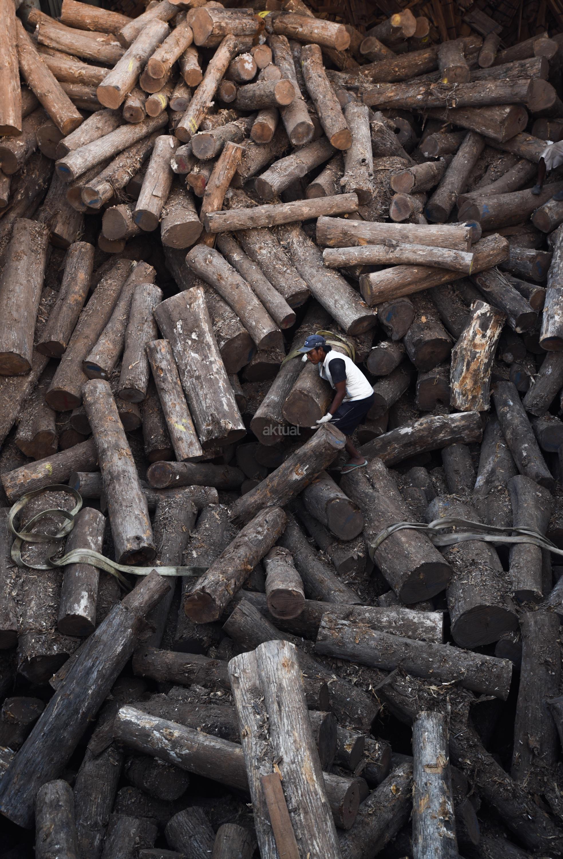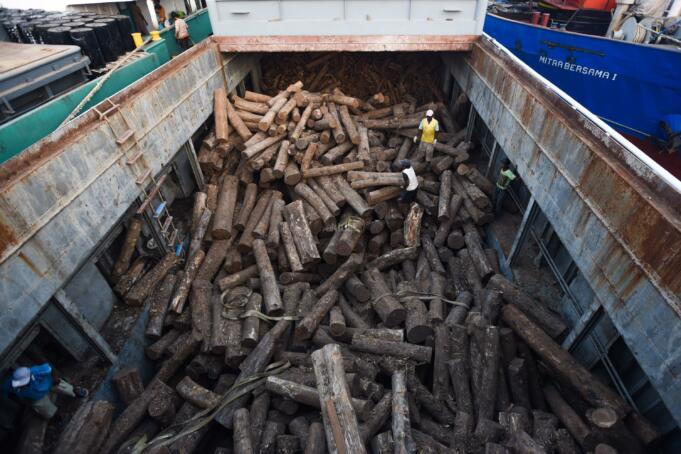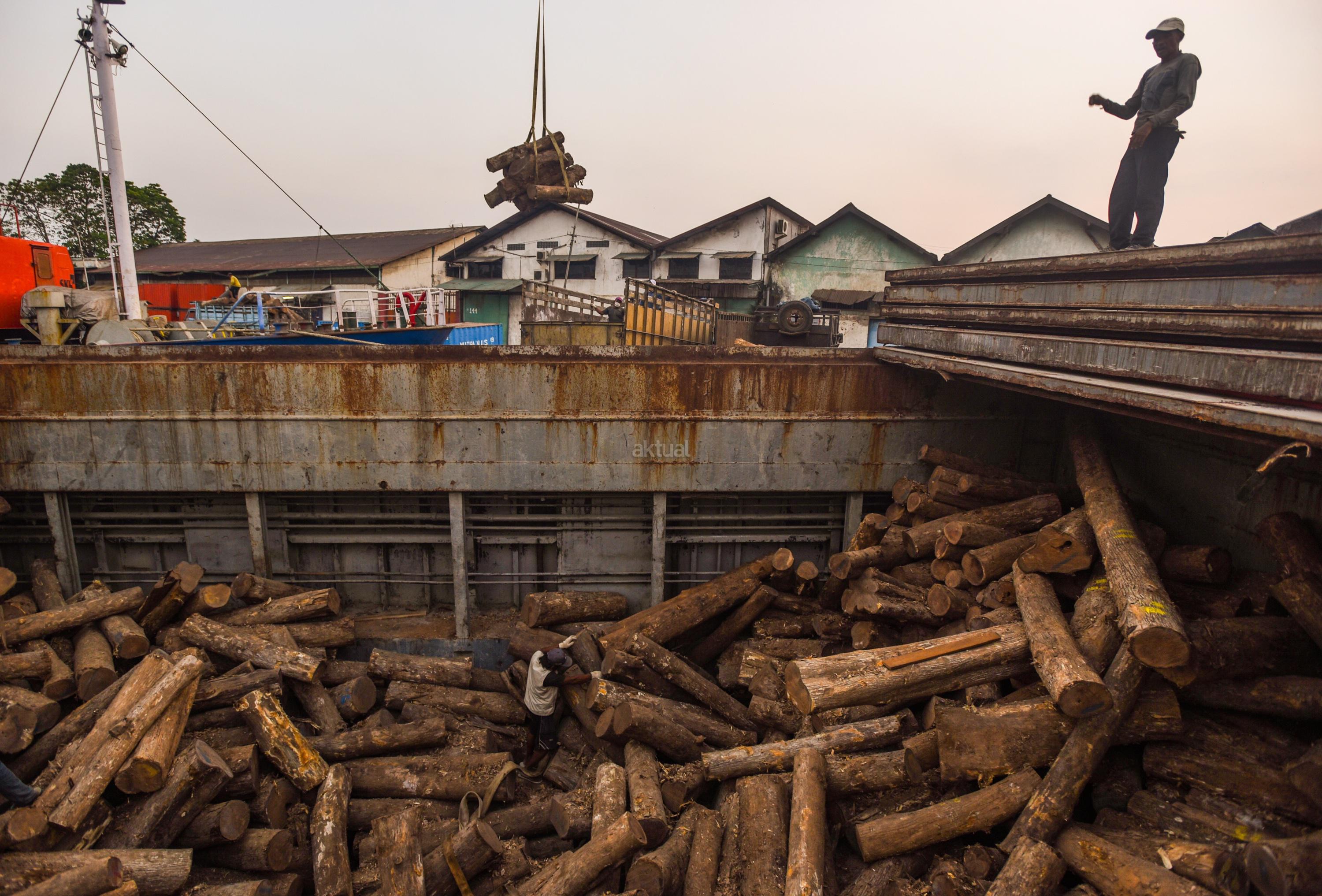 Pekerja memasang tali untuk proses pemuatan kayu gelondongan dari lumbung kapal ke truk saat bongkar muat di Pelabuhan Rakyat Kalomas, Surabaya, Kawa Timur, Senin (29/6). Berdasarkan data sistem informasi legalitas kayu (SILK) Kementerian Lingkungan Hidup dan Kehutanan bahwa sejak berlakunya persyaratan sertifikat sistem verifikasi legalitas kayu (SVLK) bagi eksportir produk industri kehutanan pada 1 Januari 2013 tercatat produk industri kehutanan telah diekspor ke 194 negara tujuan dan akan bertambah ke seluruh negara di Uni Eropa apabila telah disepakati perjanjian antara Indonesia dengan Uni Eropa. ANTARA FOTO/Zabur Karuru/ss/kye/15