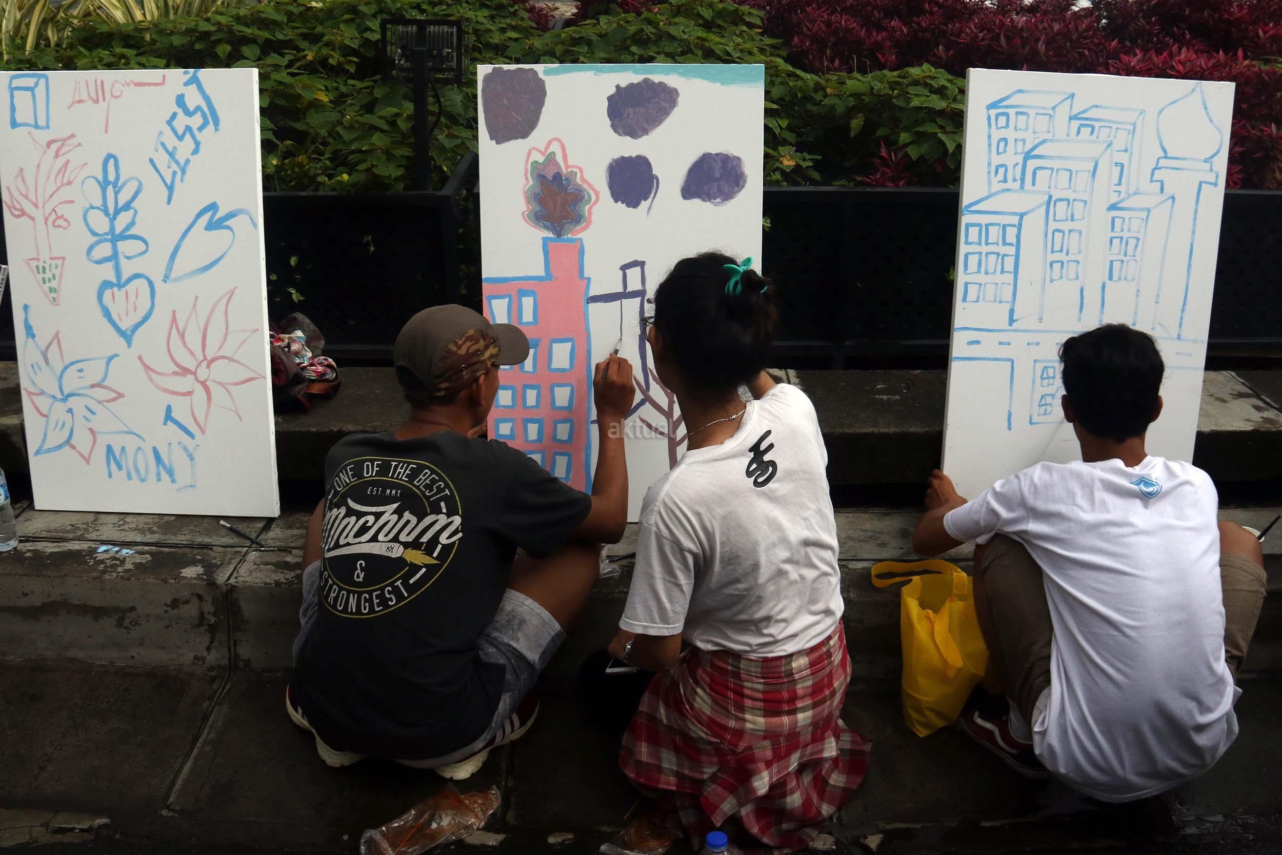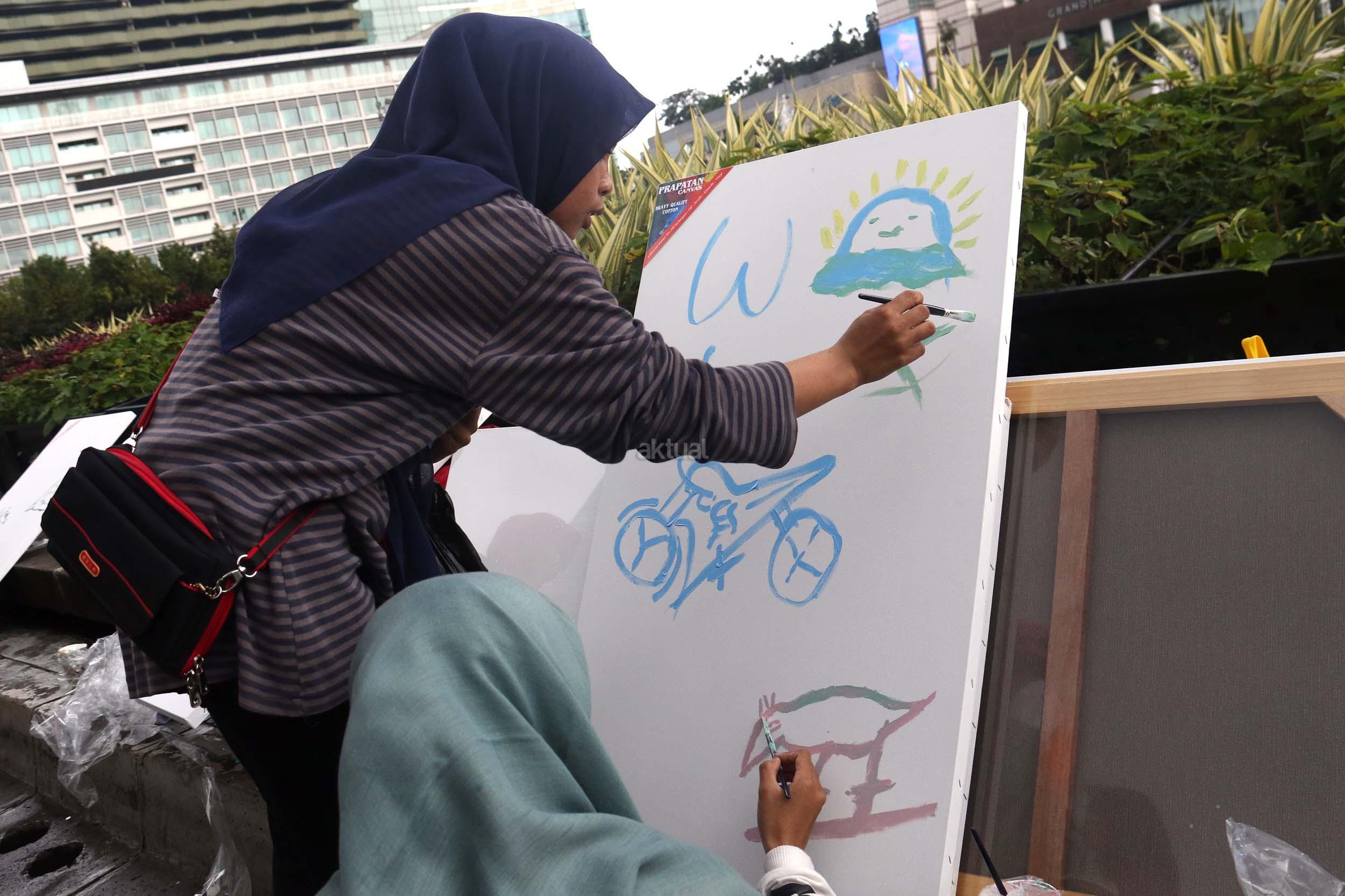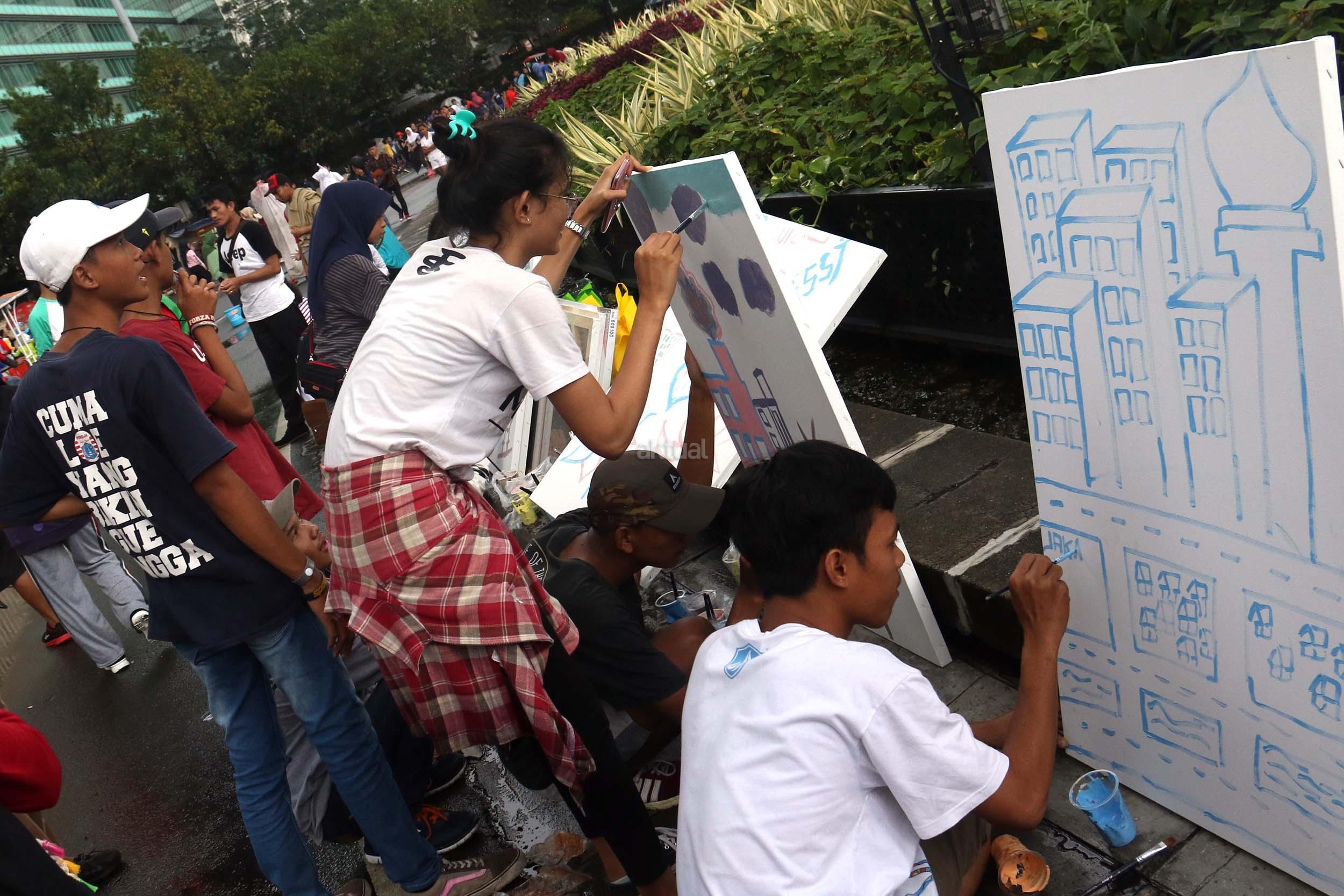 Para pengunjung CFD mengikuti aksi melukis di kanvas di kawasan Bundaran HI, Jakarta, Minggu (12/2/2017). Aksi yang digelar oleh Greenpeace itu untuk mengenalkan masyarakat tentang sadar polusi.