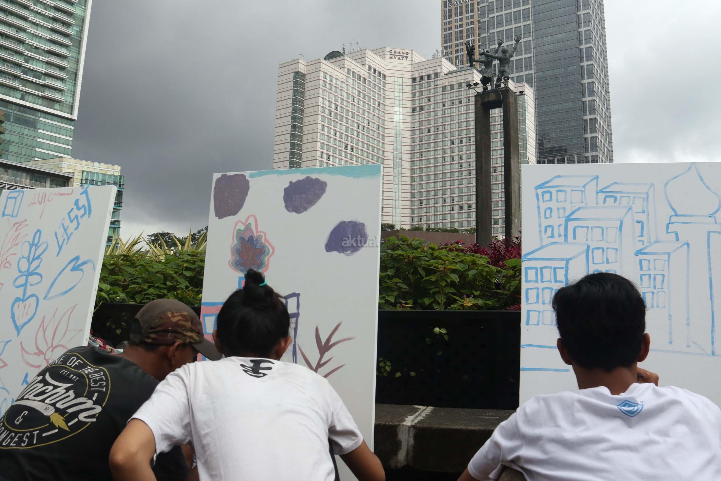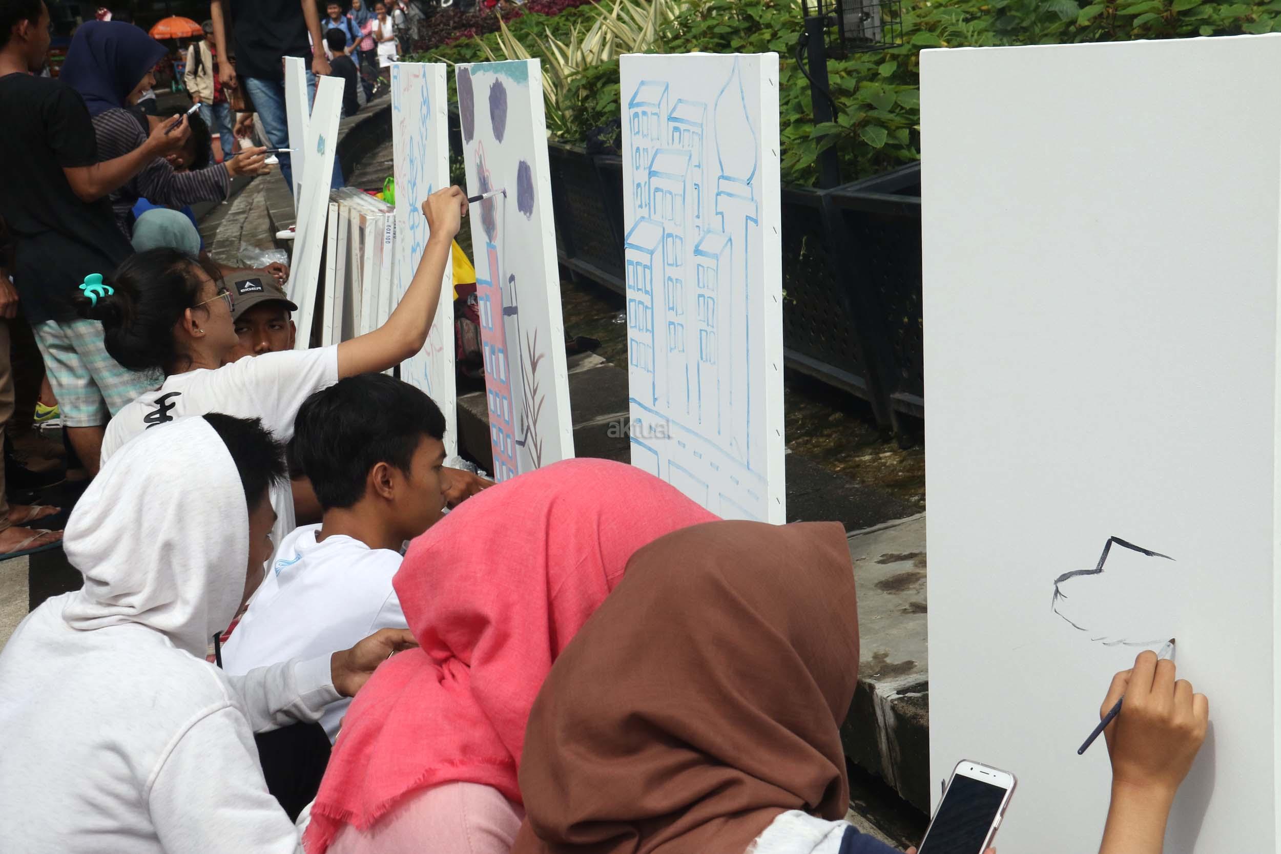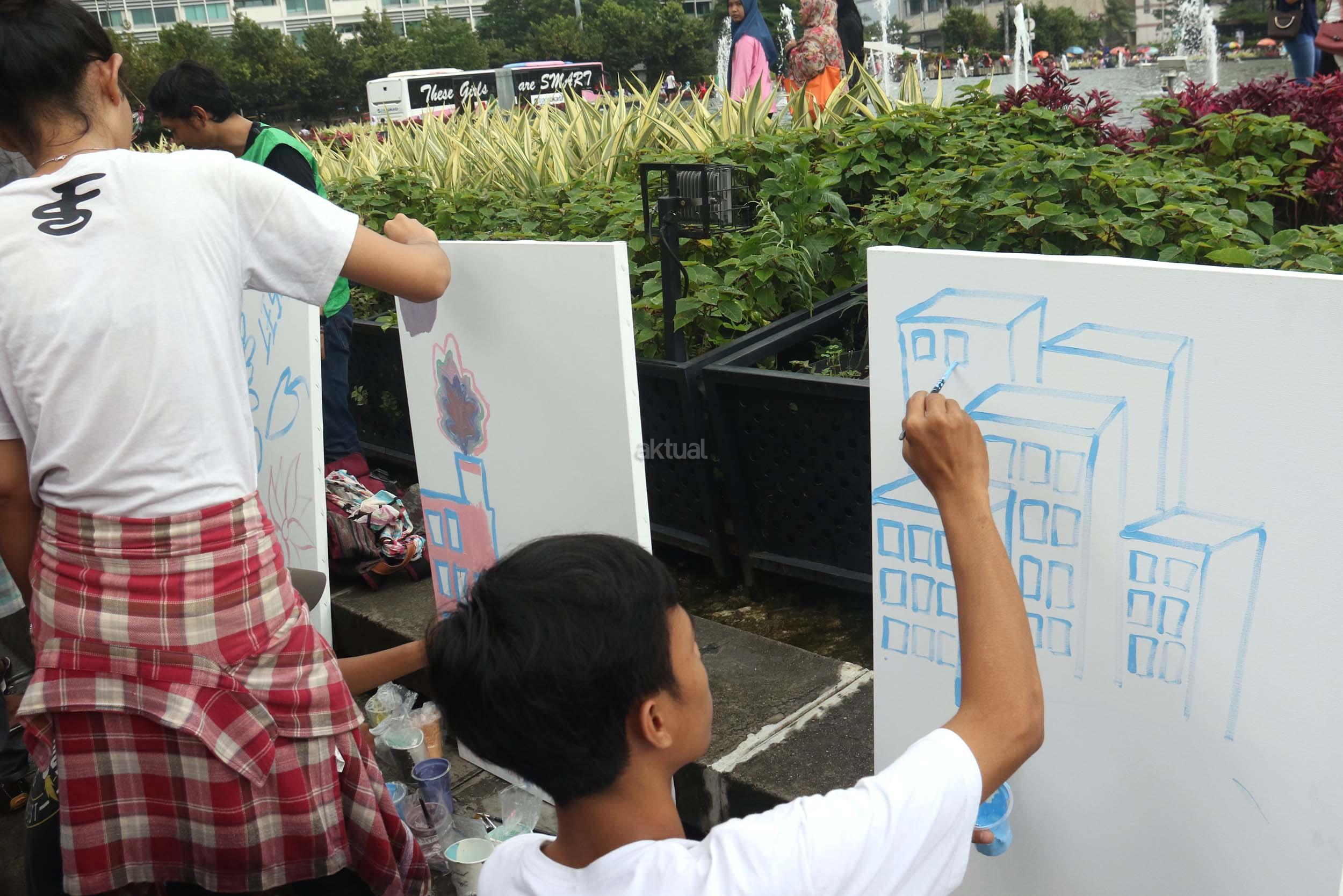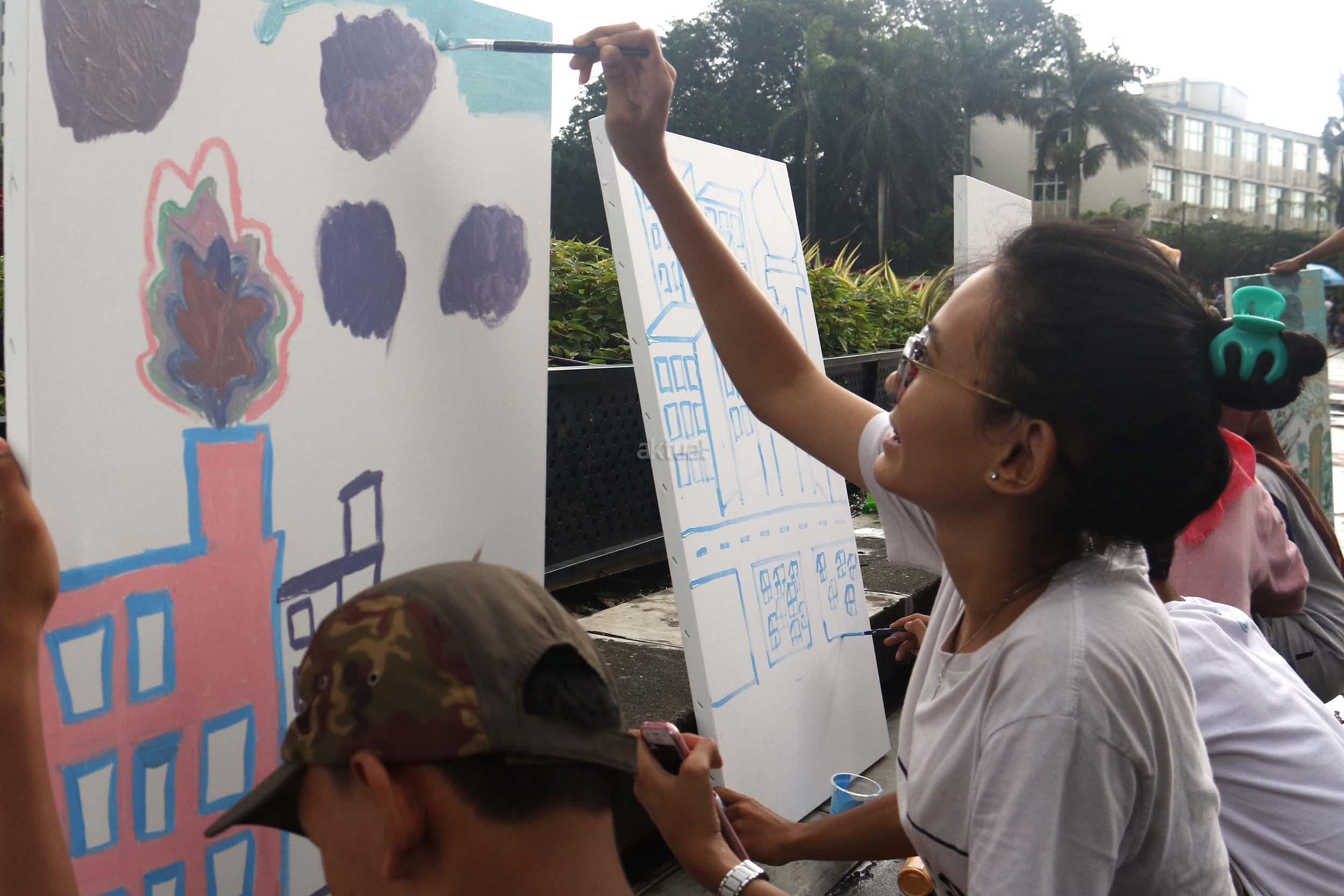 Para pengunjung CFD mengikuti aksi melukis di kanvas di kawasan Bundaran HI, Jakarta, Minggu (12/2/2017). Aksi yang digelar oleh Greenpeace itu untuk mengenalkan masyarakat tentang sadar polusi.