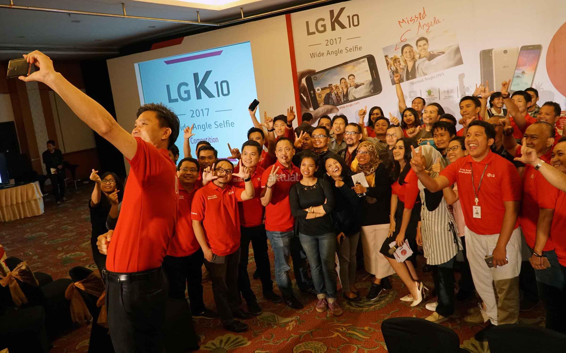 Head Of LG Mobile Communication Indonesia, Heegyun Jang (kedua dari kiri) melakukan selfie mengunakan Smartphone Selfie dengan bidang tangkap dari lensa kamera depan (wide angle selfie camera) yang mencapai 120 derajat saat peluncurannya di Jakarta, Rabu (29/3). Pabrikan asal Korea Selatan tersebut akhirnya mengumumkan kehadiran smartphone LG K10 2017 bagi pasar Indonesia. Smartphone yang memiliki kemampuan kamera depan memiliki bentang tangkap lebar tersebut tersedia dalam dua pilihan warna yaitu hitam dan kemasan dan ditawarkan dengan tingkat harga Rp 2.749.000. AKTUAL/Eko S Hilman