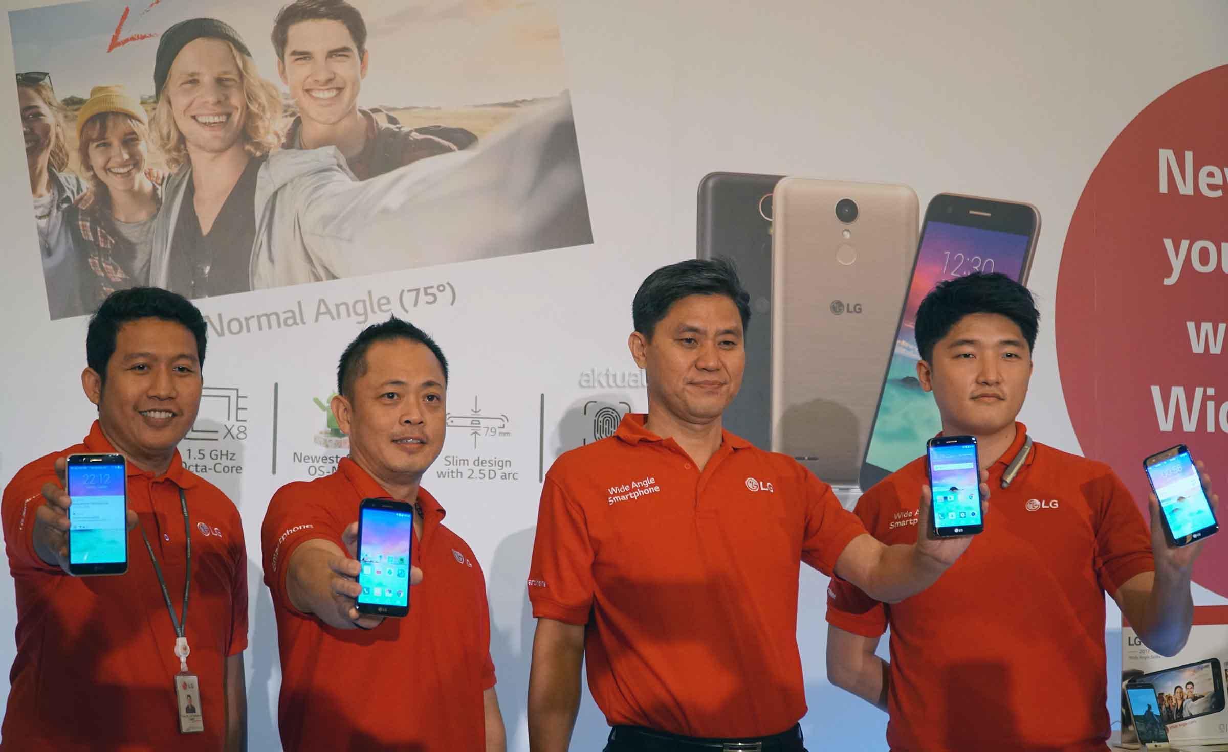 (dari kiri ke kanan) Product Specialist Of LG Mobile Communication Indonesia, Rezy Sadam, Head Of Sales & Marketing LG Mobile Communication Indonesia, Oky Gunawan, Head Of LG Mobile Communication Indonesia, Heegyun Jang, serta Assistant Project Manager& Product Marketing Head of LG Mobile Communication Indonesia, Lee Joe Hyung memperlihatkan Smartphone Selfie dengan bidang tangkap dari lensa kamera depan (wide angle selfie camera) yang mencapai 120 derajat saat peluncurannya di Jakarta, Rabu (29/3). Pabrikan asal Korea Selatan tersebut akhirnya mengumumkan kehadiran smartphone LG K10 2017 bagi pasar Indonesia. Smartphone yang memiliki kemampuan kamera depan memiliki bentang tangkap lebar tersebut tersedia dalam dua pilihan warna yaitu hitam dan kemasan dan ditawarkan dengan tingkat harga Rp 2.749.000. AKTUAL/Eko S Hilman