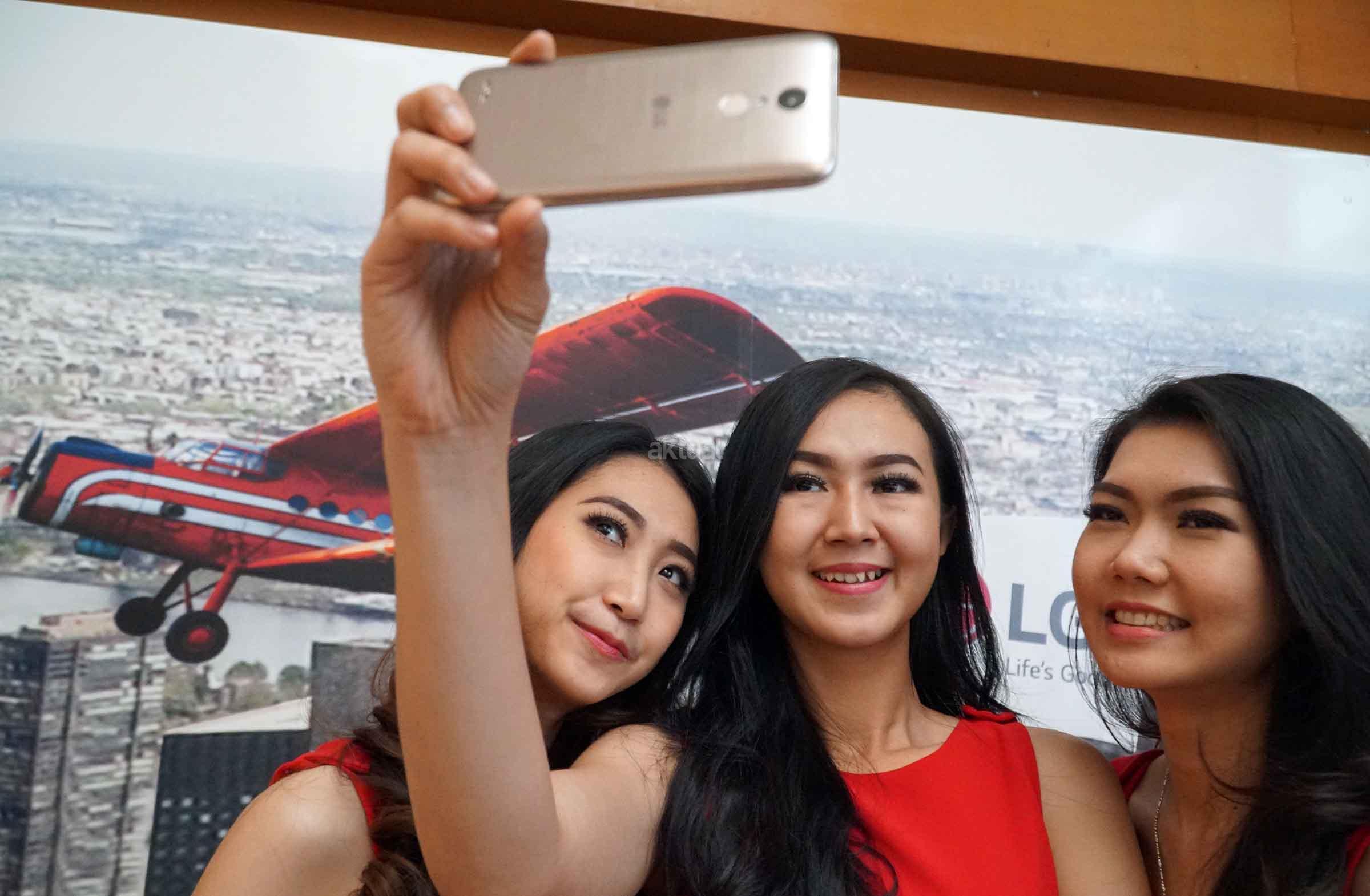 Model peraga melakukan selfie dengan mengunakan Smartphone Selfie dengan bidang tangkap dari lensa kamera depan (wide angle selfie camera) yang mencapai 120 derajat saat peluncurannya di Jakarta, Rabu (29/3). Pabrikan asal Korea Selatan tersebut akhirnya mengumumkan kehadiran smartphone LG K10 2017 bagi pasar Indonesia. Smartphone yang memiliki kemampuan kamera depan memiliki bentang tangkap lebar tersebut tersedia dalam dua pilihan warna yaitu hitam dan kemasan dan ditawarkan dengan tingkat harga Rp 2.749.000. AKTUAL/Eko S Hilman