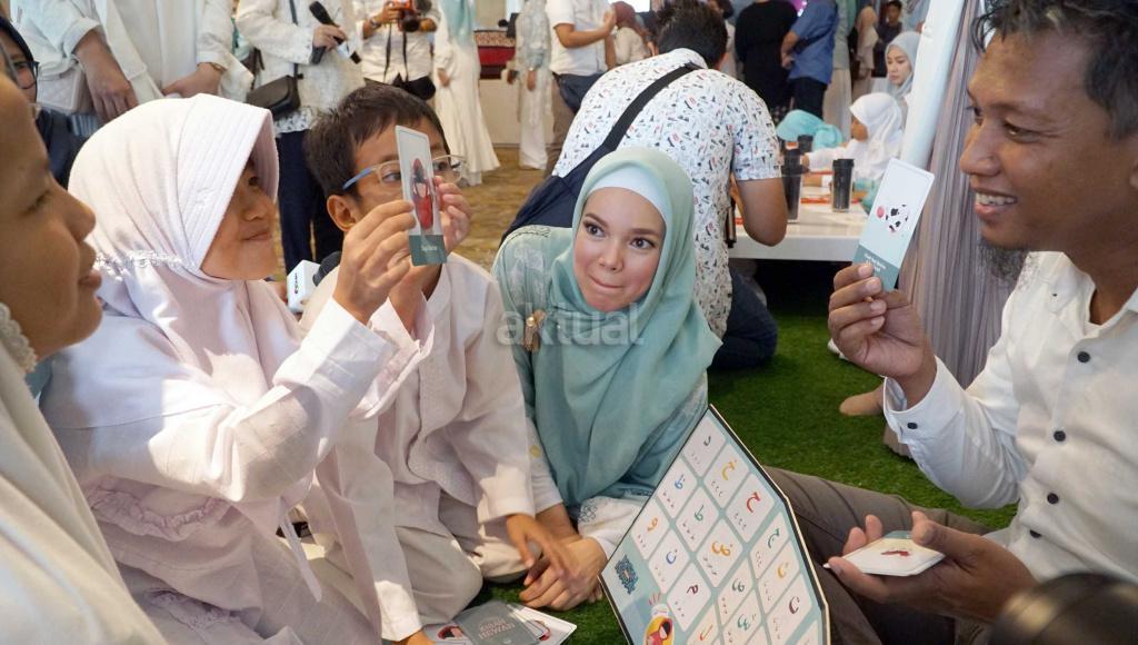 Brand Ambassador Wardah Dewi Sandra dan Zaskia Sungkar terlibat dalam kegiatan bermain dan belajar bersama anak anak tuli dari The Little Hijabi saat penyelenggaraan Kampanye #SelaluBersyukur Wardah di Jakarta, Kamis (16/5). AKTUAL/Eko S Hilman