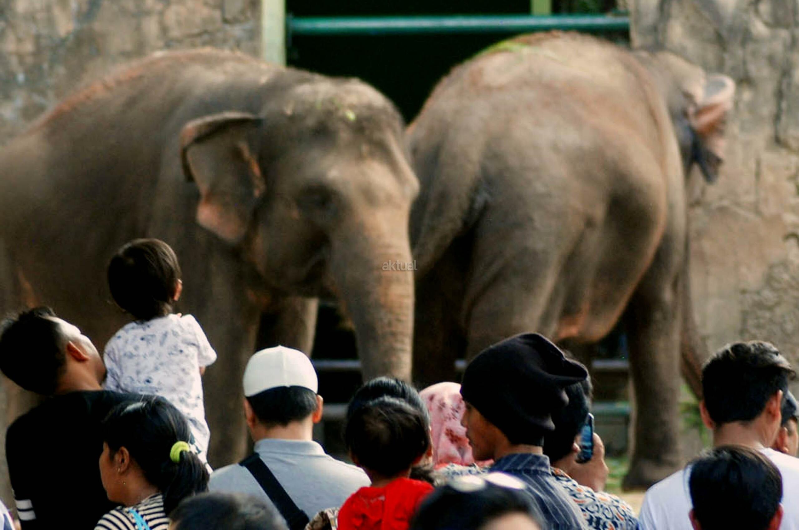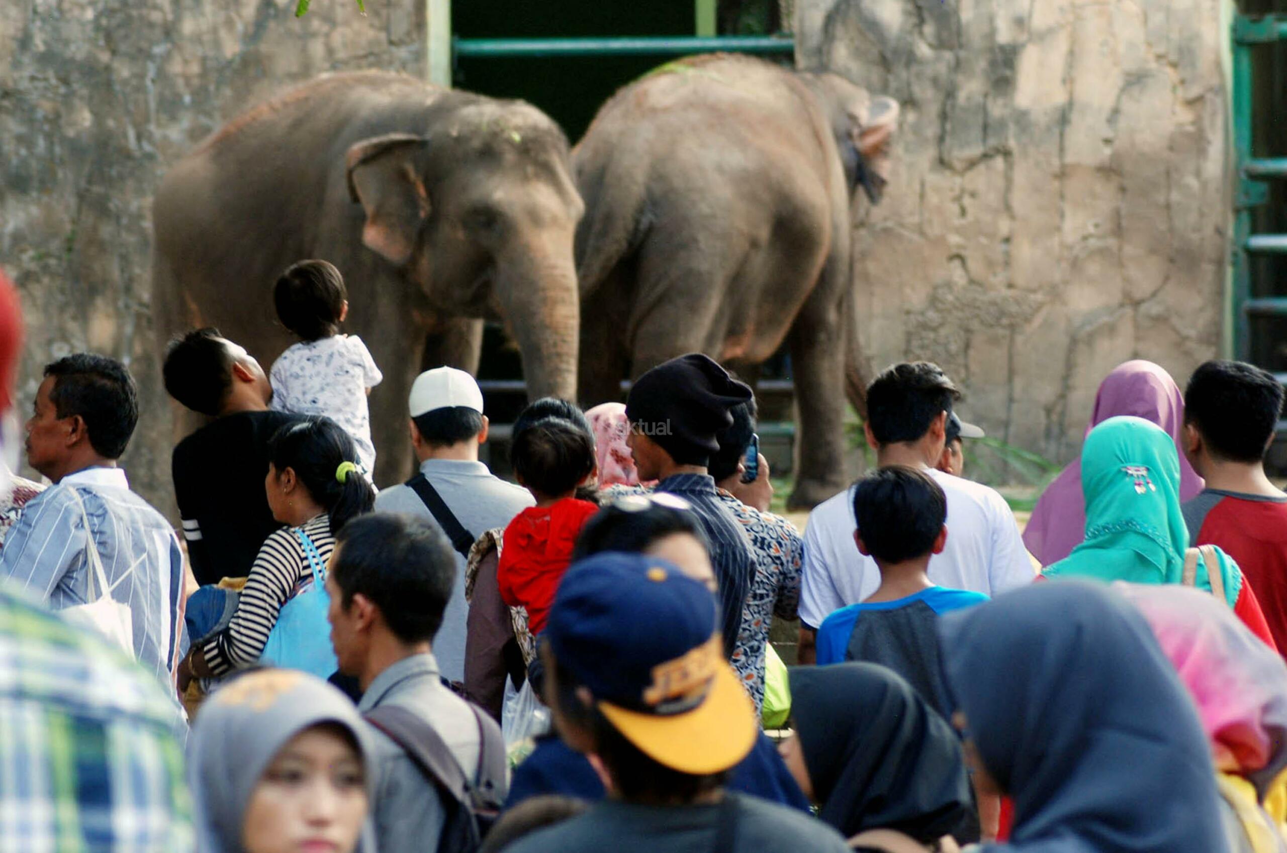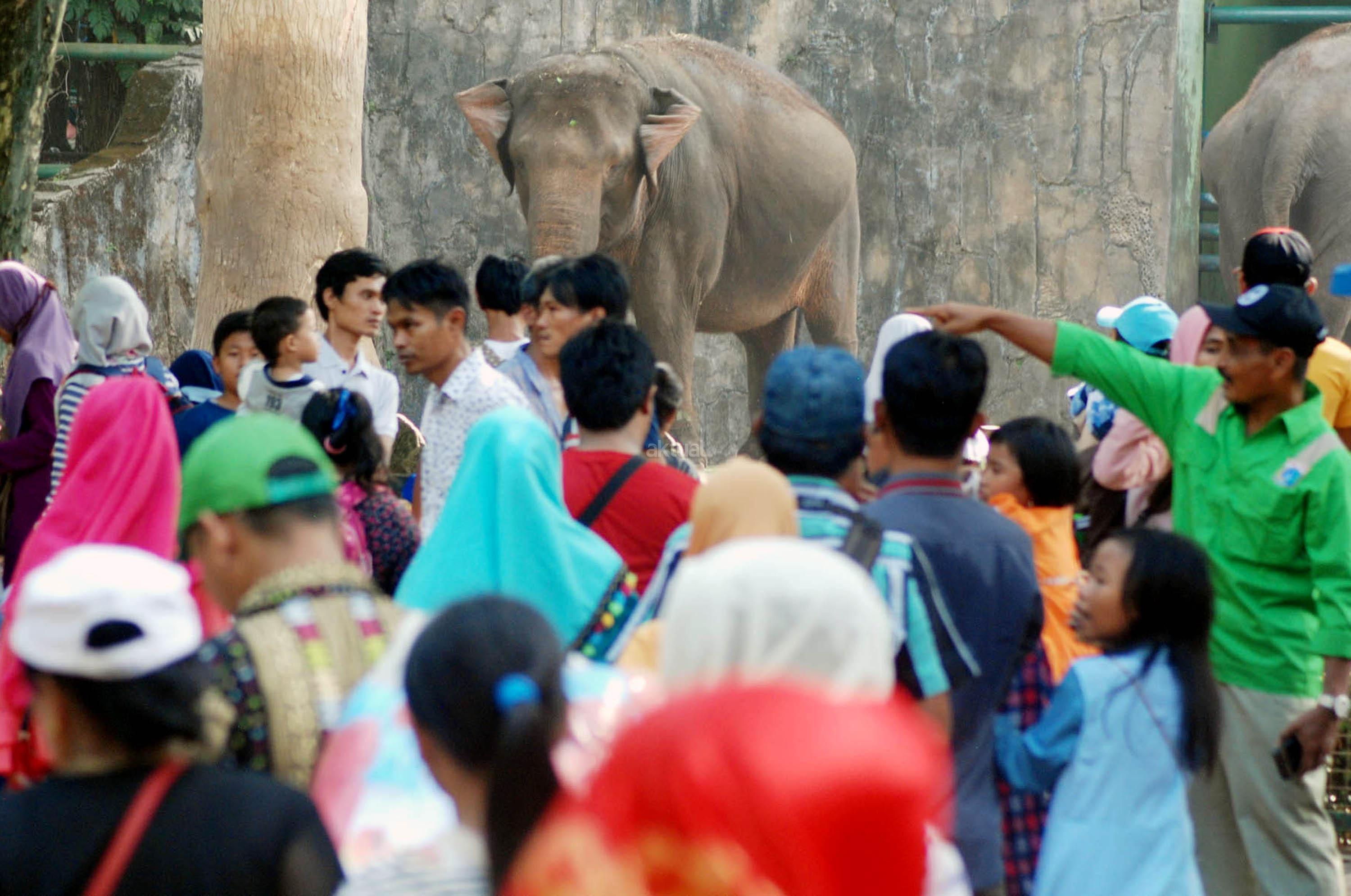 Wisatawan mengamati Gajah Sumatra saat berlibur di Taman Margasatwa Ragunan, Jakarta, Kamis (29/6/2017). Pada libur Hari Raya Idulfitri 1438 H warga Jakarta dan sekitarnya memanfaatkannya untuk berkunjung ke sejumlah tempat wisata termasuk Taman Margasatwa Ragunan. AKTUAL/Munzir