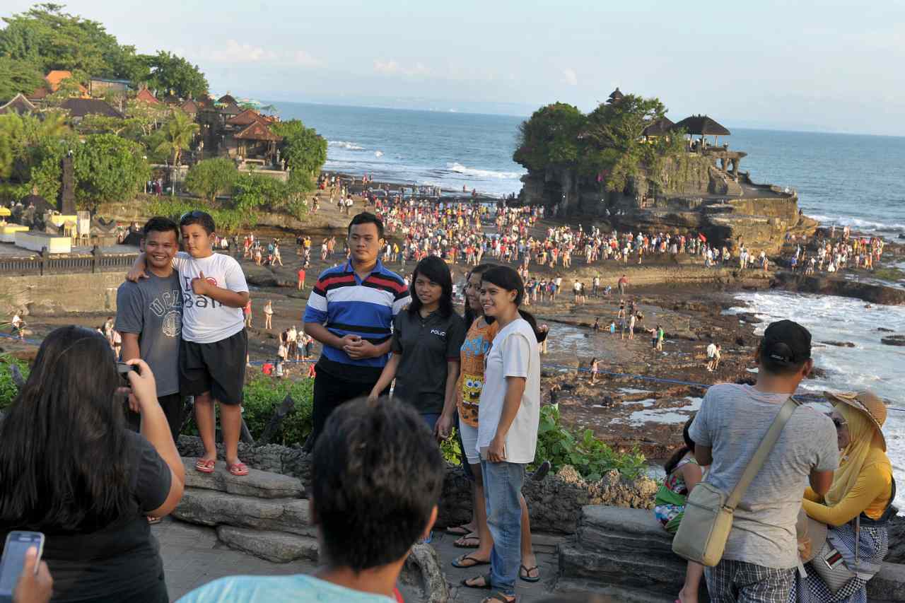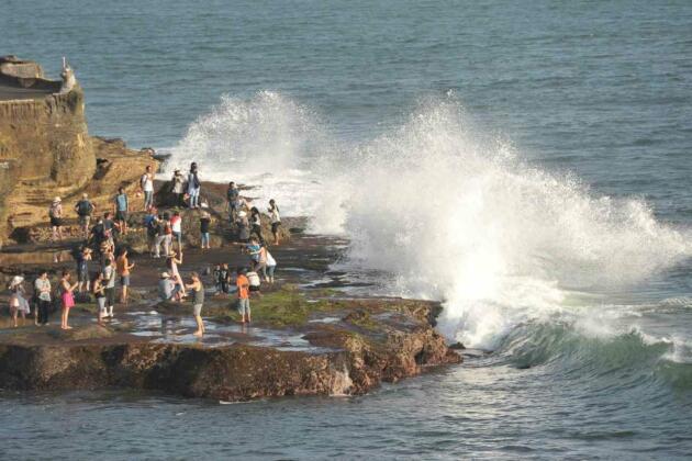 Sejumlah wisatawan menikmati deburan ombak di obyek wisata Tanah Lot, Tabanan, Bali, Jumat (8/7). Selama liburan Idul Fitri 1437 H kunjungan wisatawan ke Tanah Lot meningkat mencapai 16 ribu orang per hari dari biasanya rata-rata 10 ribu orang per hari. ANTARA FOTO/Nyoman Budhiana/kye/16.