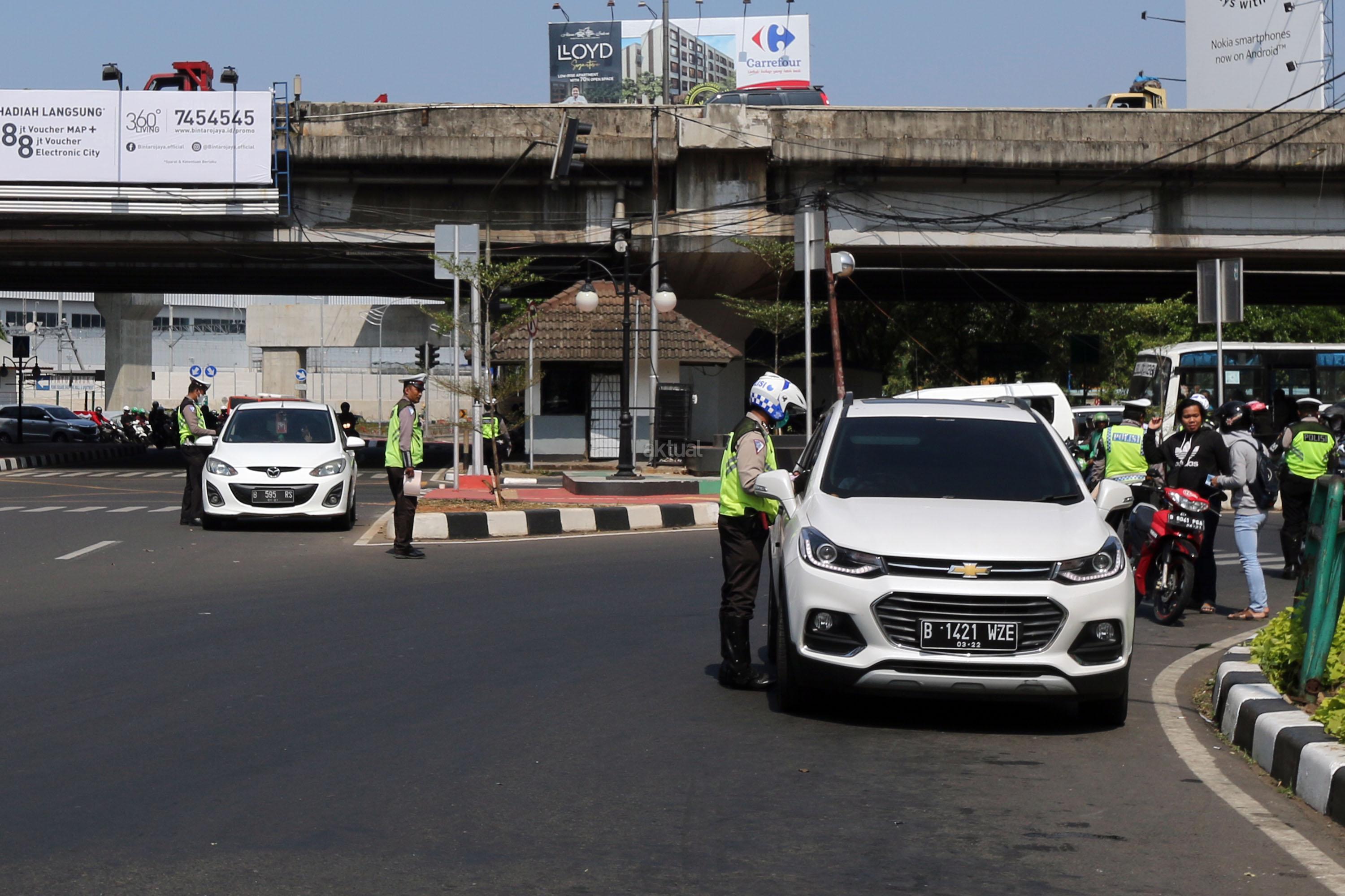 Petugas Kepolisain memberhentikan mobil berpelat nomor ganjil saat pemberlakuan sistem ganjil genap di kawasan Lebak Bulus, Jalan Kartini, Jakarta, Senin (6/8/2018). Pemberlakuan sistem ganjil genap di kawasan lebak bulus diwarnai dengan penilangan puluhan mobil. Pengendara yang melanggar langsung dikenakan sanksi sebesar Rp 500 ribu. AKTUAL/Tino Oktaviano