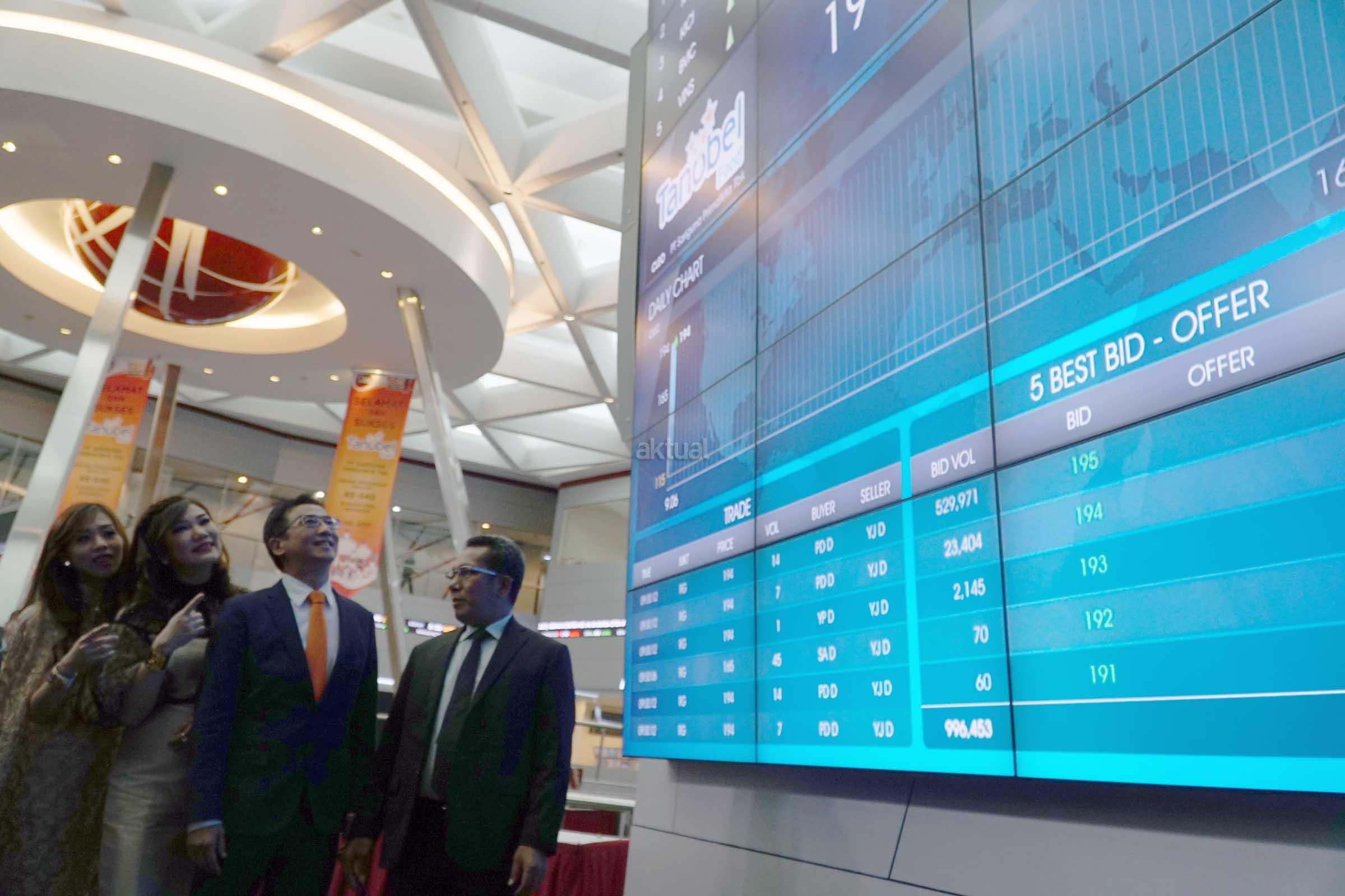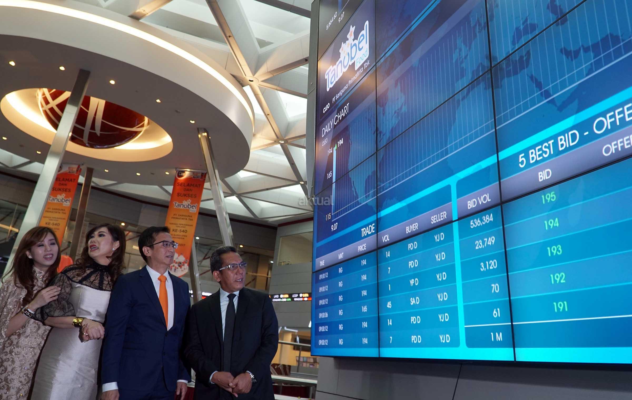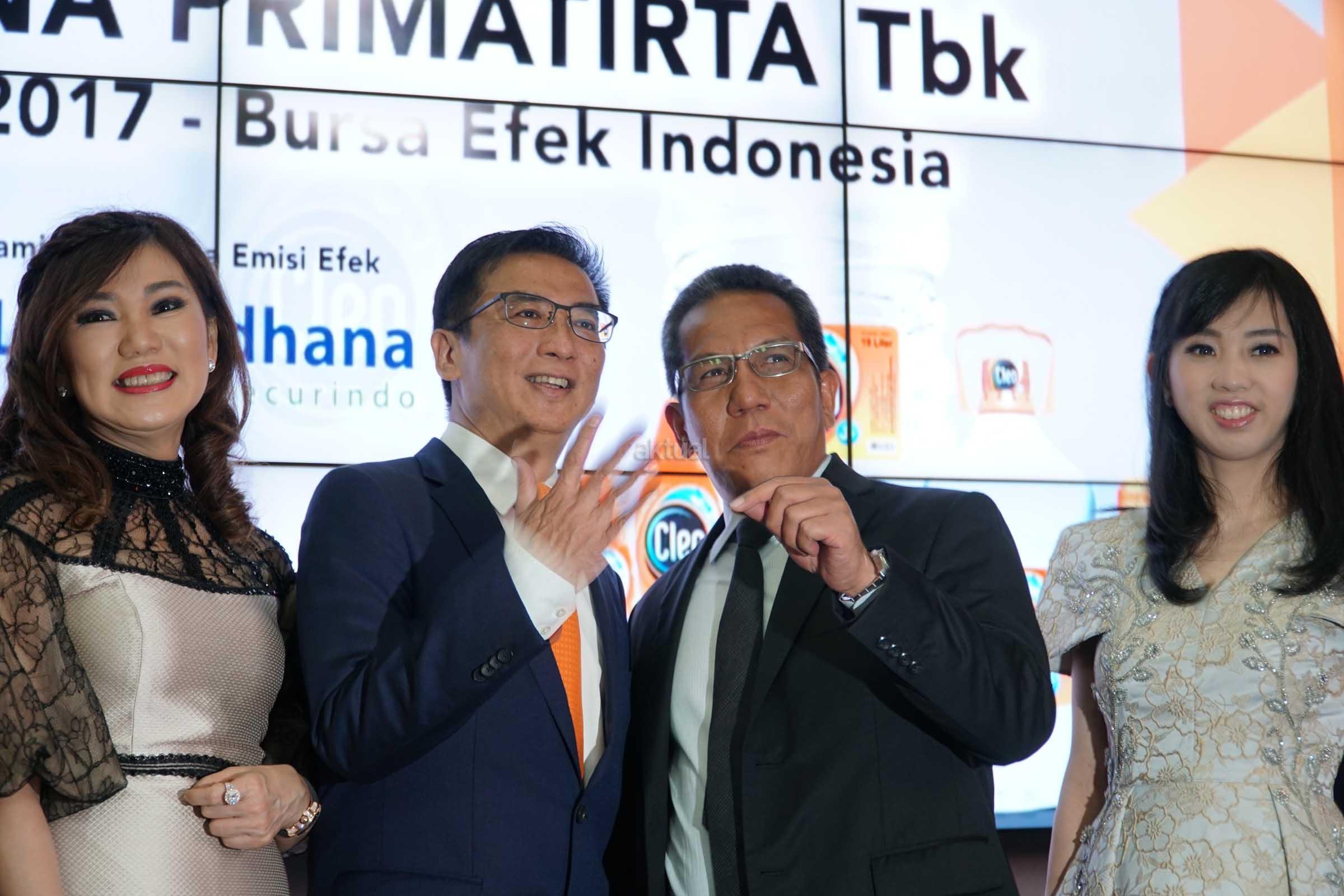 Komisaris Utama PT Sariguna Primatirta Tbk, Hermanto Tanoko (kedua dari kanan) didampingi Founder, Sanderawati Joesoef serta Direktur BEI, Samsul Hidayat serta Diektur Utama, Belinda Natalia (kiri) memantau pergerakan saham melalui monitor saham seusai pembukaan dan pencatatan saham perdana di Main Hall, Bursa Efek Indonesia,Jakarta, Jumat (5/5).Produsen air minum dalam kemasan Cleo mencatatkan dan diperdagangkan di BEI sebagai emiten ke 5 dan emiten ke 540 di tahun 2017 dengan kode saham CLEO dan pada tahap awal ditetapkan dengan harga Rp 115 per lembar saham.Saham yang dilepas kepada publik mencapai 450 juta lembar saham dengan dana hasil IPO yang diraih sebesar Rp 51.750.000.000.Saham Cleo mengalami kelebihan permintaan atau over subsribed sebesar 2,95 kali dari seluruh saham yang ditawarkan.Hasil dana dari pelepasan saham ini sekitar 95% akan digunakan untuk pengembangan usaha dan sisanya sekitar 5% akan digunakan untuk modal kerja. AKTUAL/Eko S Hilman
