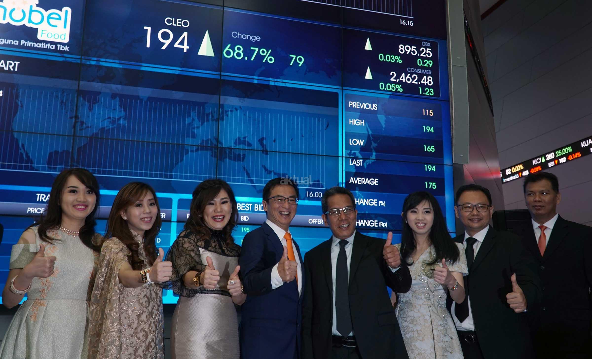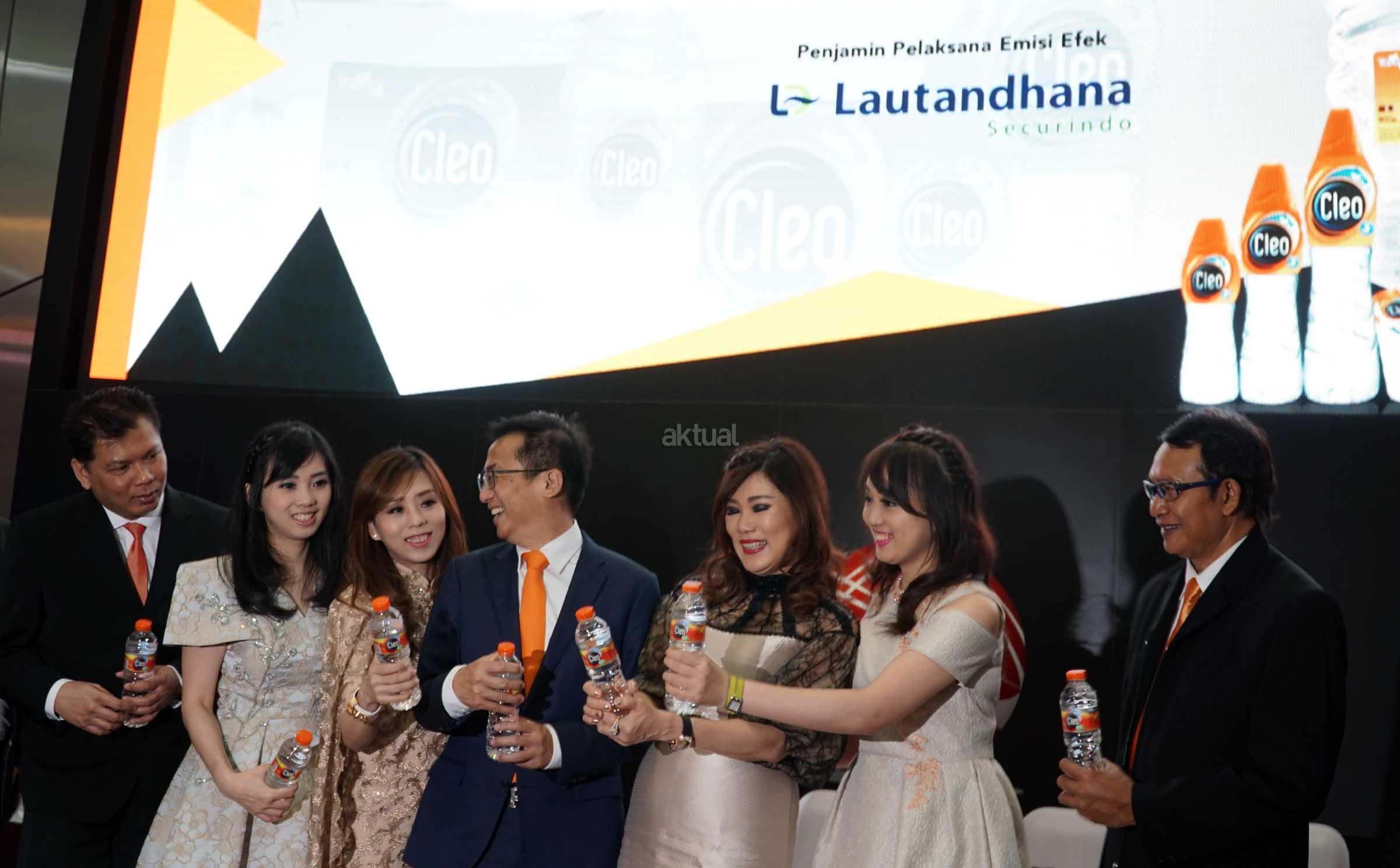 (dari kiri ke kanan) Direktur Keuangan& Corporate Secretary PT Sariguna Primatirta Tbk, Lukas Setio, Komisaris, Ida Bagus Oka Nila, Direktur Operasional,Eko Susilo,Komisaris, Caroline Novilia, Wakil Direktur Utama, Melisa Patricia, Direktur Utama, Belinda Natalia, Founder, Sanderawati Joesoef, Komisaris Utama, Hermanto Tanoko, Direktur BEI, Samsul Hidayat, Direktur BEI, Alpino Kianjaya serta Direktur PT Lautandhana Securindo sebagai penjamin emisi,Effendi A Irawan menyaksikan bersama sama dan menekan secara simbolis layar sentuh menandai pembukaan dan pencatatan saham perdana di Main Hall, Bursa Efek Indonesia,Jakarta, Jumat (5/5).Produsen air minum dalam kemasan Cleo mencatatkan dan diperdagangkan di BEI sebagai emiten ke 5 dan emiten ke 540 di tahun 2017 dengan kode saham CLEO dan pada tahap awal ditetapkan dengan harga Rp 115 per lembar saham.Saham yang dilepas kepada publik mencapai 450 juta lembar saham dengan dana hasil IPO yang diraih sebesar Rp 51.750.000.000.Saham Cleo mengalami kelebihan permintaan atau over subsribed sebesar 2,95 kali dari seluruh saham yang ditawarkan.Hasil dana dari pelepasan saham ini sekitar 95% akan digunakan untuk pengembangan usaha dan sisanya sekitar 5% akan digunakan untuk modal kerja. AKTUAL/Eko S Hilman
