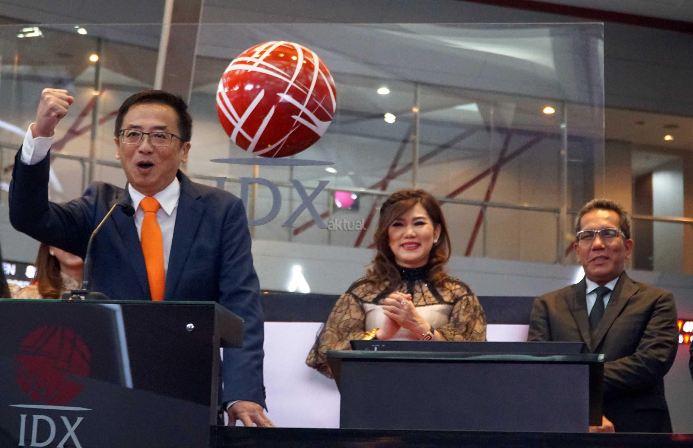 Komisaris Utama PT Sariguna Primatirta Tbk, Hermanto Tanoko (kiri) didampingi Founder, Sanderawati Joesoef serta Direktur BEI, Samsul Hidayat memberikan sambutan menandai pembukaan dan pencatatan saham perdana di Main Hall, Bursa Efek Indonesia,Jakarta, Jumat (5/5).Produsen air minum dalam kemasan Cleo mencatatkan dan diperdagangkan di BEI sebagai emiten ke 5 dan emiten ke 540 di tahun 2017 dengan kode saham CLEO dan pada tahap awal ditetapkan dengan harga Rp 115 per lembar saham.Saham yang dilepas kepada publik mencapai 450 juta lembar saham dengan dana hasil IPO yang diraih sebesar Rp 51.750.000.000.Saham Cleo mengalami kelebihan permintaan atau over subsribed sebesar 2,95 kali dari seluruh saham yang ditawarkan.Hasil dana dari pelepasan saham ini sekitar 95% akan digunakan untuk pengembangan usaha dan sisanya sekitar 5% akan digunakan untuk modal kerja. AKTUAL/Eko S Hilman