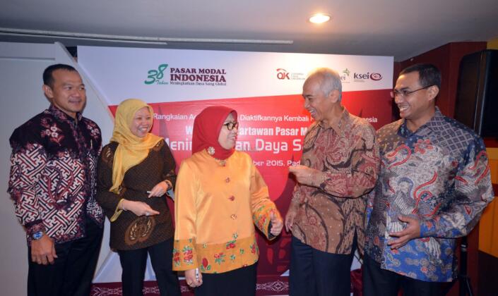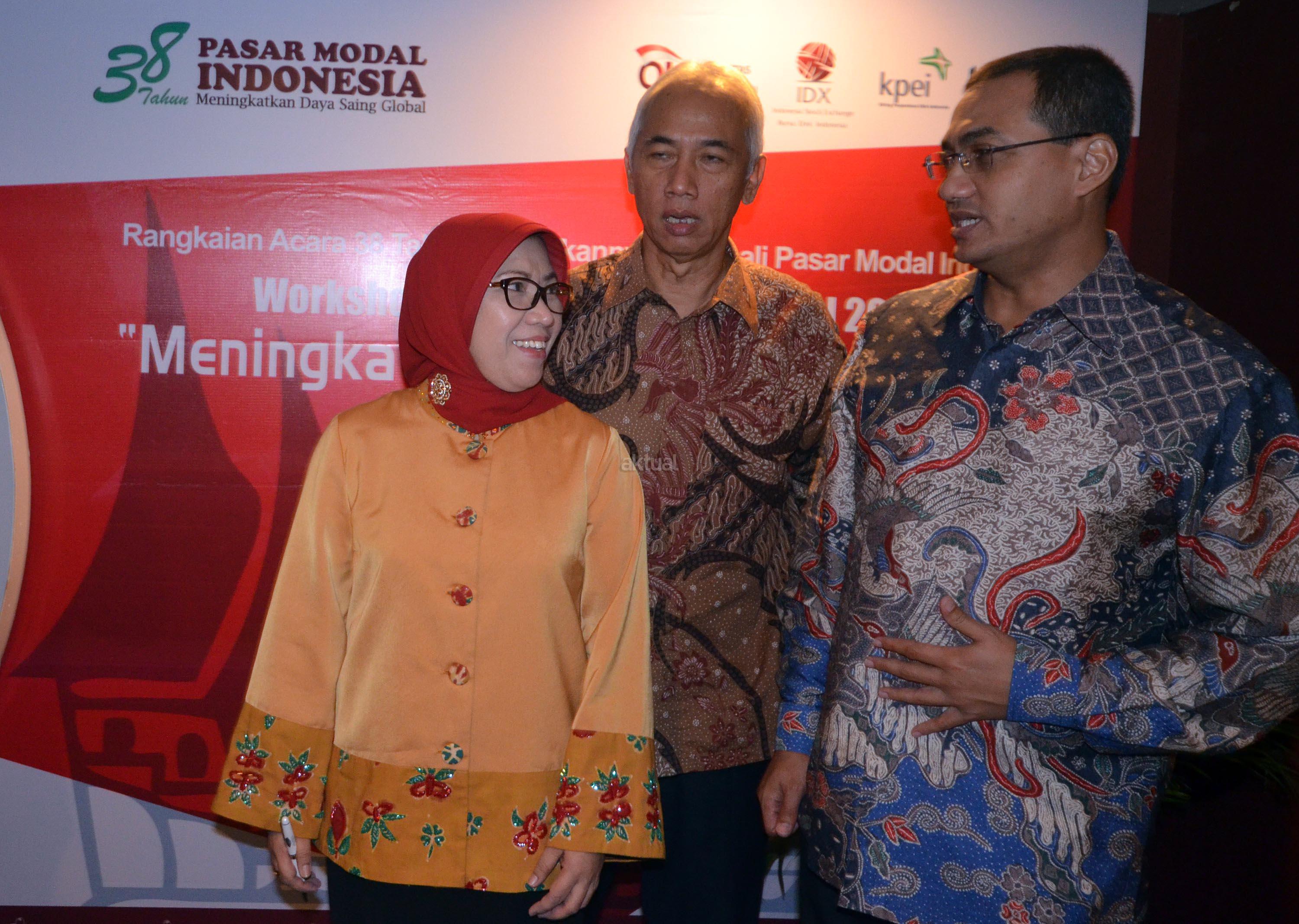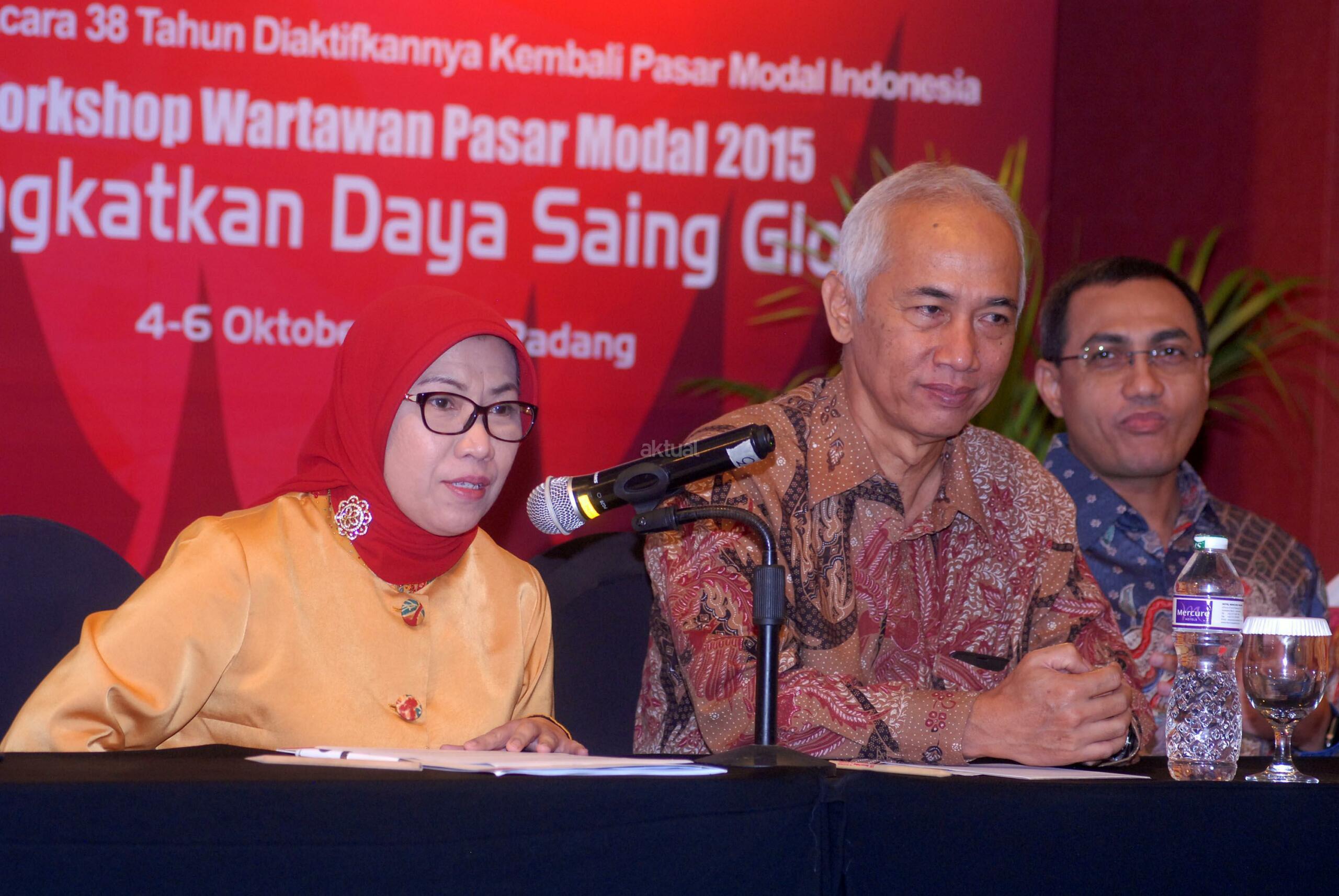 Kepala Eksekutif Pengawas Pasar Modal OJK, Nurhaida (kiri) didampingi Deputi Komisioner Pengawas Pasar Modal II OJK, Nur Rahman serta Dirut KPEI, Hasan Fawzi usai menyampaikan materi workshop Media Pasar Modal 2015 mengenai "Global Master Repurchase Agreement (GMRA) dan Pengembangan Instruktur Pasar Surat Utang di Padang, Sumatera Barat, (5/10). Kegiatan yang merupakan rangkaian 38 Tahun Diaktifkannya kembali Pasar modal Indonesia tersebut selain workshop juga diisi berbagai kegiatan berupa Bussiness Gathering, Forum Calon Investor, Roadshow kampus to campus, dan Peresmian Galeri investasi BEI Universitas Putra Indonesia YPTK Padang sebagai galeri ke 141 diseluruh Indonesia atau yang ke 25 yang diresmikan tahun 2015 ini. AKTUAL/EKO S HILMAN