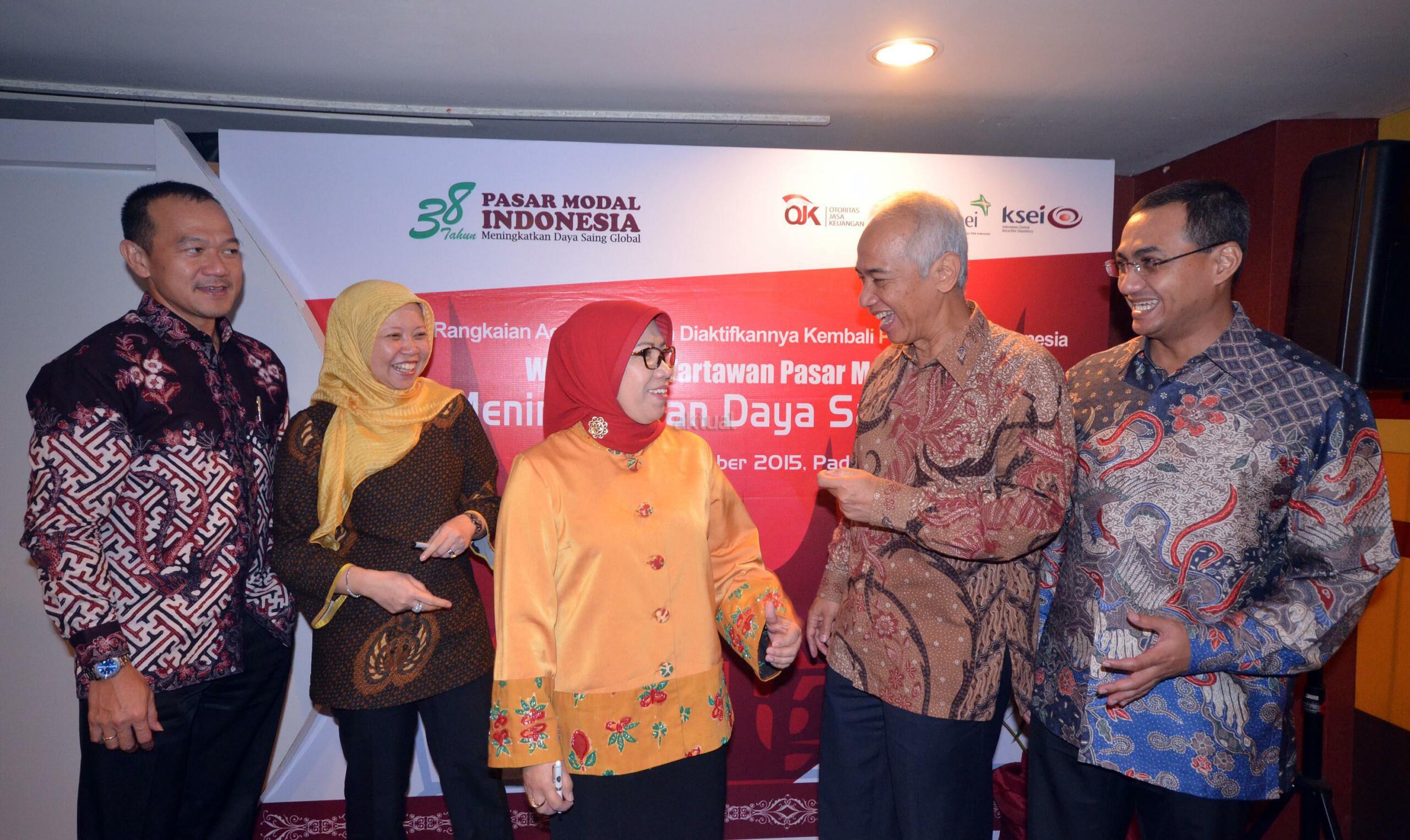 Kepala Eksekutif Pengawas Pasar Modal OJK, Nurhaida (tengah) bersama dengan antara lain Direktur Pengembangan Bursa Efek Indonesia, Nicky Hogan, Kepala Departemen Pengawas Pasar Modal II B OJK, Yunita Linda Sari , Deputi Komisioner Pengawas Pasar Modal II OJK, Nur Rahman serta Dirut KPEI, Hasan Fawzi berfoto bersama usai menyampaikan materi workshop Media Pasar Modal 2015 mengenai "Global Master Repurchase Agreement (GMRA) dan Pengembangan Instruktur Pasar Surat Utang di Padang, Sumatera Barat, (5/10). Kegiatan yang merupakan rangkaian 38 Tahun Diaktifkannya kembali Pasar modal Indonesia tersebut selain workshop juga diisi berbagai kegiatan berupa Bussiness Gathering, Forum Calon Investor, Roadshow kampus to campus, dan Peresmian Galeri investasi BEI Universitas Putra Indonesia YPTK Padang sebagai galeri ke 141 diseluruh Indonesia atau yang ke 25 yang diresmikan tahun 2015 ini. AKTUAL/EKO S HILMAN
