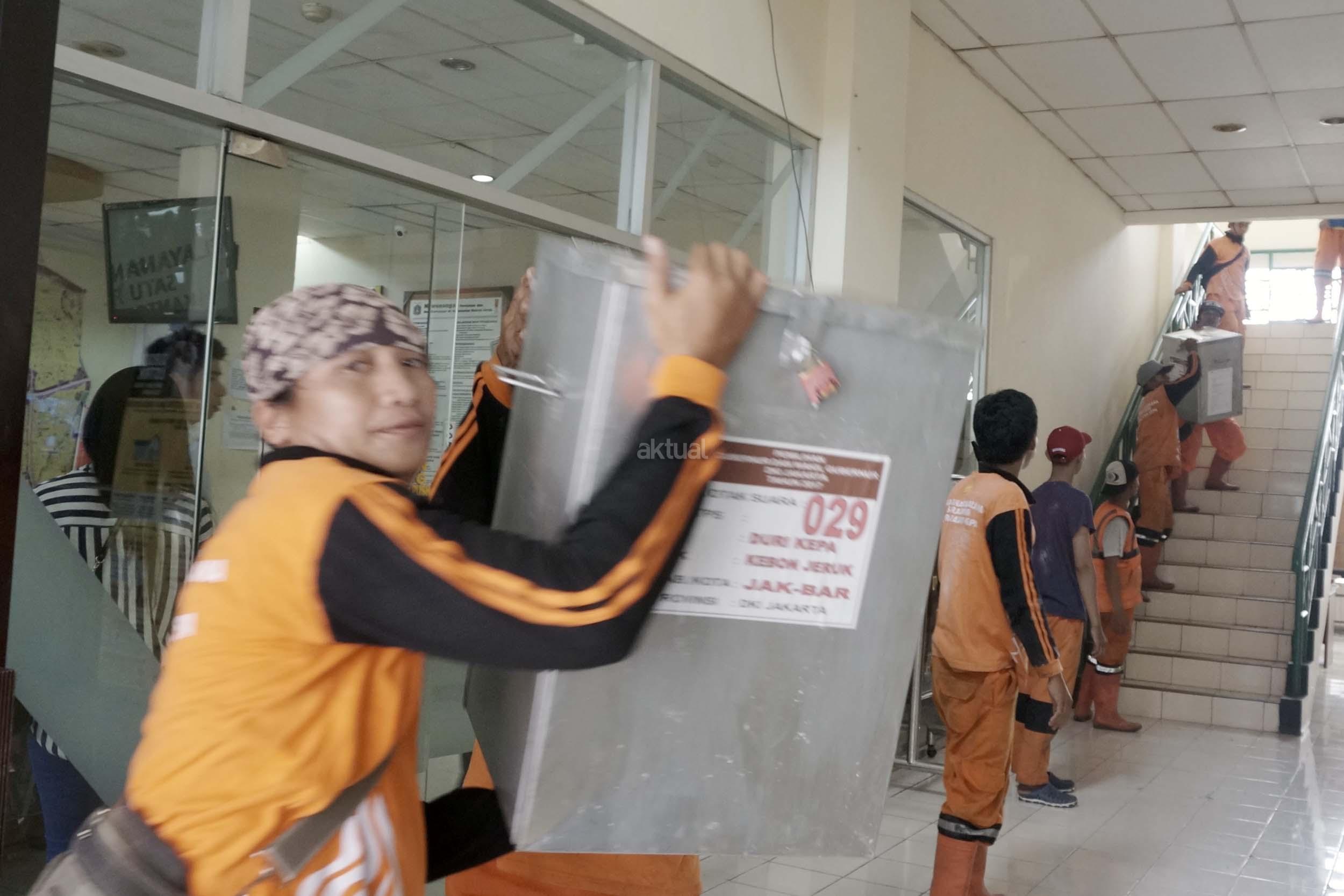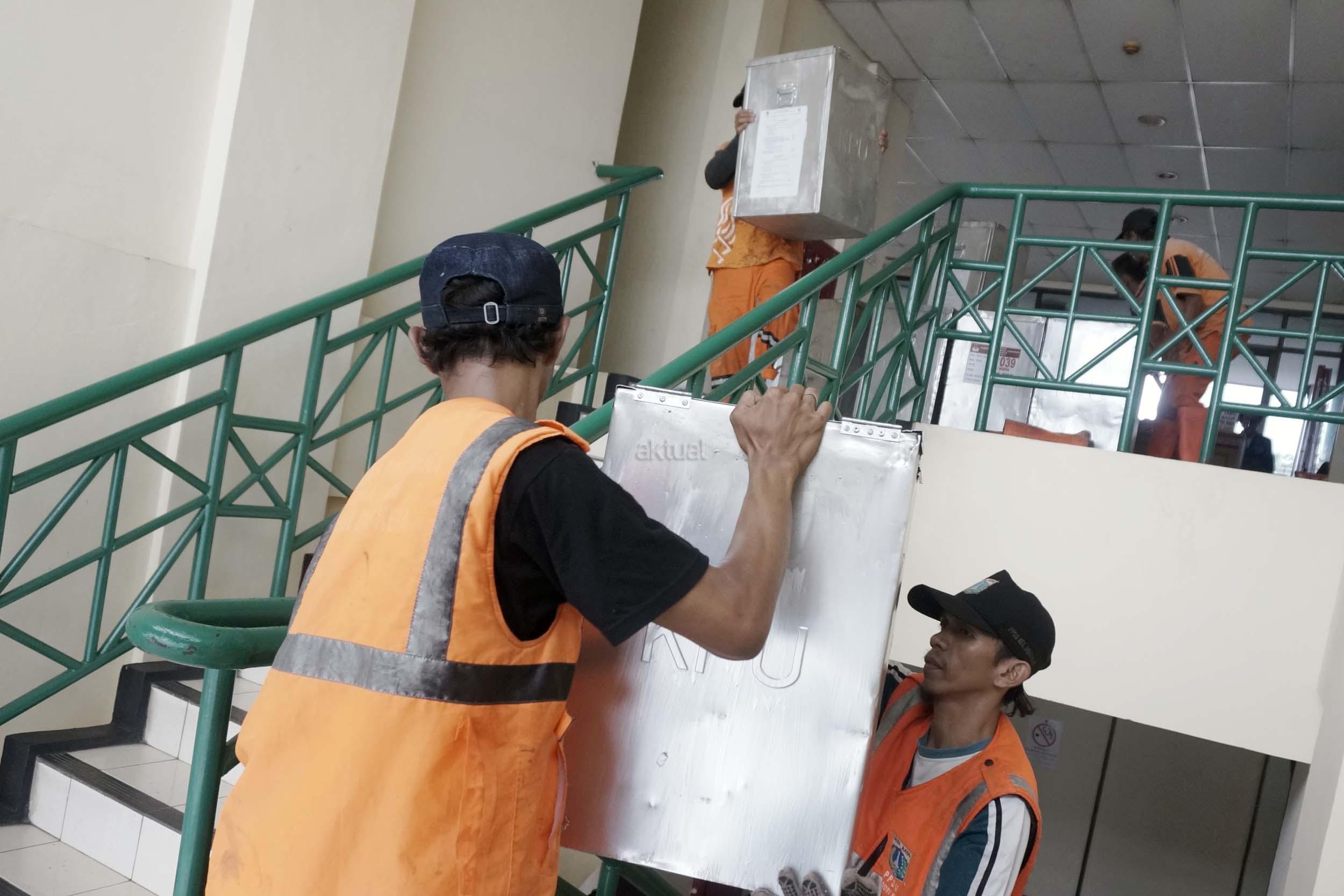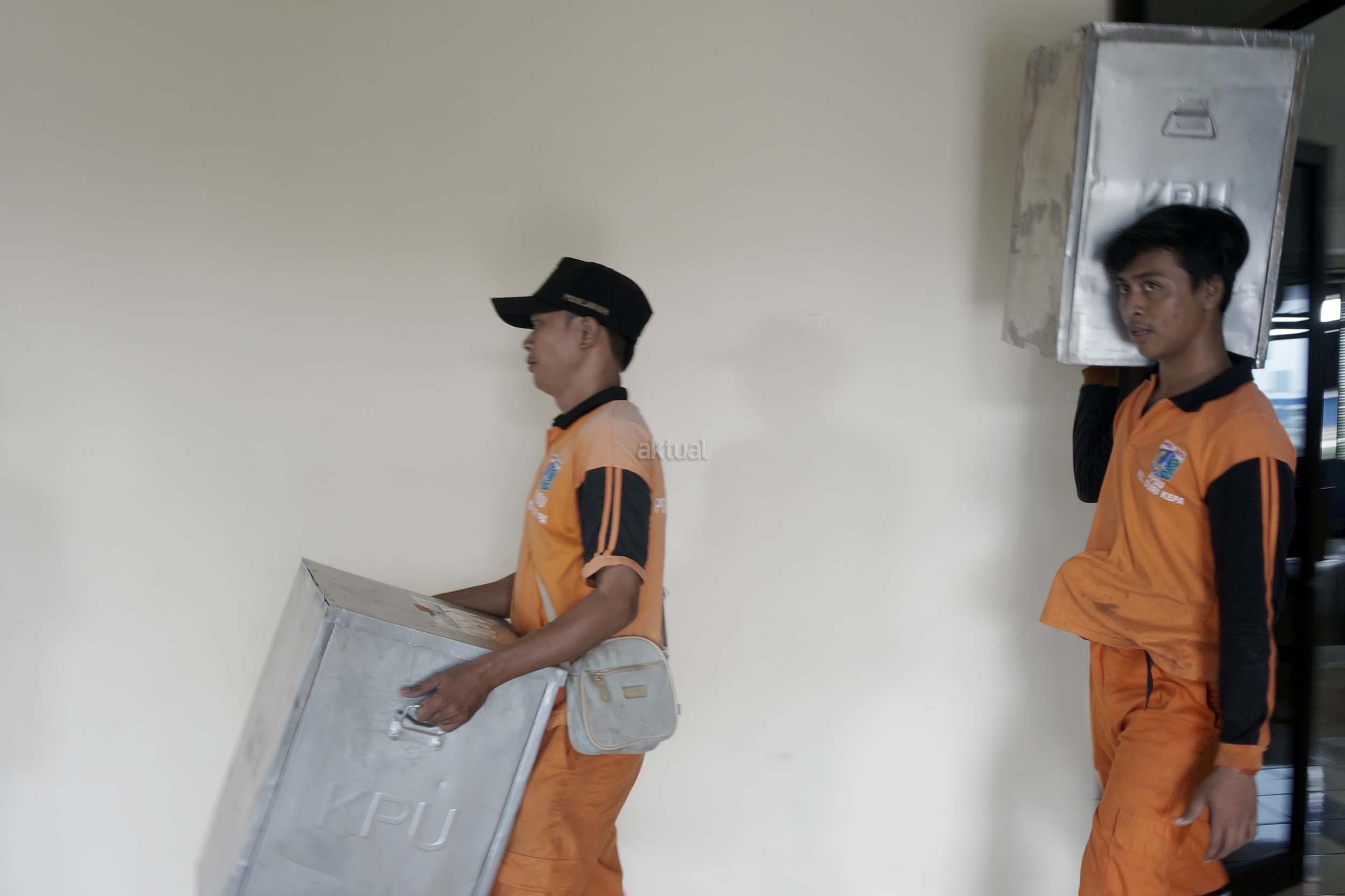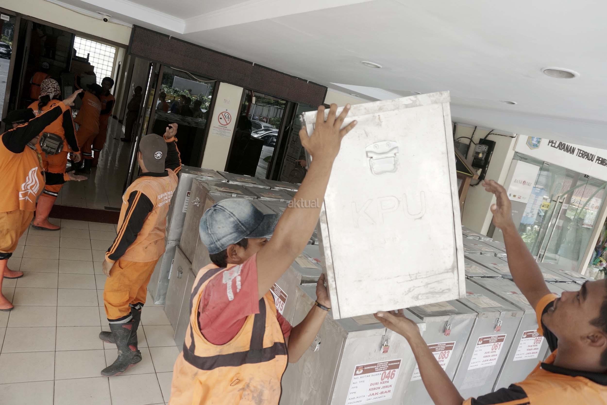 Sejumlah petugas kemacatan mengangkat Kotak Suara di kantor Kecamatan Kebon Jeruk, Jakarta Barat, Senin (13/2/2017). Jumlah kotak suara di Kecamatan Kebon Jeruk, Jakarta Barat yang akan digunakan pada pencoblosan 15 Februari mendatang berjumlah 436 buah. Aktual.com/Munzir.
