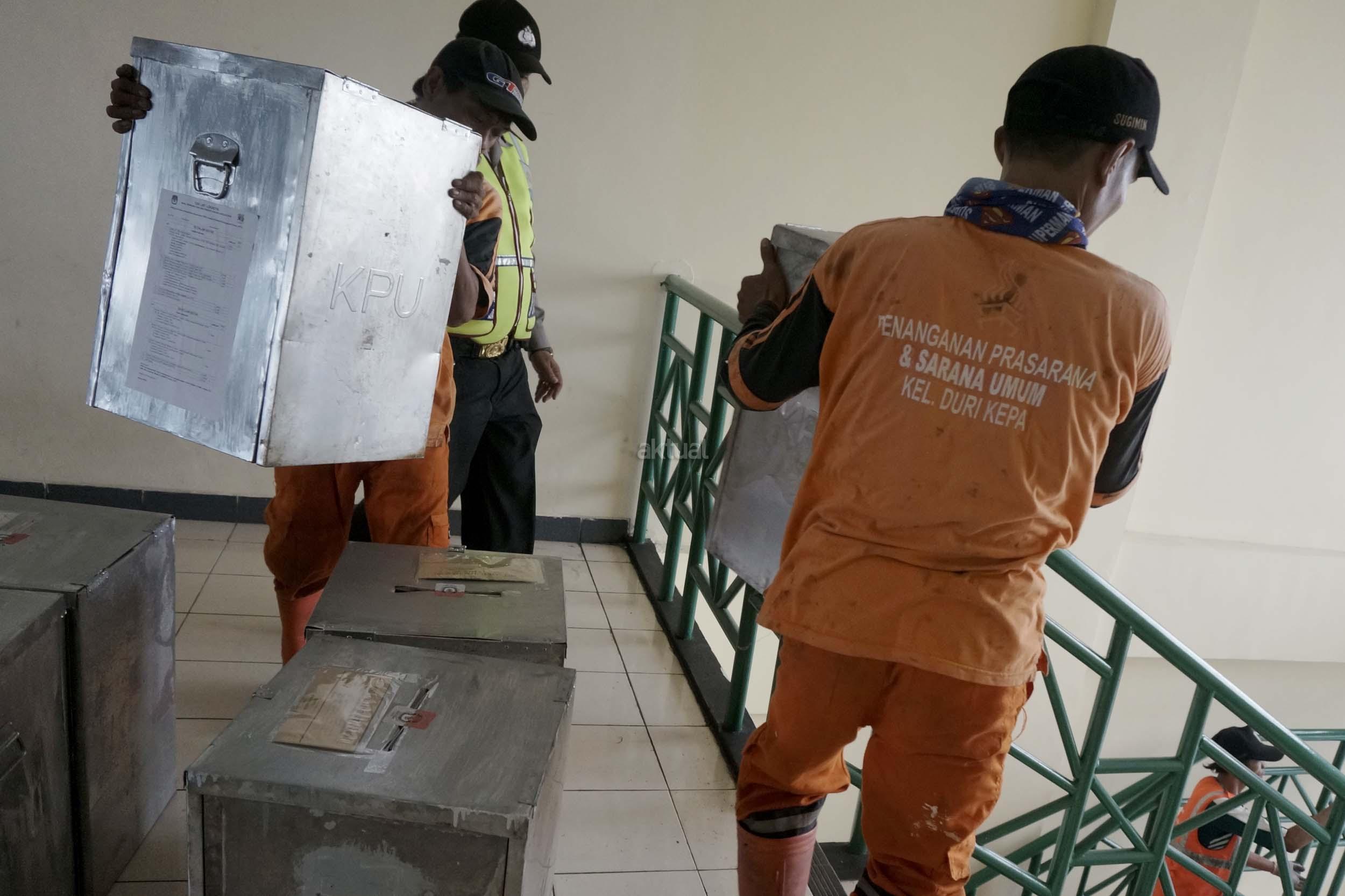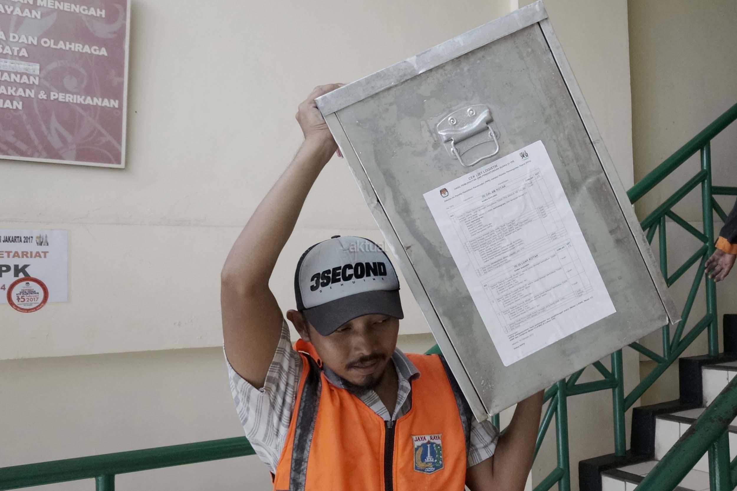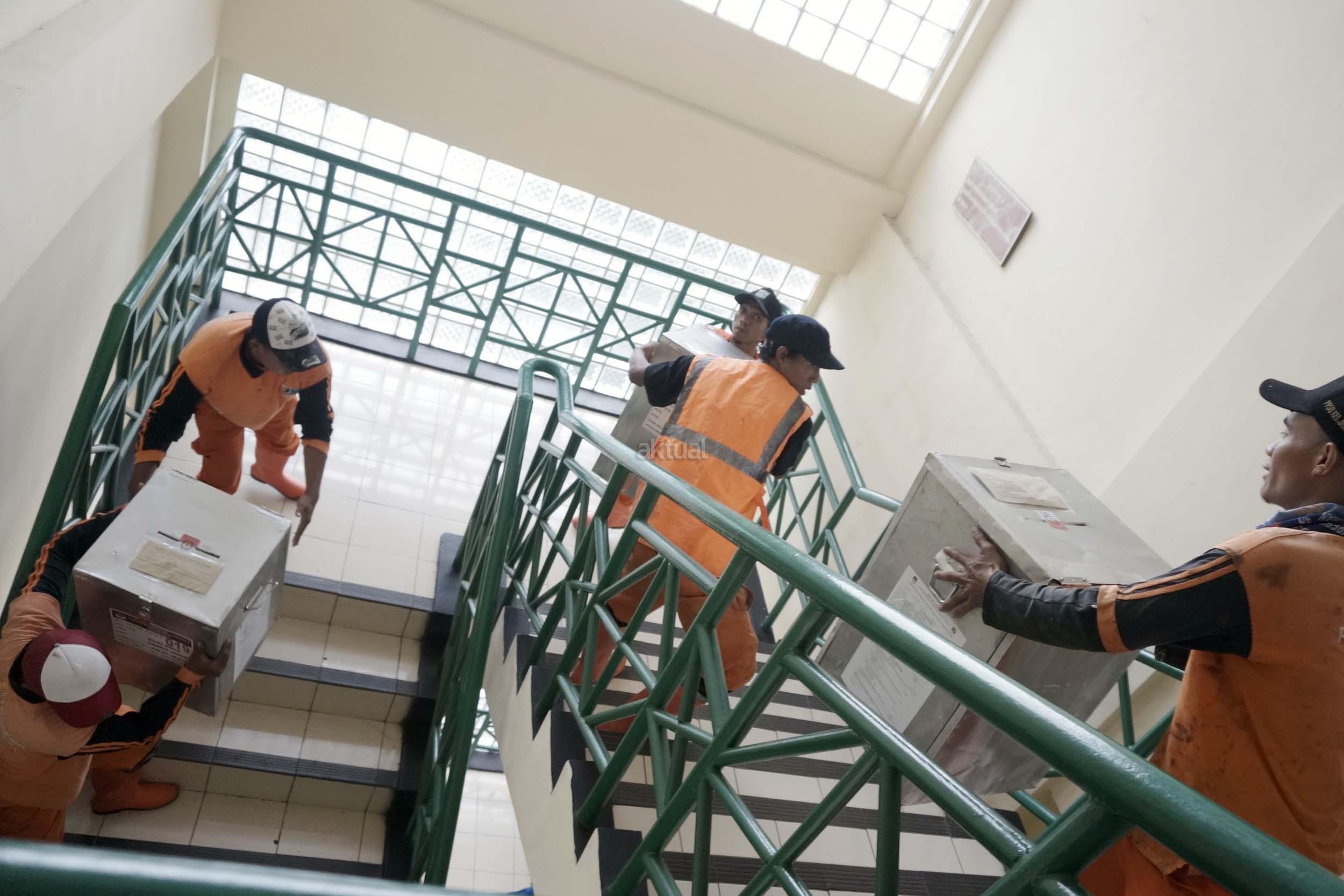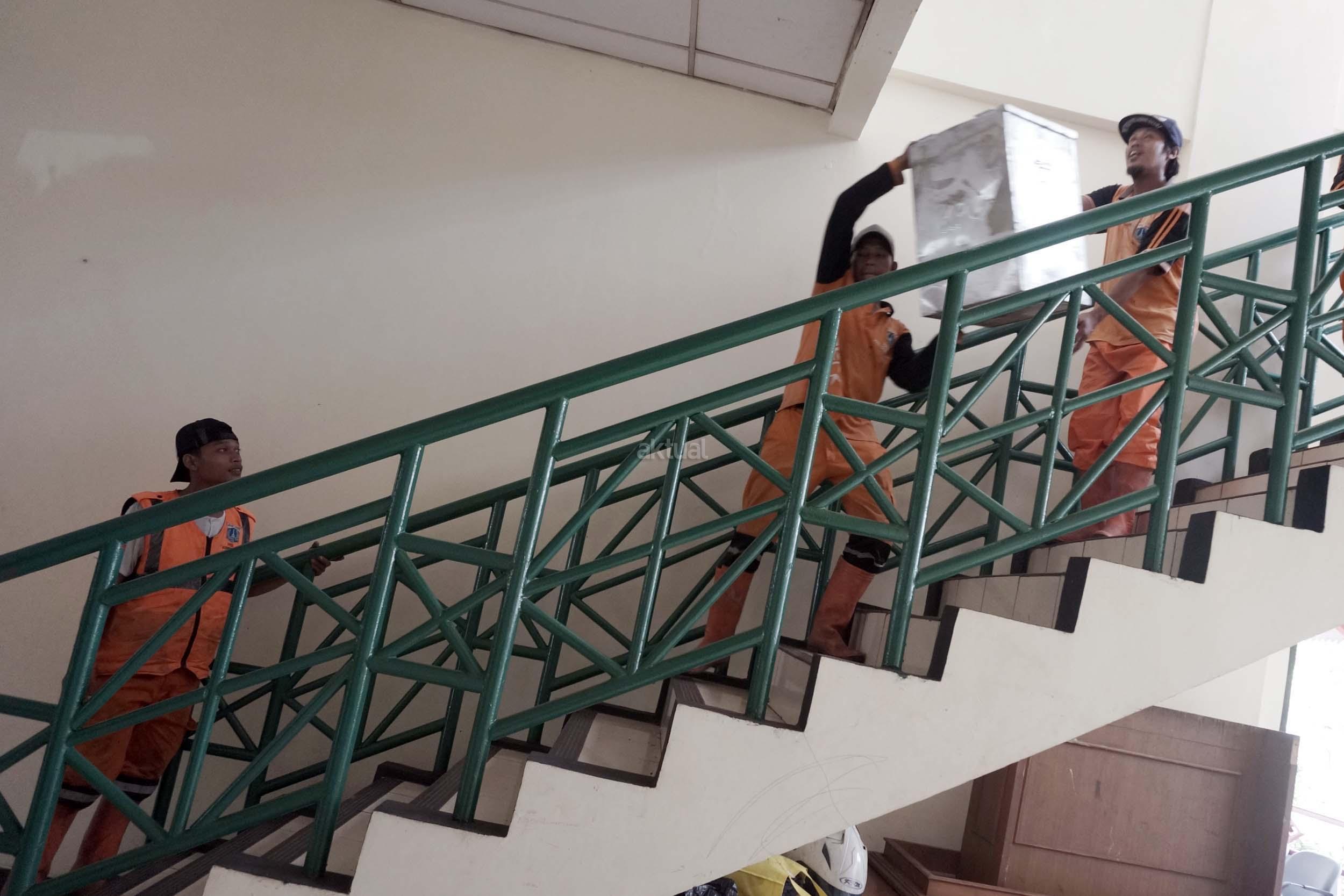 Sejumlah petugas kemacatan mengangkat Kotak Suara di kantor Kecamatan Kebon Jeruk, Jakarta Barat, Senin (13/2/2017). Jumlah kotak suara di Kecamatan Kebon Jeruk, Jakarta Barat yang akan digunakan pada pencoblosan 15 Februari mendatang berjumlah 436 buah. Aktual.com/Munzir.