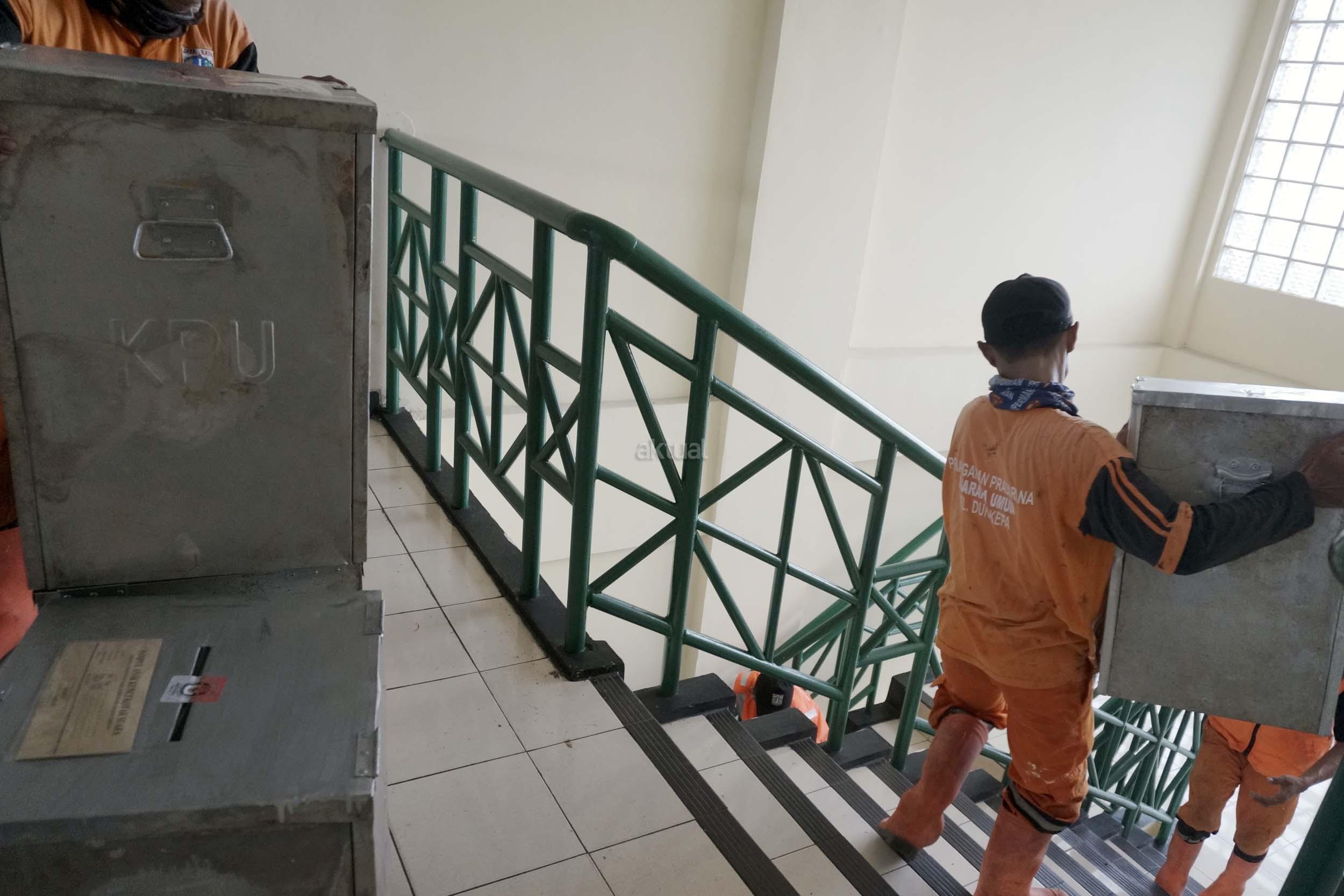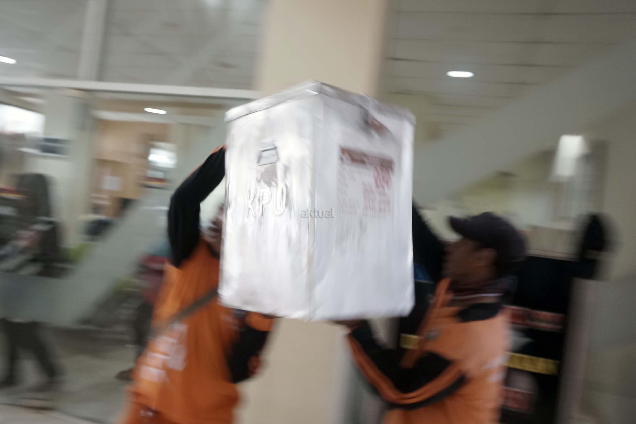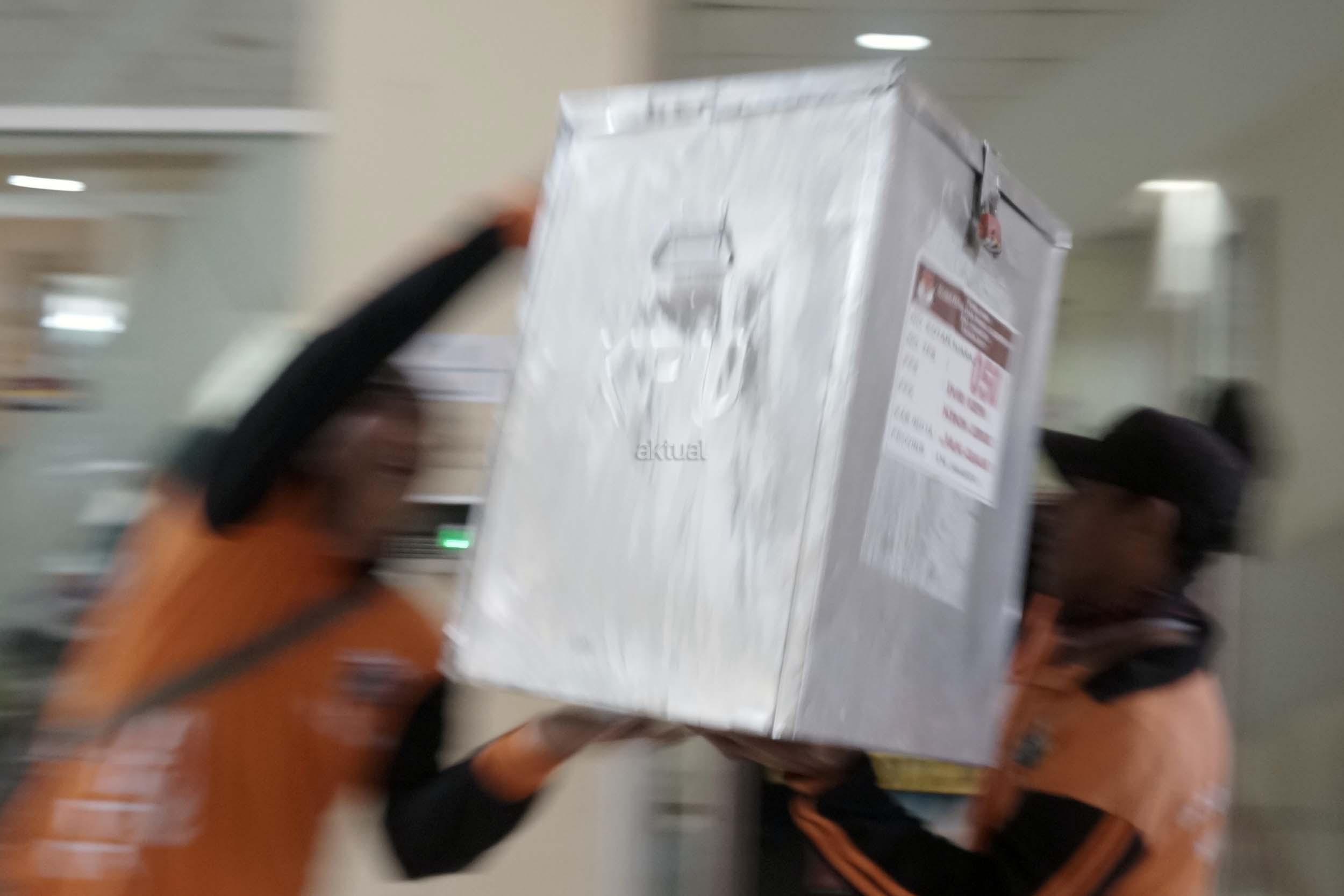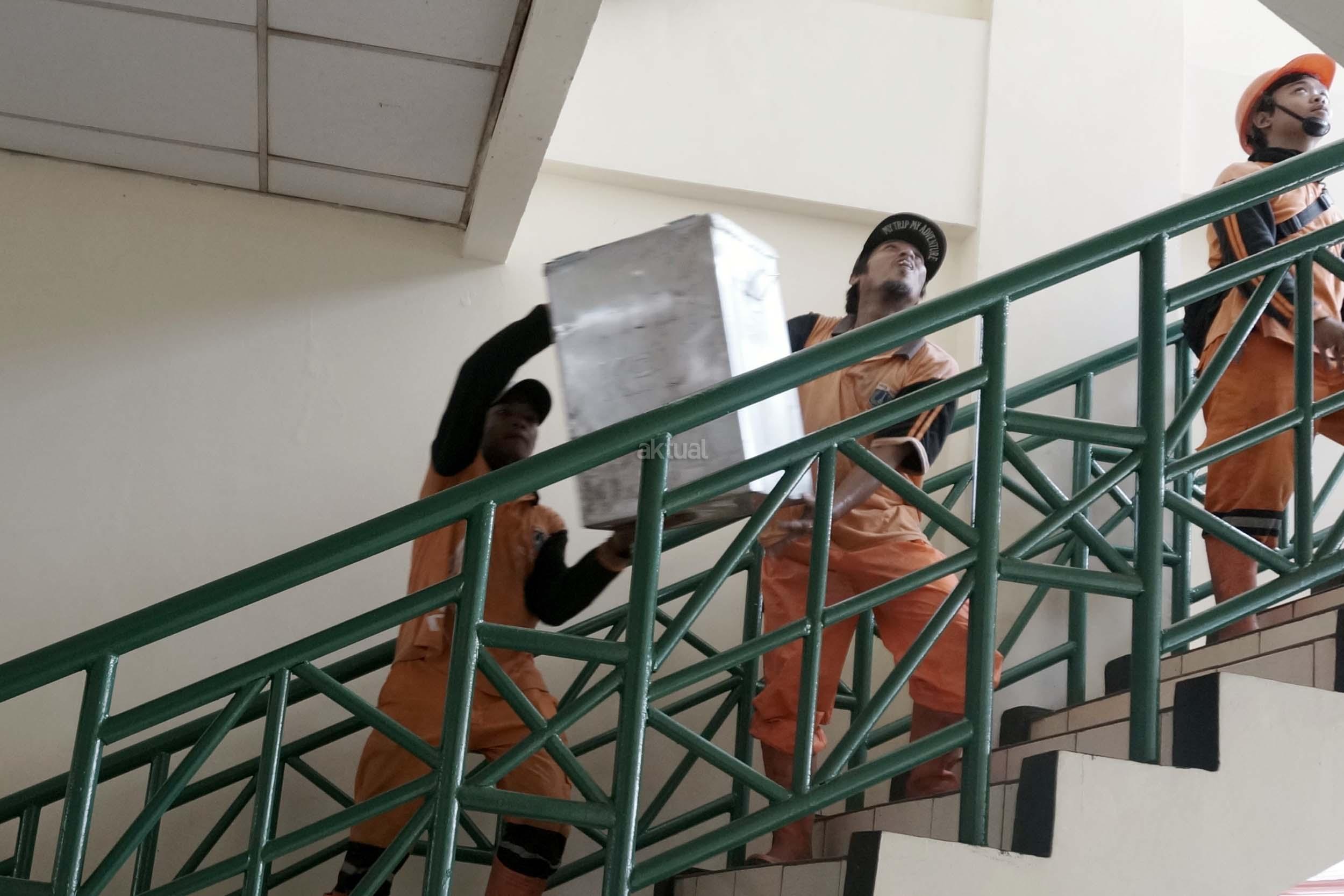 Sejumlah petugas kemacatan mengangkat Kotak Suara di kantor Kecamatan Kebon Jeruk, Jakarta Barat, Senin (13/2/2017). Jumlah kotak suara di Kecamatan Kebon Jeruk, Jakarta Barat yang akan digunakan pada pencoblosan 15 Februari mendatang berjumlah 436 buah. Aktual.com/Munzir.