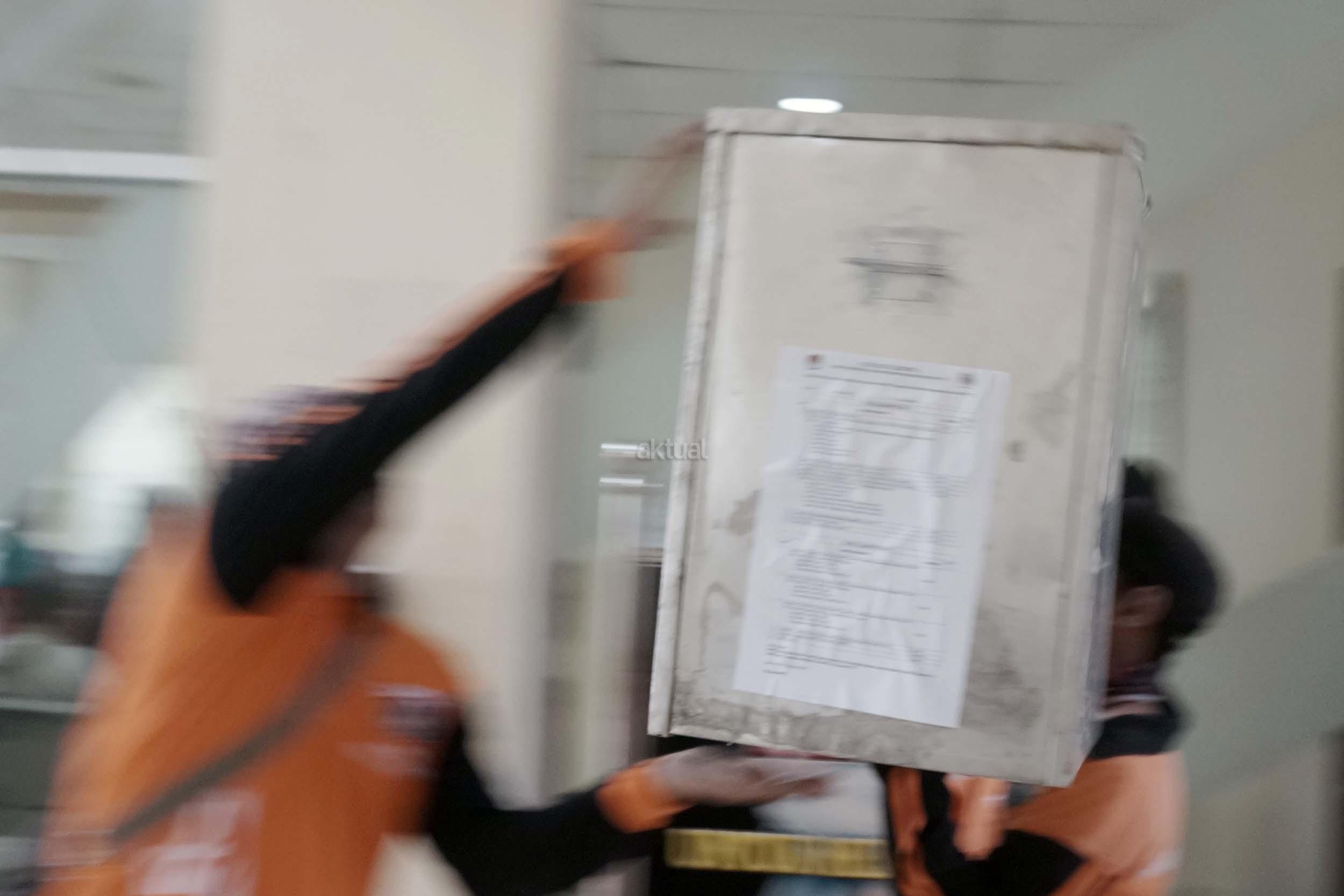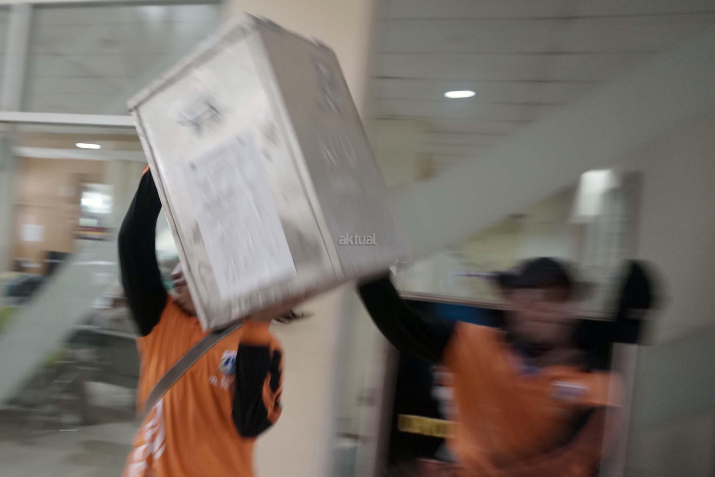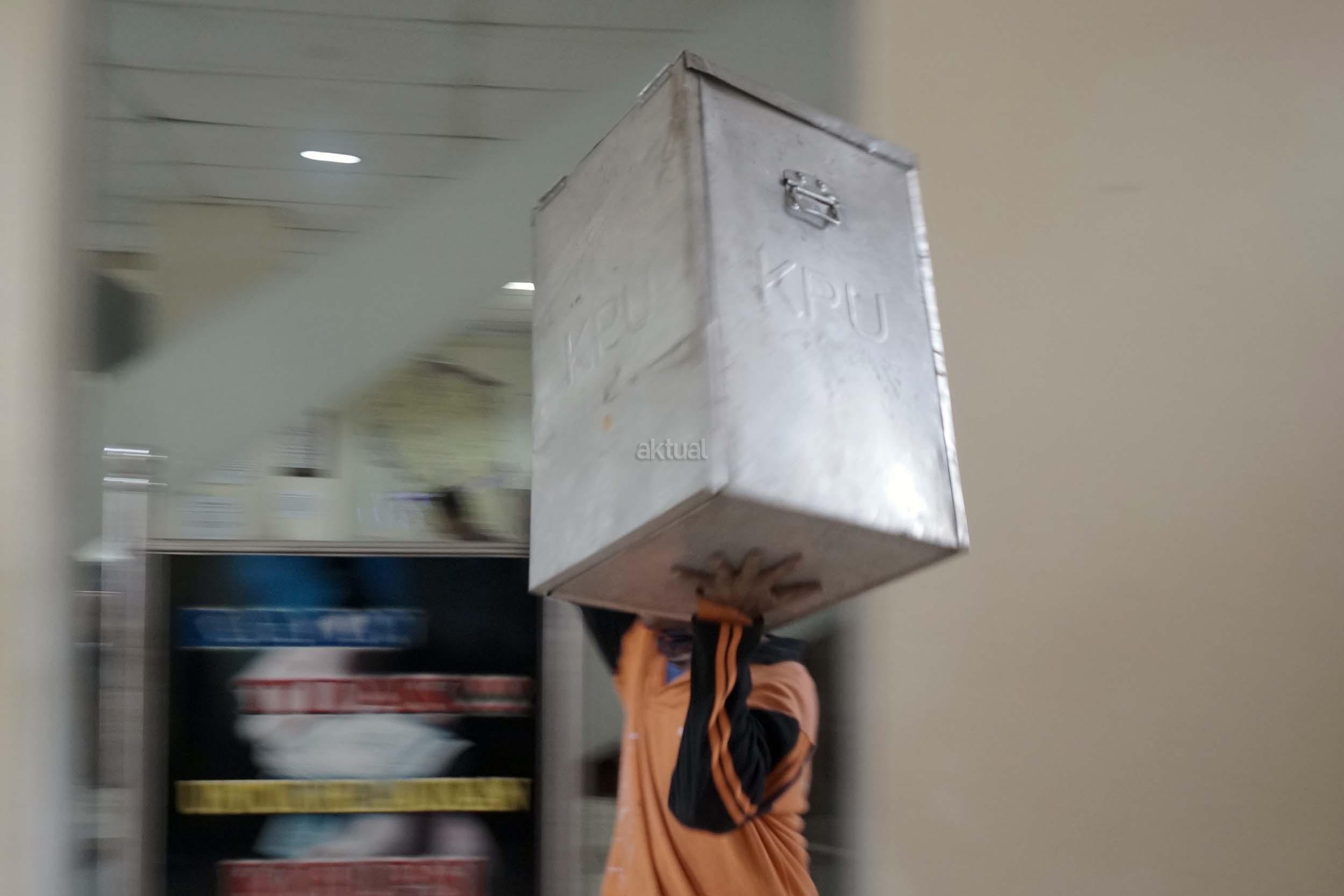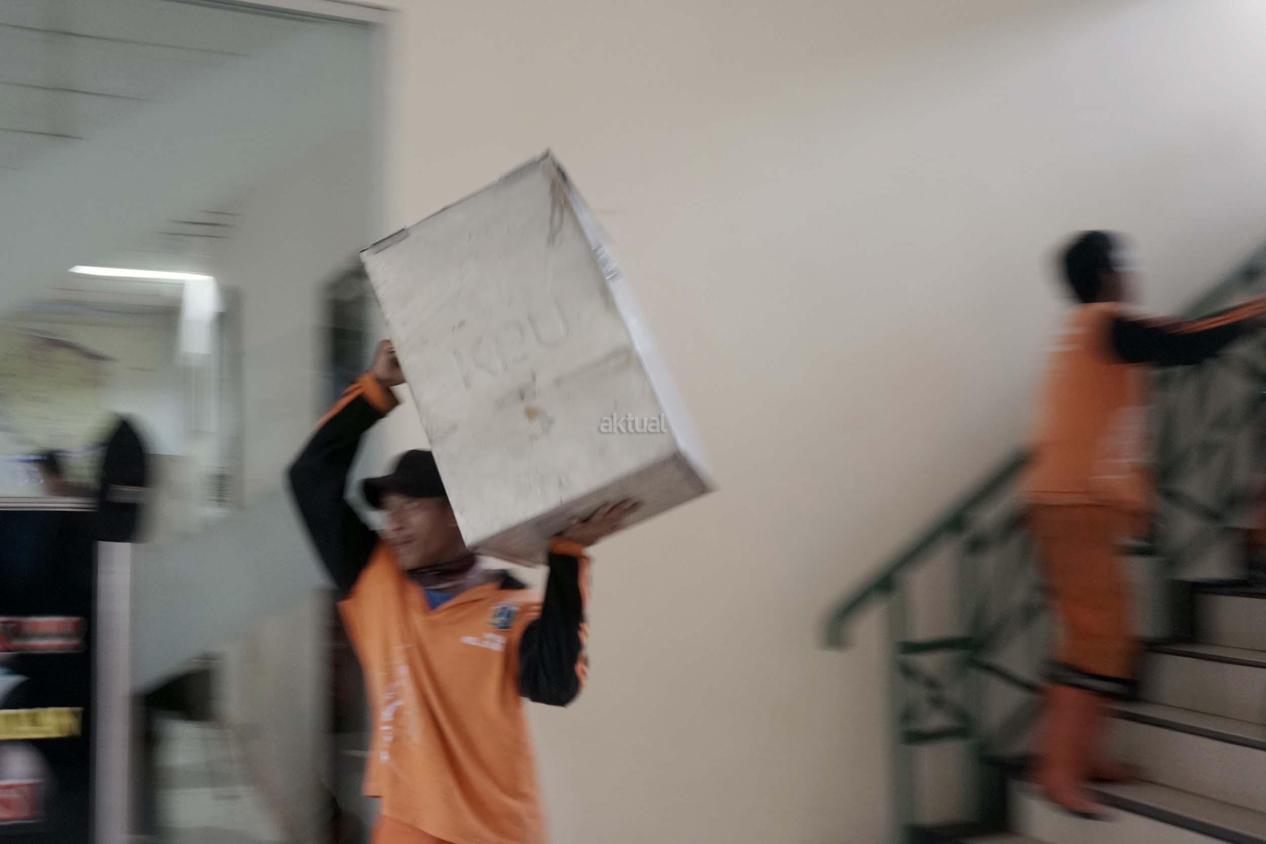Sejumlah petugas kemacatan mengangkat Kotak Suara di kantor Kecamatan Kebon Jeruk, Jakarta Barat, Senin (13/2/2017). Jumlah kotak suara di Kecamatan Kebon Jeruk, Jakarta Barat yang akan digunakan pada pencoblosan 15 Februari mendatang berjumlah 436 buah. Aktual.com/Munzir.