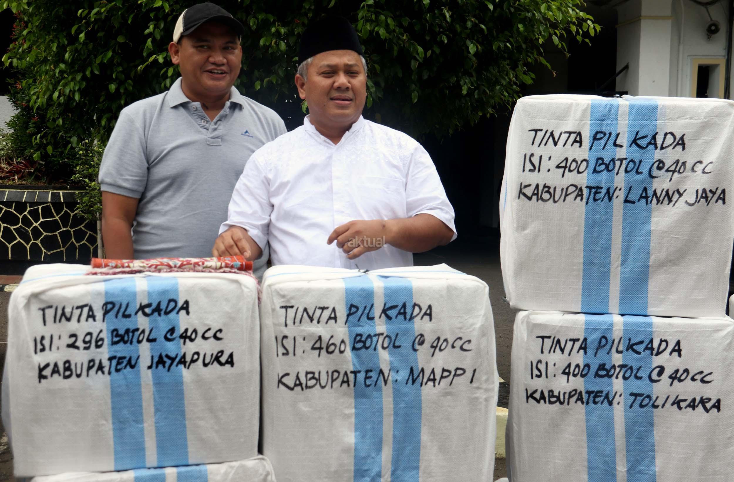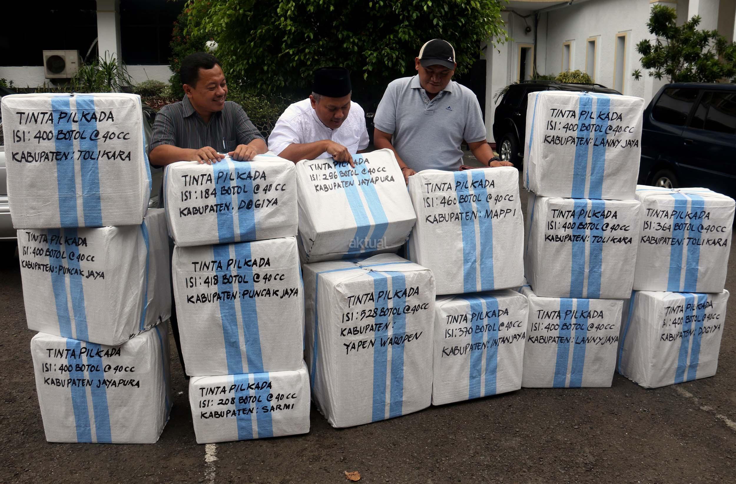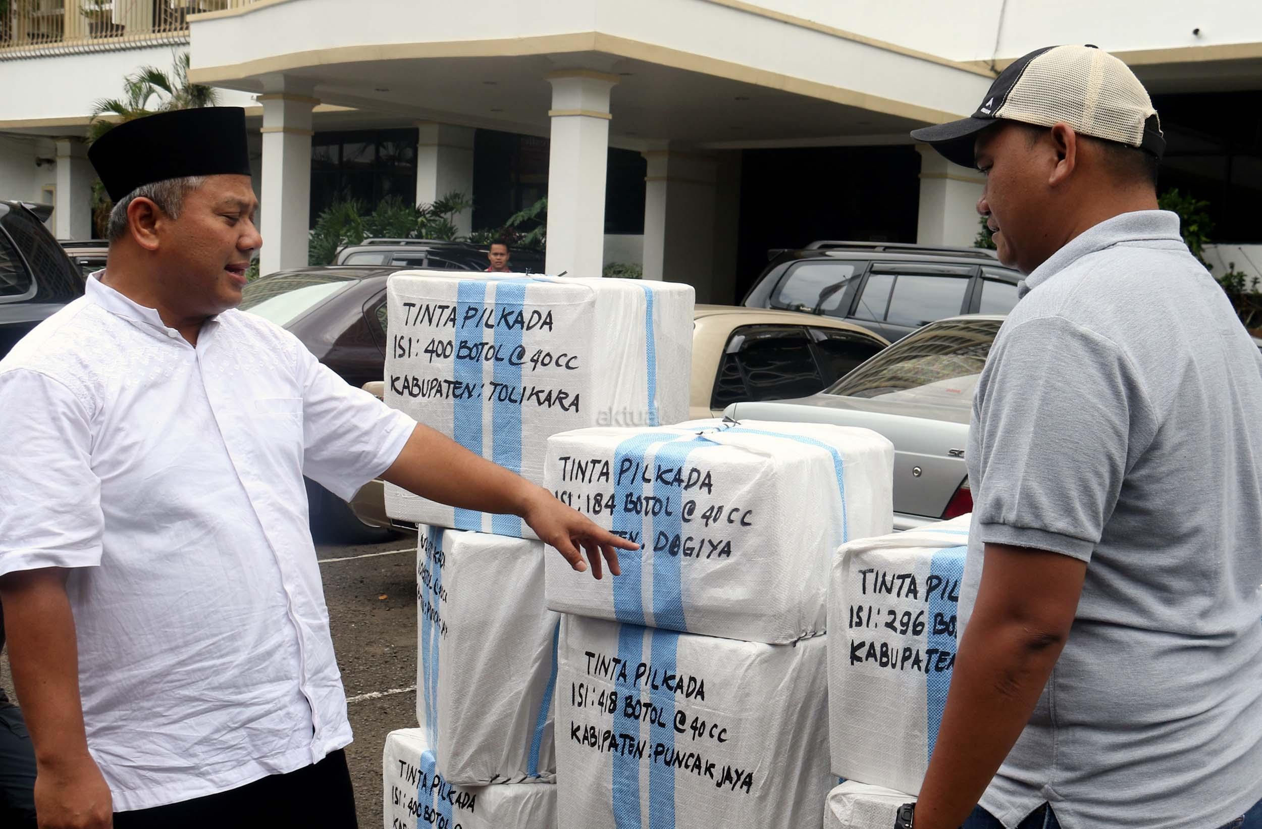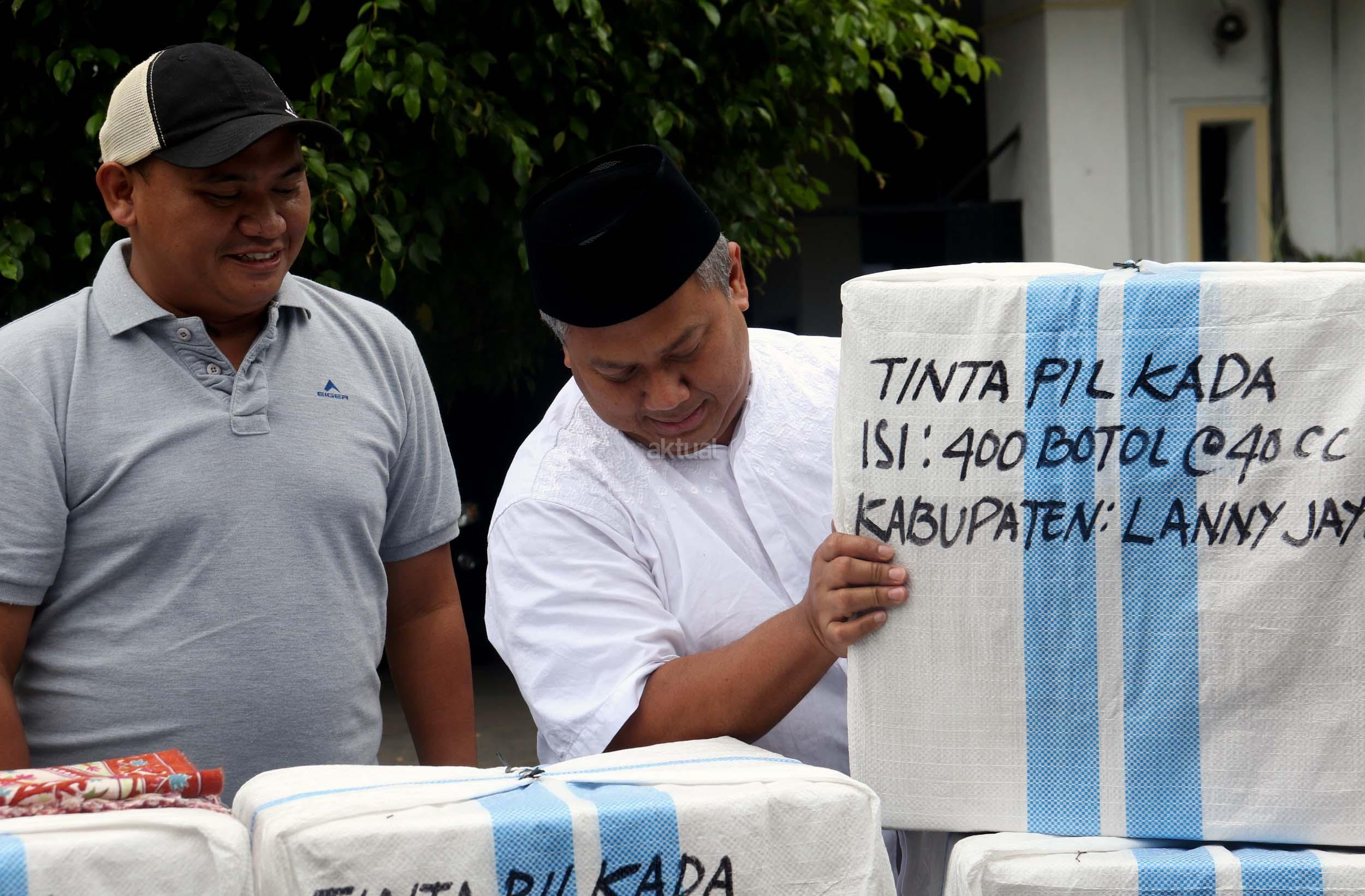 Komisioner KPU Arief Budiman (kiri) bersama Kepala Subbagian Logistik KPU Provinsi Papua Abdul Azis Noch (kanan) mengecek pengiriman tinta Pilkada Provinsi Papua di KPU, Jakarta, Jumat (13/1/2017). Perbedaan letak geografis di berbagai wilayah Indonesia dan untuk mensukses Pilkada serentak 2017, KPU mulai melakukan pengiriman logistik lebih awal untuk wilayah pegunungan.