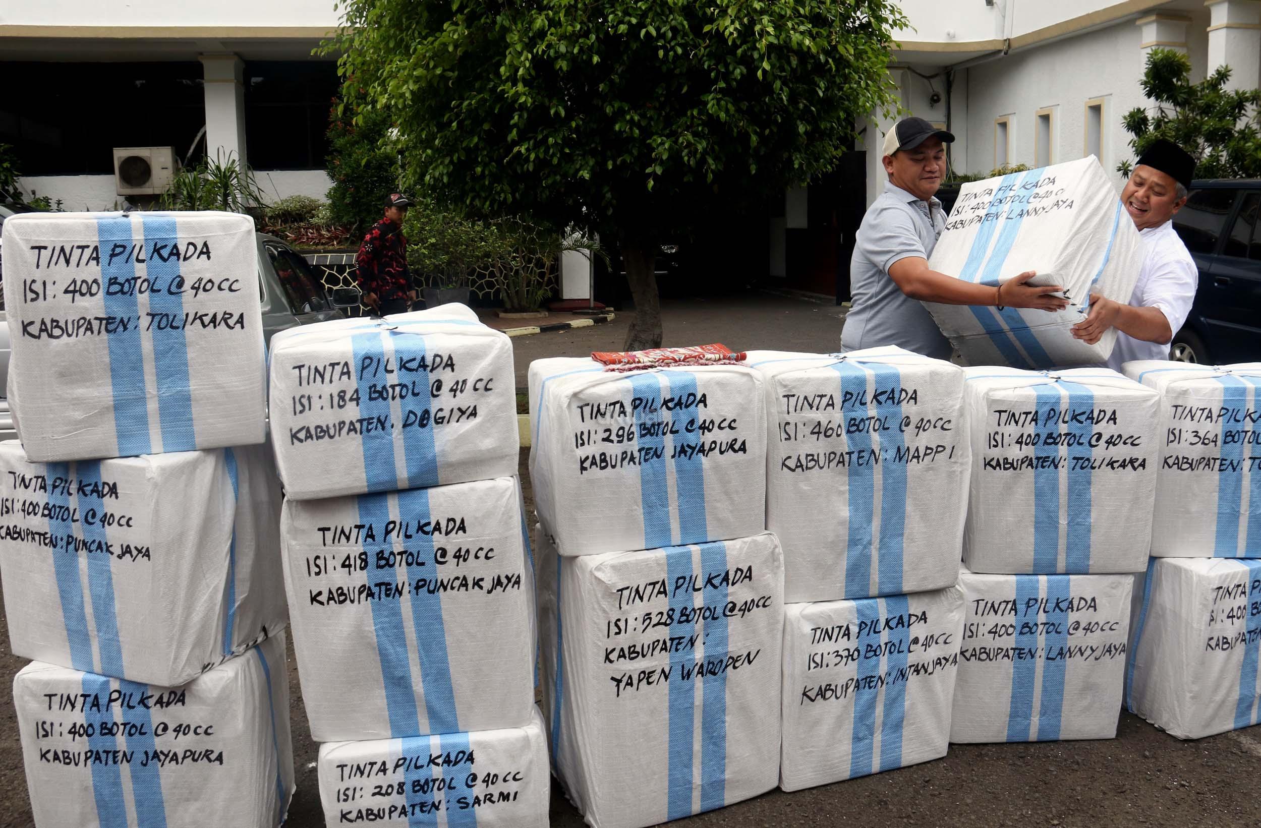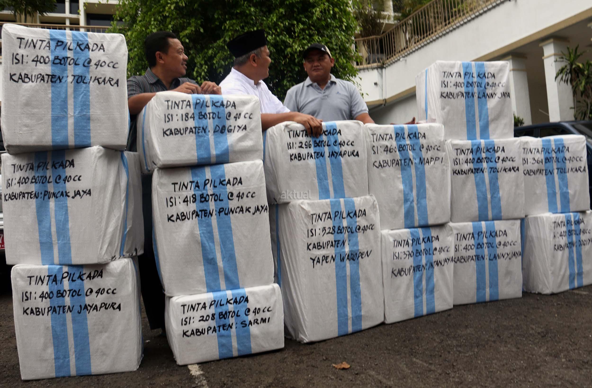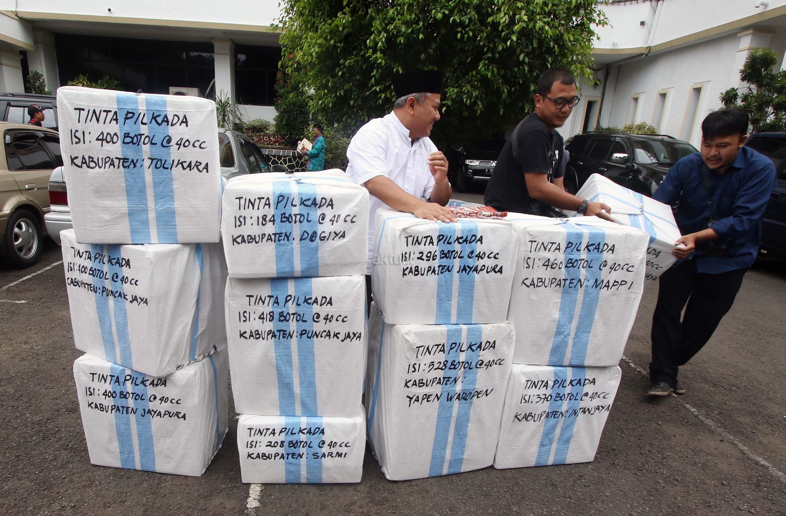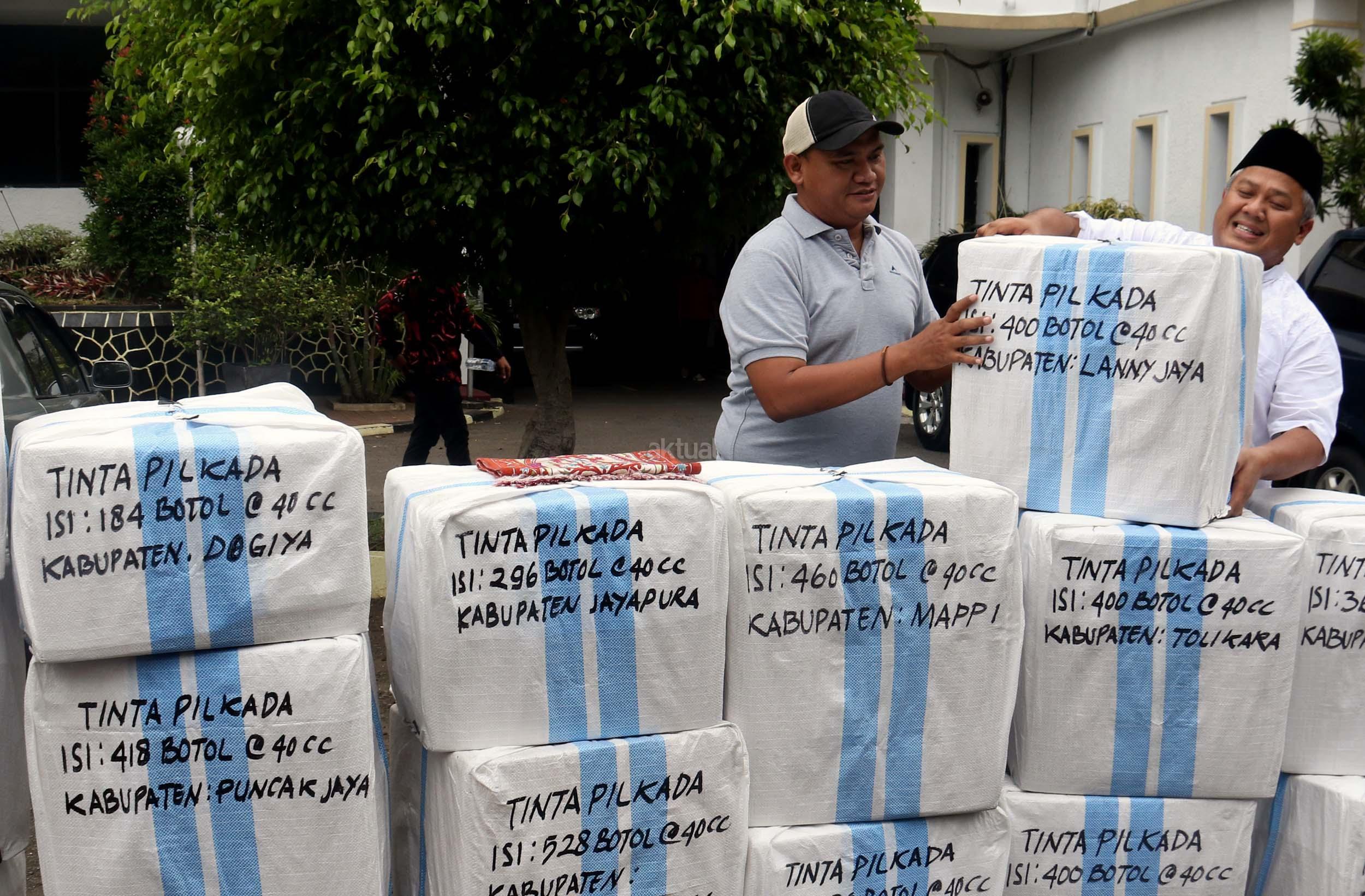 Komisioner KPU Arief Budiman (kiri) bersama Kepala Subbagian Logistik KPU Provinsi Papua Abdul Azis Noch (kanan) mengecek pengiriman tinta Pilkada Provinsi Papua di KPU, Jakarta, Jumat (13/1/2017). Perbedaan letak geografis di berbagai wilayah Indonesia dan untuk mensukses Pilkada serentak 2017, KPU mulai melakukan pengiriman logistik lebih awal untuk wilayah pegunungan.